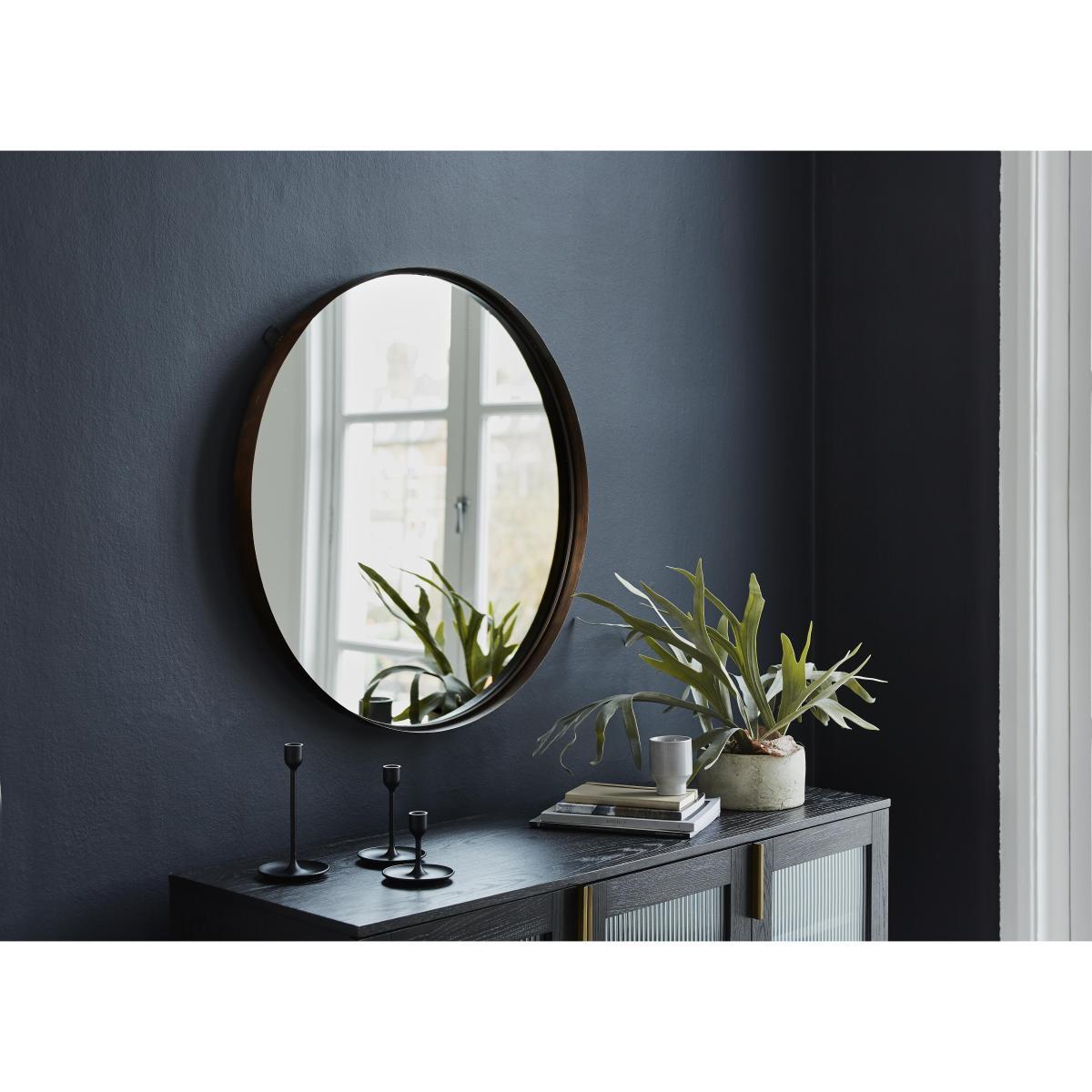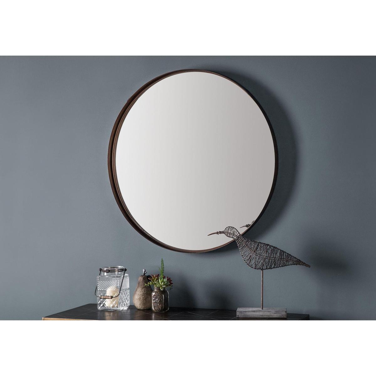 Sleek and contemporary, our circular Oriel Mirror is beautifully simple, with a narrow aged-bronze finish that adds warmth and style to any interior. Round mirror with simple frame is modern and stylish. Slim metal frame has an aged bronze finish. Large scale. Minimal contemporary style is perfect for a feature wall. Fits perfectly in any room – even the bathroom. Dimensions. Width: 84cm (33 inches). Height: 84cm (33 inches).