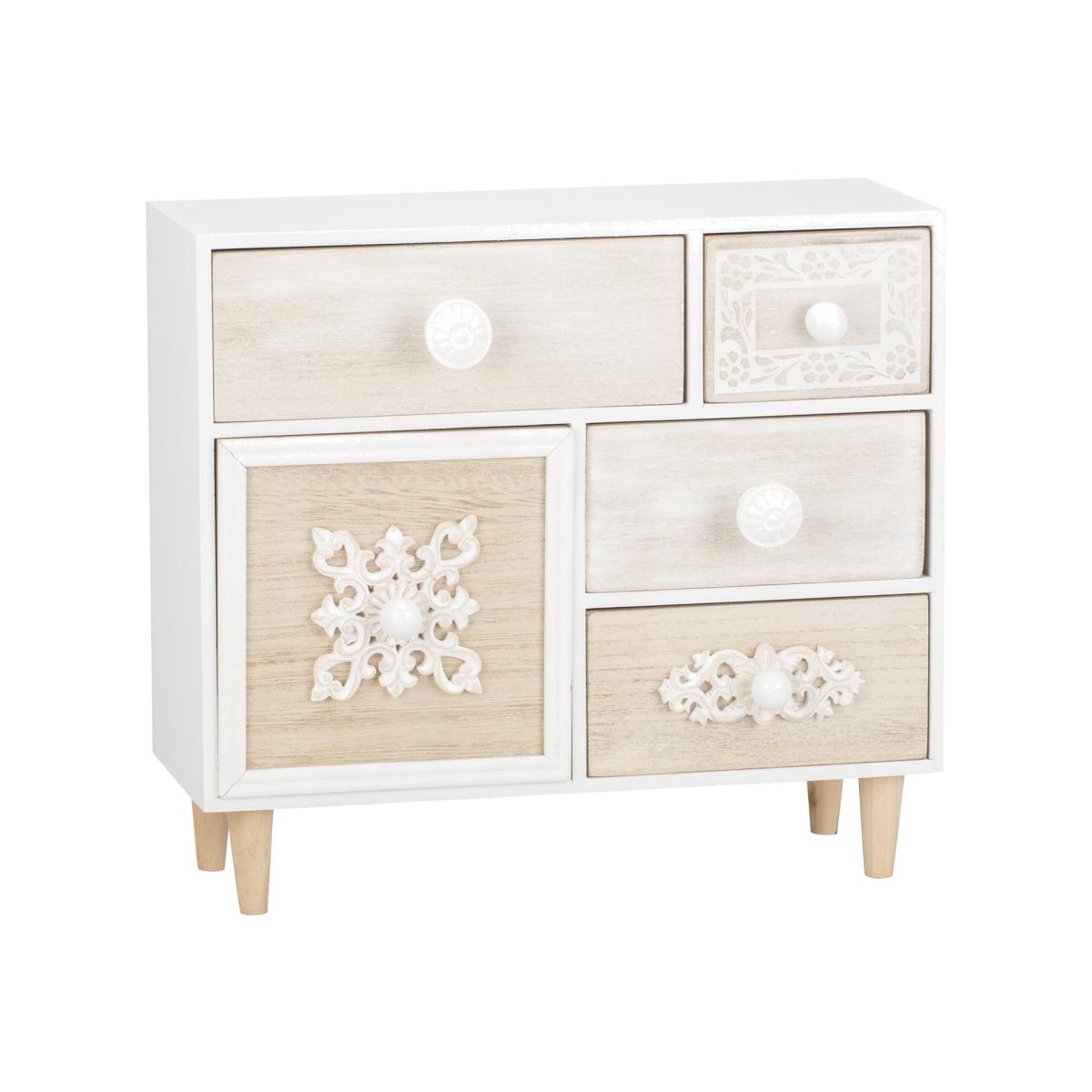 Taking influences from elements of shabby chic and Scandi styles, this Oriental 5 Drawer Set is crafted with a beautiful blend of bare light wood and pure white detailing. Its five drawers vary in size and shape and can be used to store a variety of bits and bobs from jewellery to crafting accessories.
