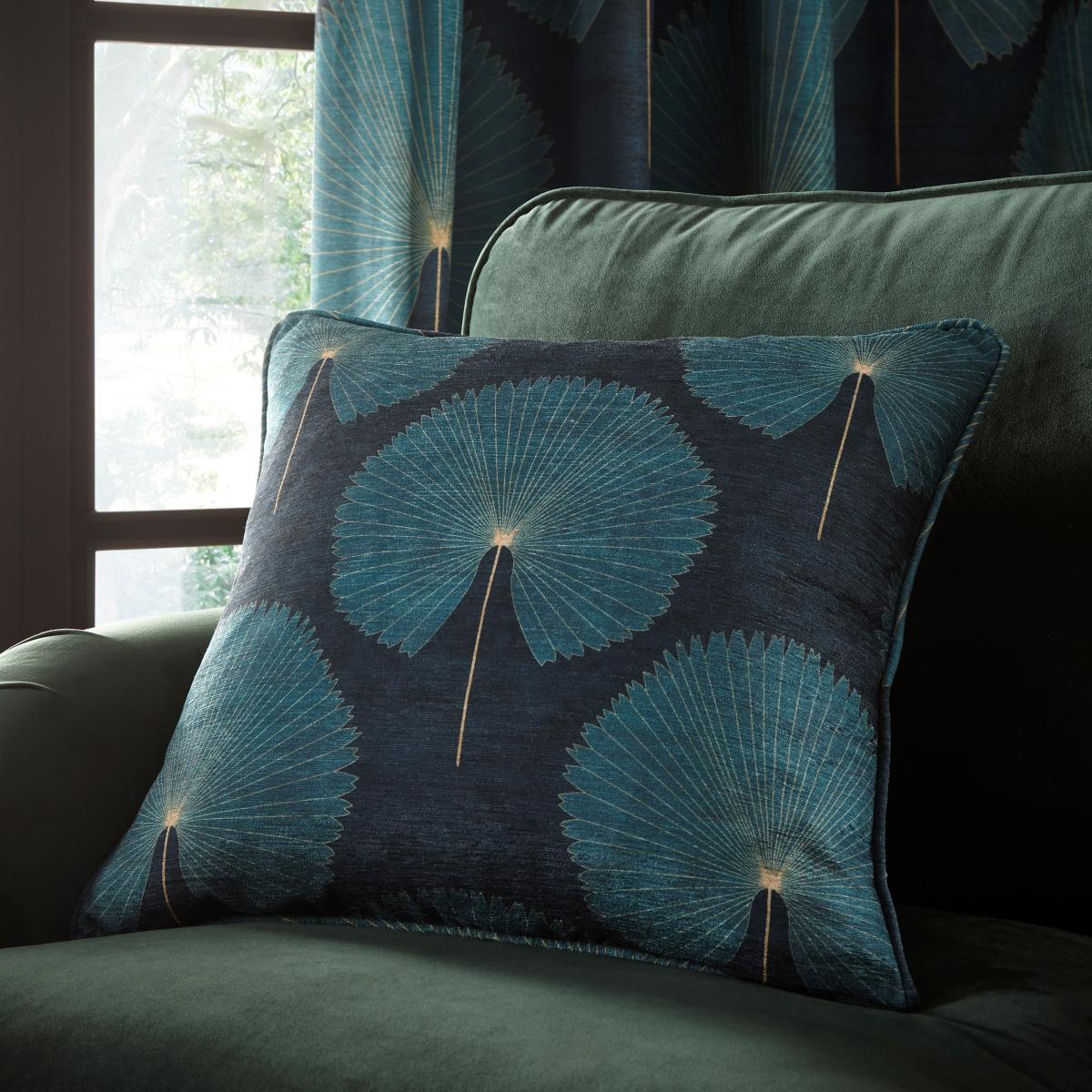 With a rich bottle green colourway, this cushion features a geometric oriental fan design which will add an elegant touch into your home. This cushion comes complete with an flat filling for your comfort and has been finished with a piped edge. Matching curtains available in range of sizes to create a coordinated look.