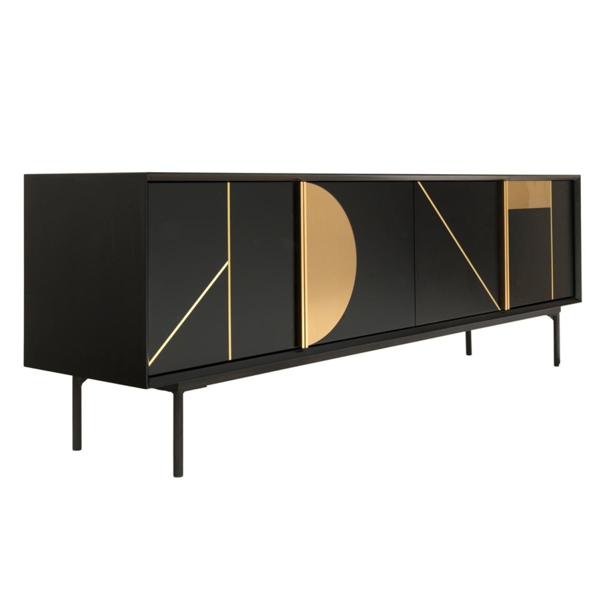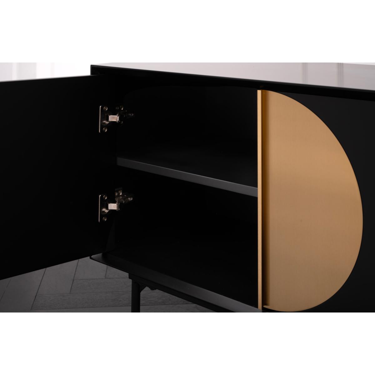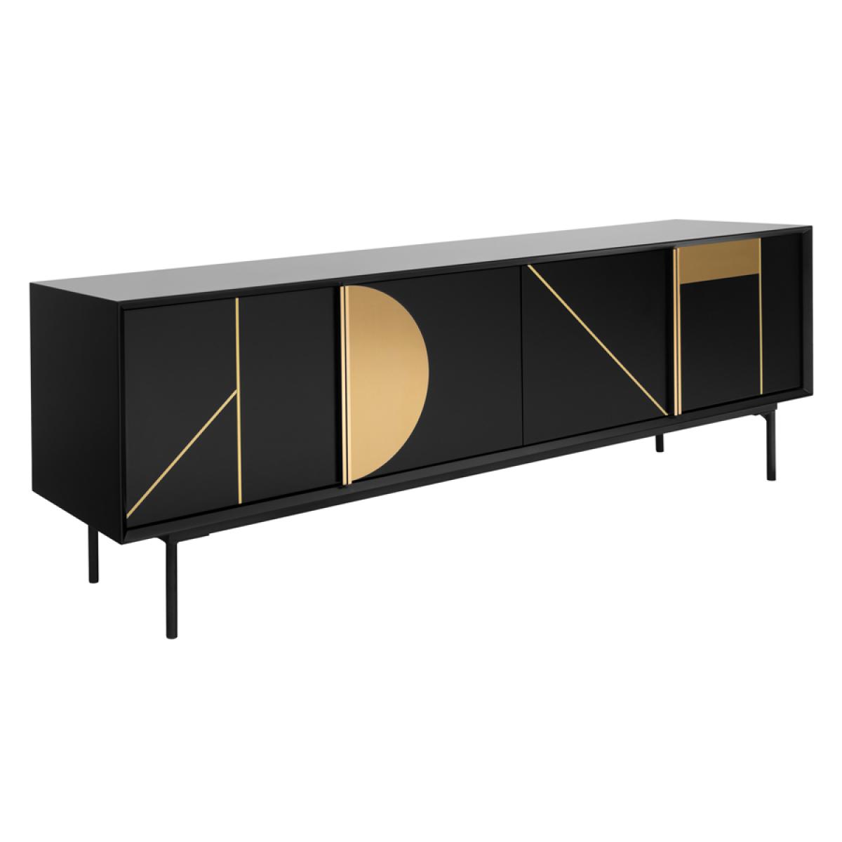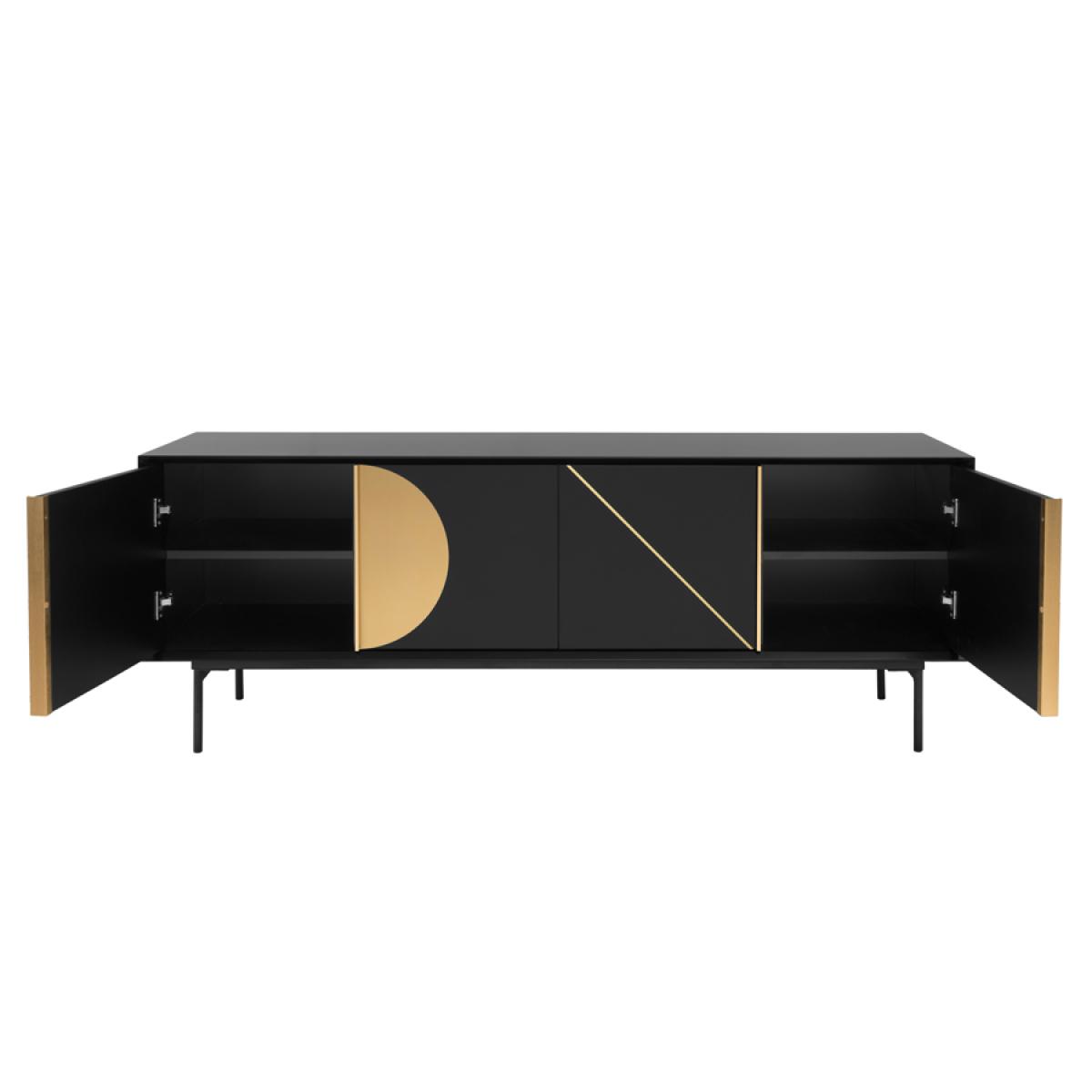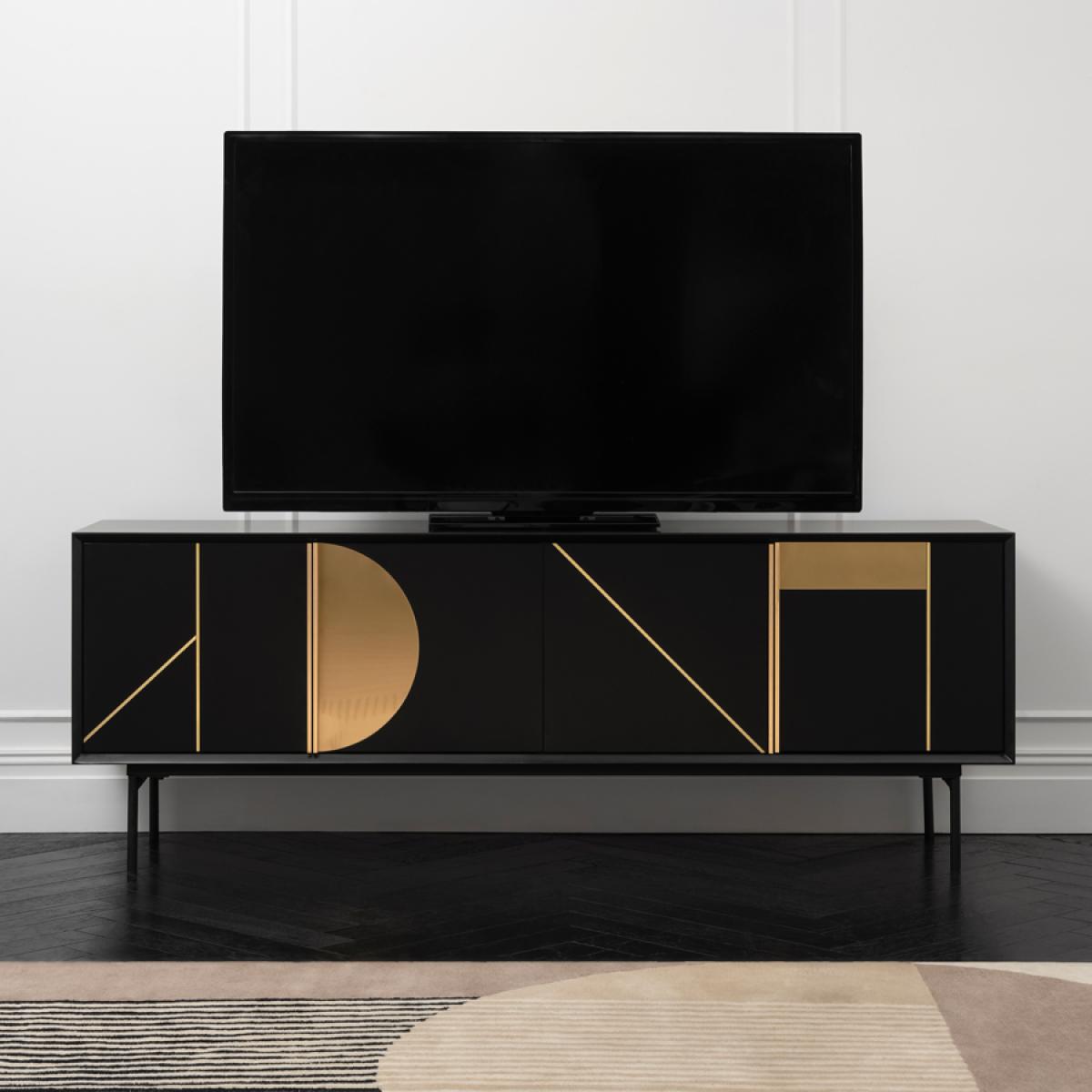 Large contemporary media sideboard. Striking inlaid matt brass details. Durable black polyurethane paint finish to body, doors and shelves. Steel base with black powder-coated finish. Four doors with sleek matt brass handles. Two fixed internal shelves. Two cable ports to the rear, for routing media equipment. Will fit televisions with screens of up to 75”.