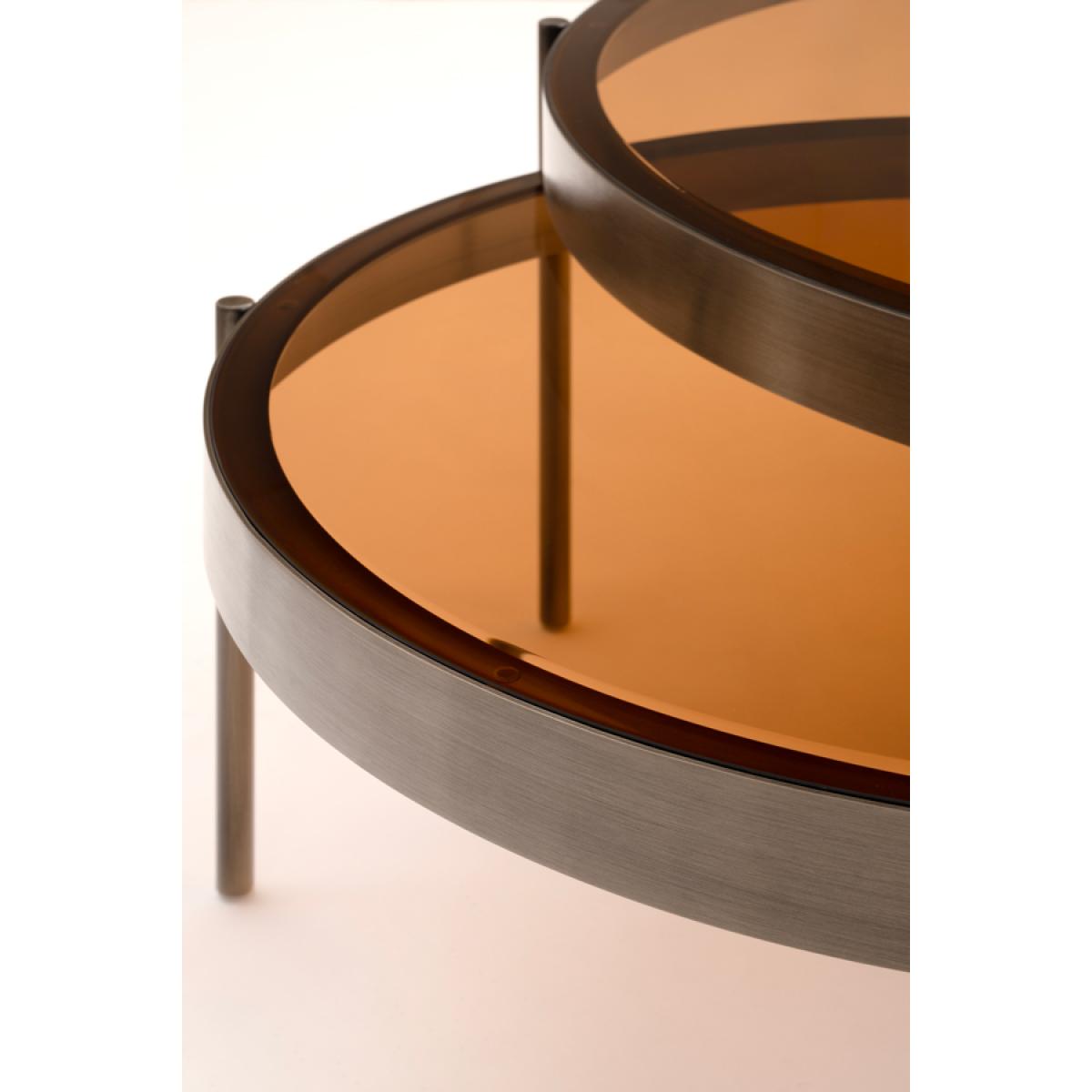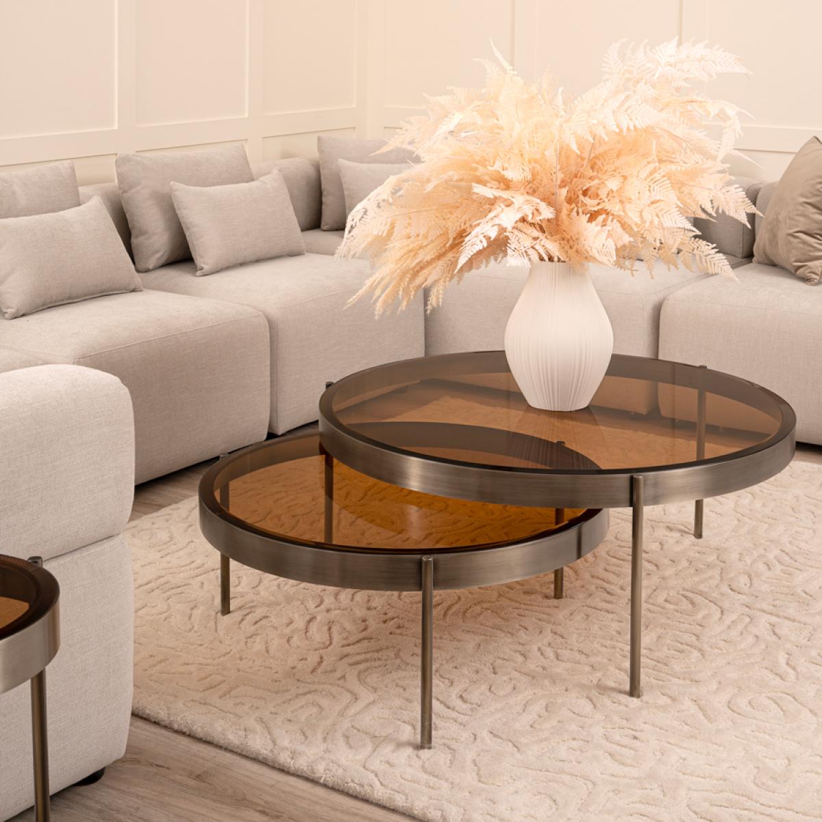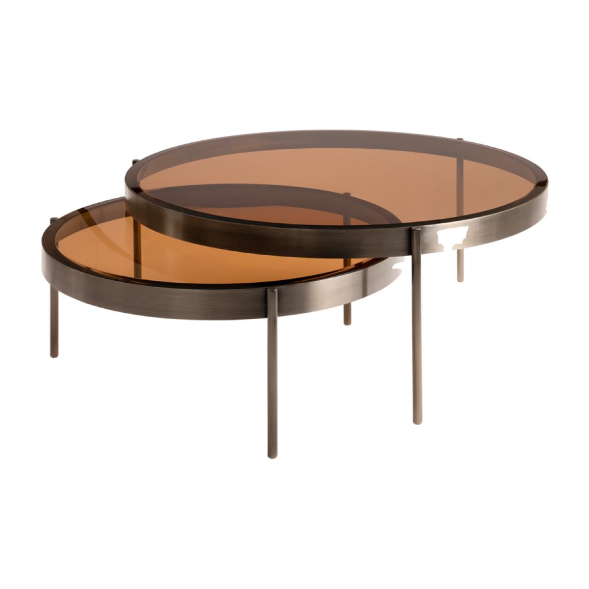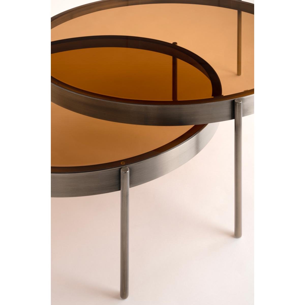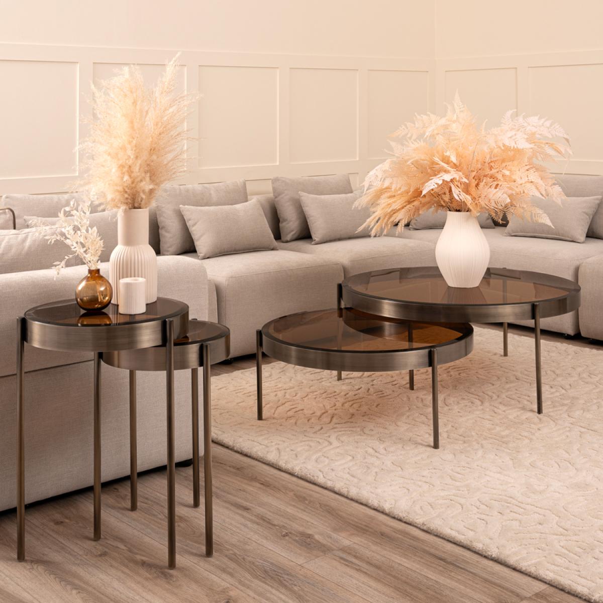 A distinctive, statement set of nesting tables. Toughened amber glass tops with a deep bevelled edges. Bronze-coloured brushed stainless steel bases. Useful nesting design - can be expanded or tucked away as required. Supplied fully assembled.