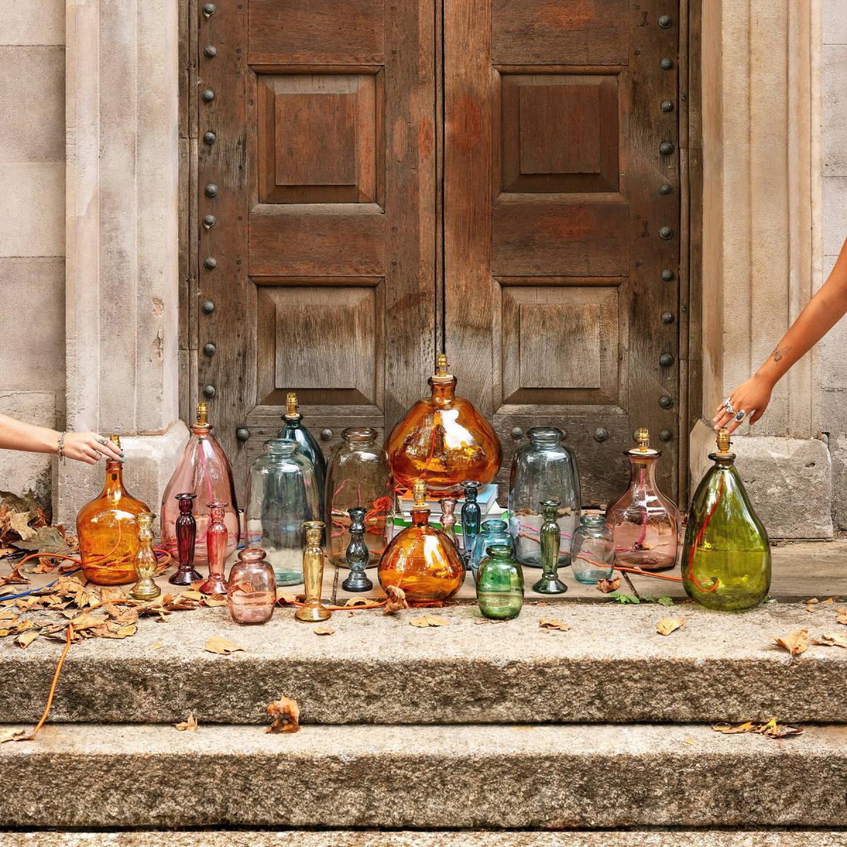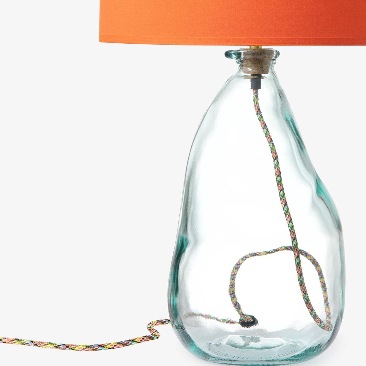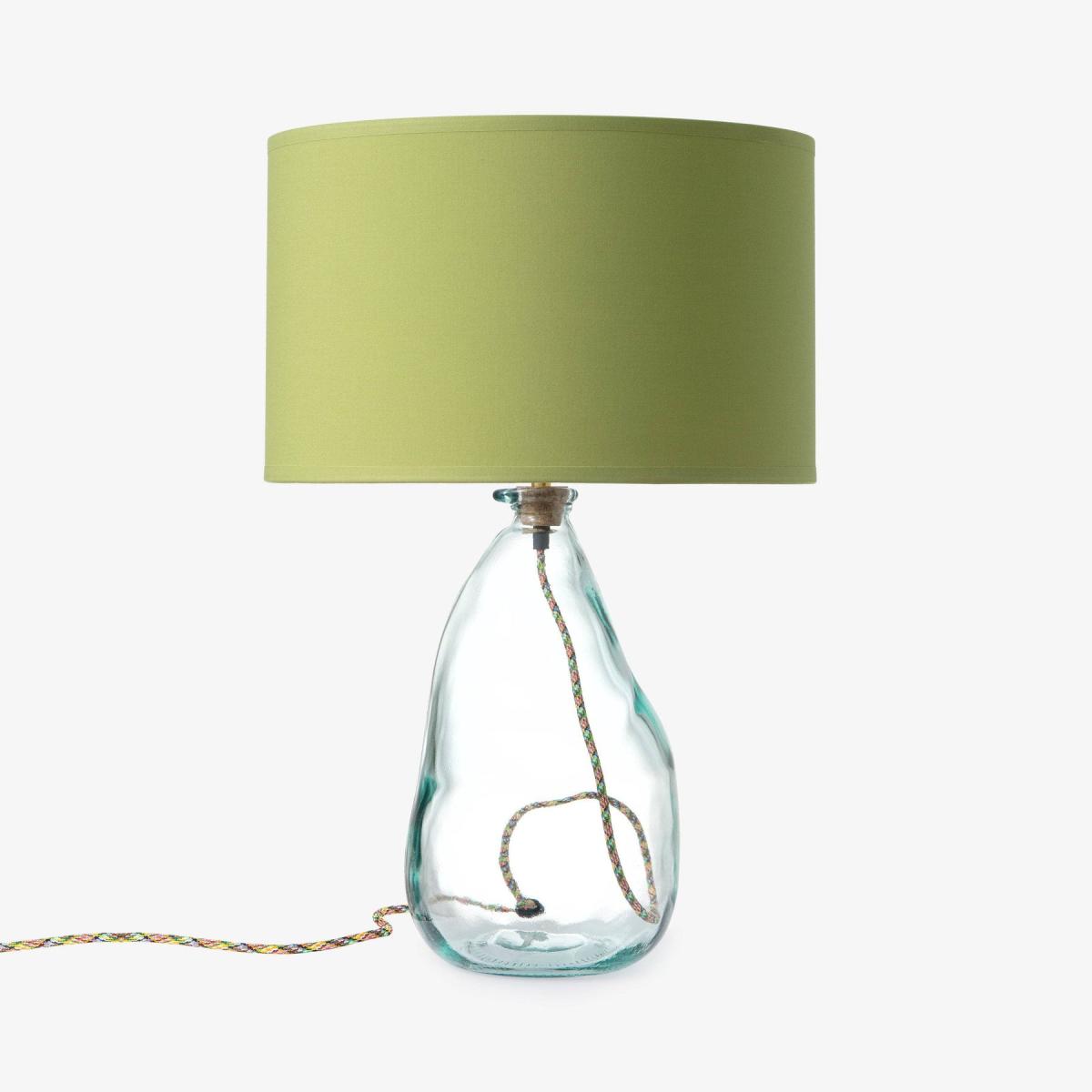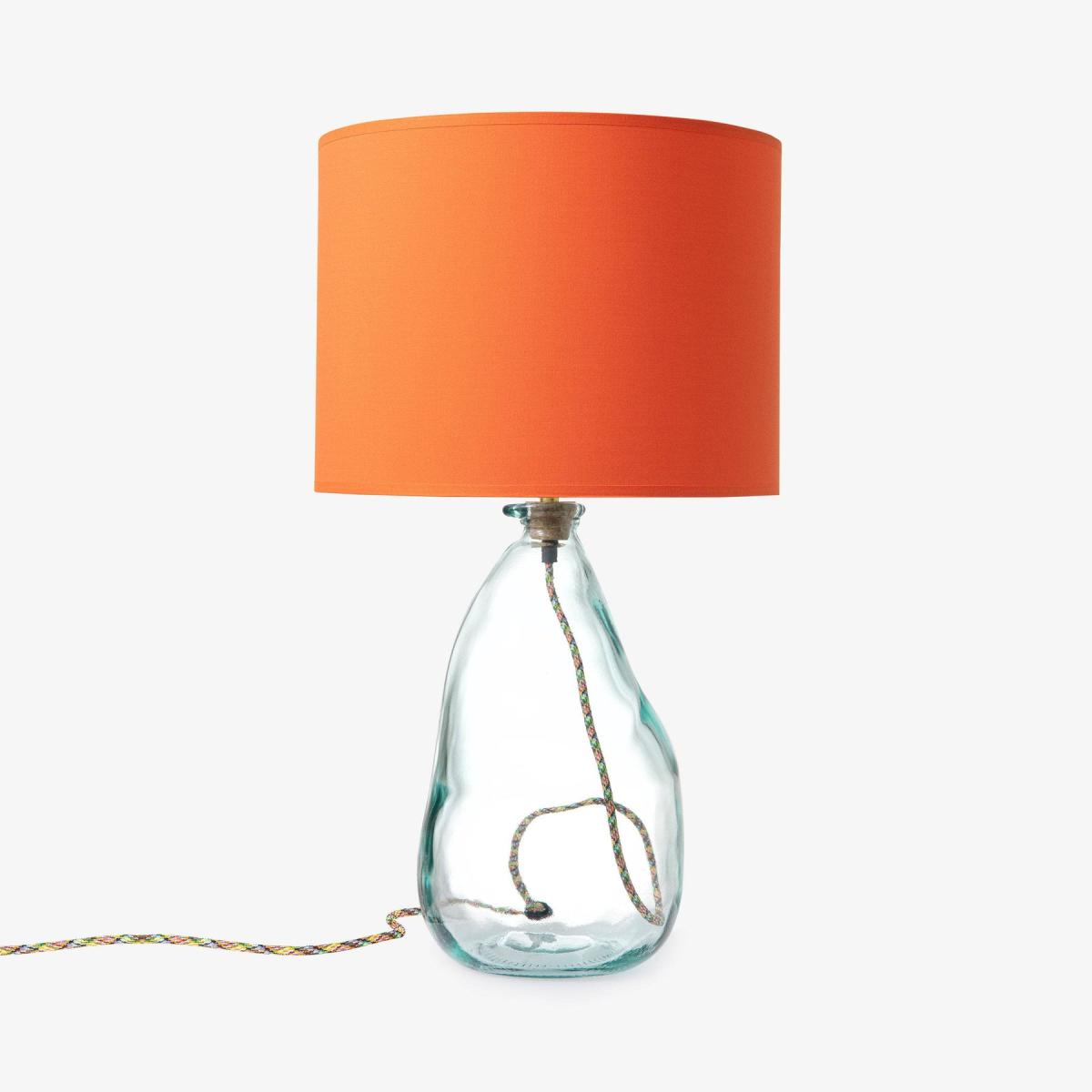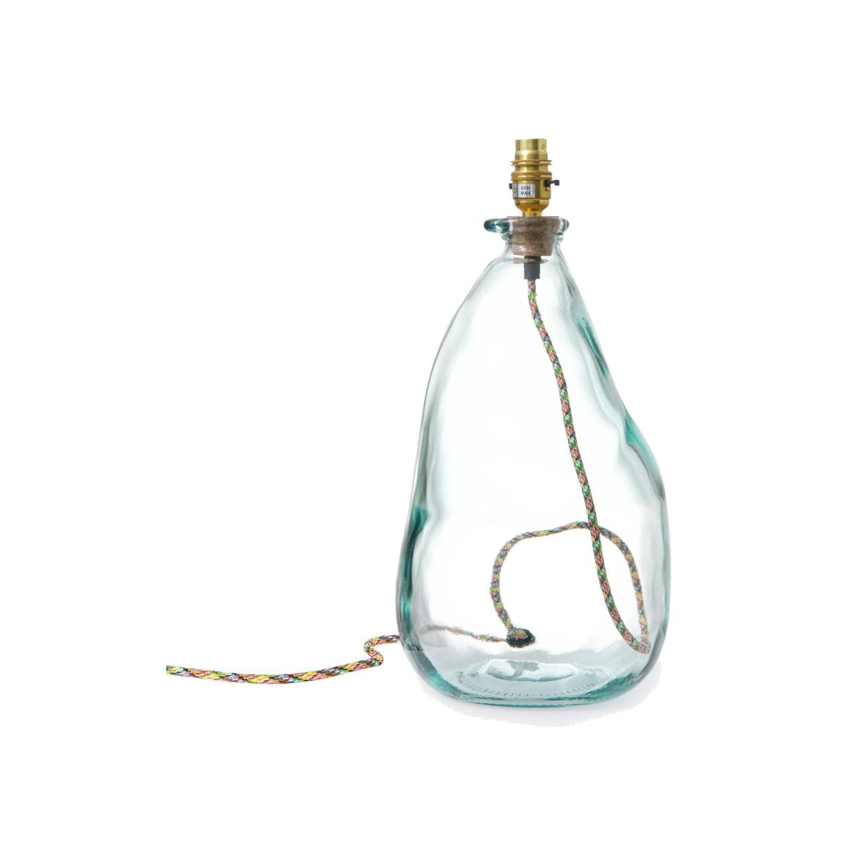 Our eco-friendly glass lamp in clear, will instantly create a welcoming ambience in any room with its handblown glass and organic silhouette shape. Lights out or on, there’s no denying our table lamp will look just as striking on any tabletop, while ticking all the boxes for aesthetic satisfaction, functionality, and great quality design. We love this for adding a playful feel to the home, it’s the ideal piece to use in the living room, study, or on a console table. Cruelty free and ethically made using 100% recycled glass, the coloured glass is made in Spain, cork stopper is made in Portugal, while the brass table lamp/fitting components are made in the UK. A fixed cork stopper supports the bulb holder. All the coloured lamps are wired, assembled, and tested in a Somerset workshop. Sold without a shade, will complement our Dahlia and Dakota shade collections to add a neutral or bold statement to the room. Sold with 2 metres of flex, approximately 1 metre inside the lamp. Also comes in more colourful glass colours and vases.