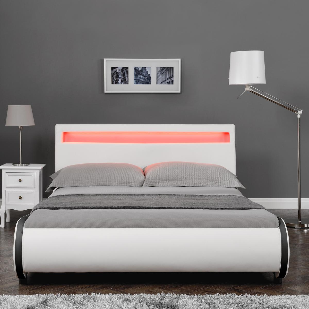 Orion LED Lights Headboard Faux Leather Bed Frame - White with Black / Double