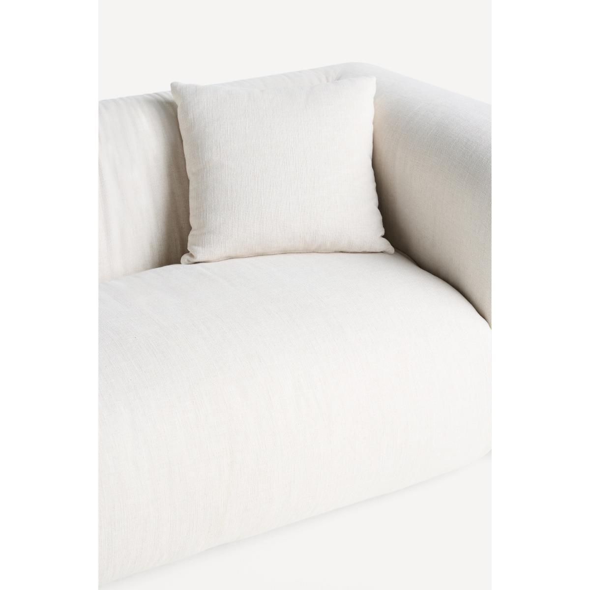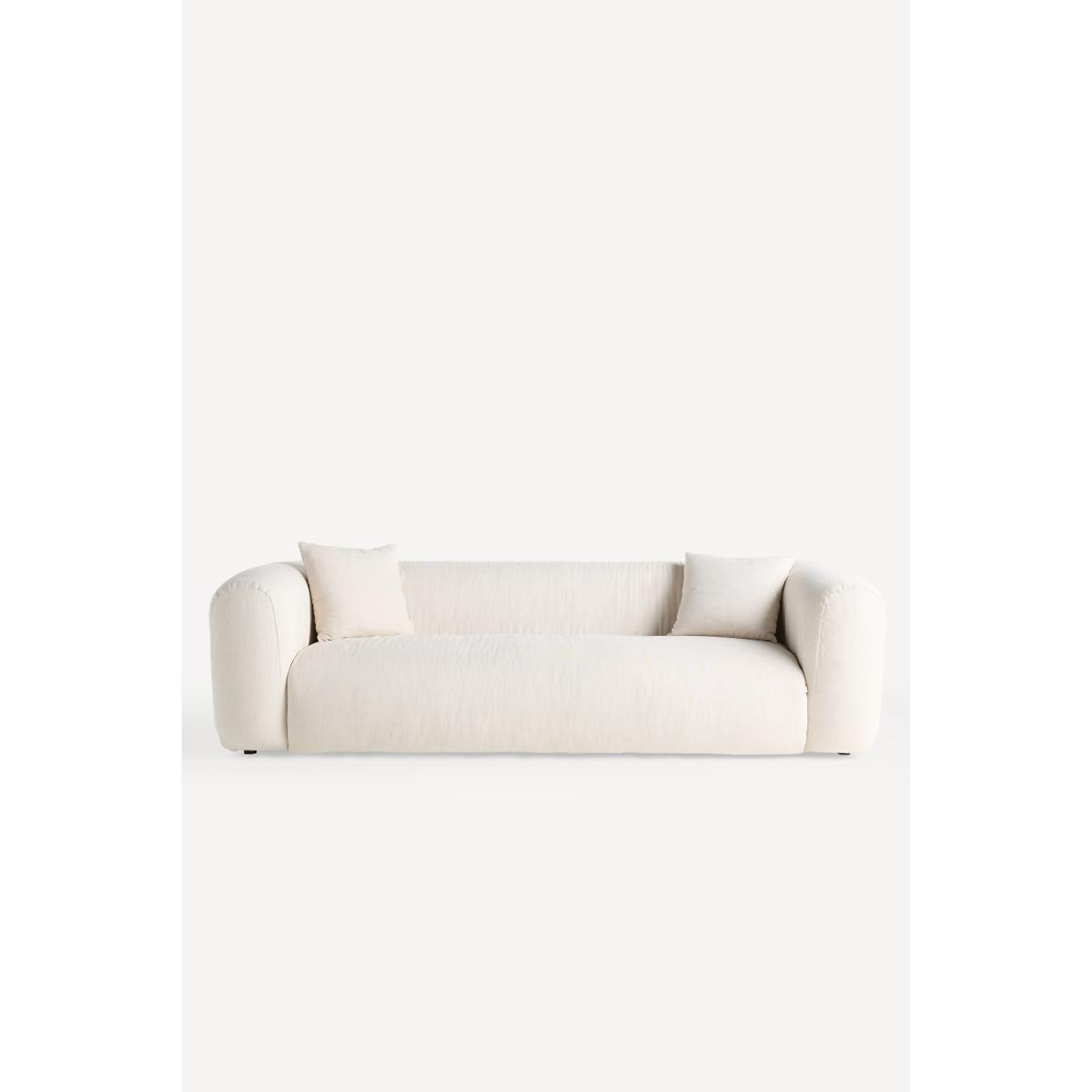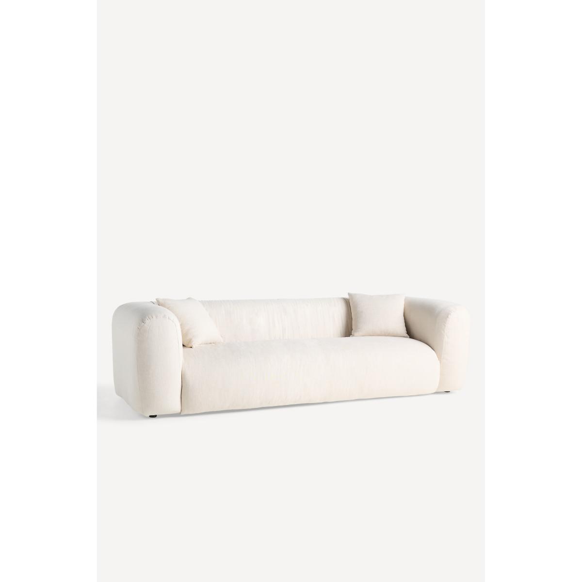 Linen upholstery, a low-profile, rounded silhouette, and overstuffed cushions make the Orion Velvet Sofa the ideal place to kick back and relax. * Valencia linen upholstery * Cushion content: foam & fiber * Includes two throw pillows * Sinuous spring seat construction * Kiln-dried hardwood frame * Turned legs * Professionally clean * This item is intended for indoor use * No assembly required * Imported