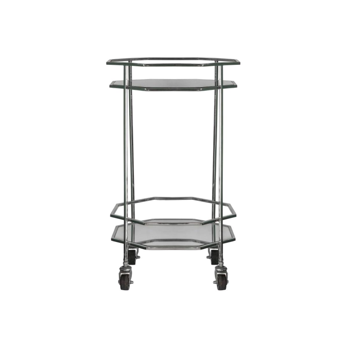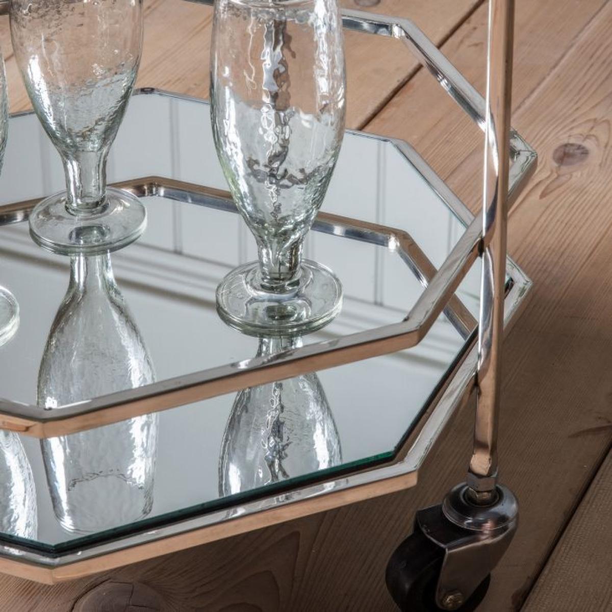 Add a touch of sophisticated elegance to a room with the Orion Drinks Trolley. The stylish compact octagonal design is combined with a polished metal frame in a silver finish and mirrored glass shelves to give a contemporary piece which is perfect for apartment living and smaller spaces. Material: Stainless Steel. Colour/Finish: Silver.