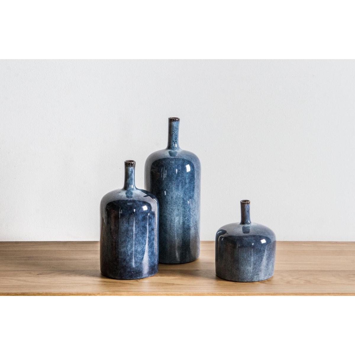The Orion ornament vase set makes a bold statement on earthy design and natural materials. It cleverly emphasises the beauty of simple lines, primary materials and techniques, resulting in a look and feel that is reminiscent from ancient vases. Crafted in ceramic, its deep Blue tone creates a calm, relaxing atmosphere while providing a colour note to any space. Its simplicity makes this set a superb addition to modern interiors looking for a stylish accent piece. The Orion set is part of a range and is also available in Natural. Due to the hand-painted nature of the vases, expect a variation of colour and texture for each of the 3 pieces.