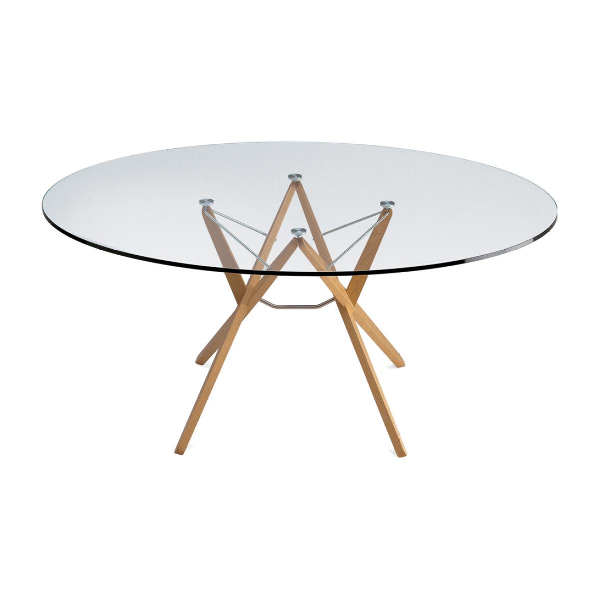 Designed in 1996 by Roberto Barbieri, the sculptural Orione Table presents harmonious materials in a clean-lined form, showcasing a striking configuration of natural oak which constitutes the strong base, with a 15mm glass top. The glass top allows for the subtle complexities of the wooden structure to be showcased in full, with nickel-plated steel tie-rods adding to the strength of the Orione Table’s stability. Perfect for enhancing any style of environment with its elegant materials and interesting form, the Orione Table is an enduring piece, perfect for entertaining or the everyday.