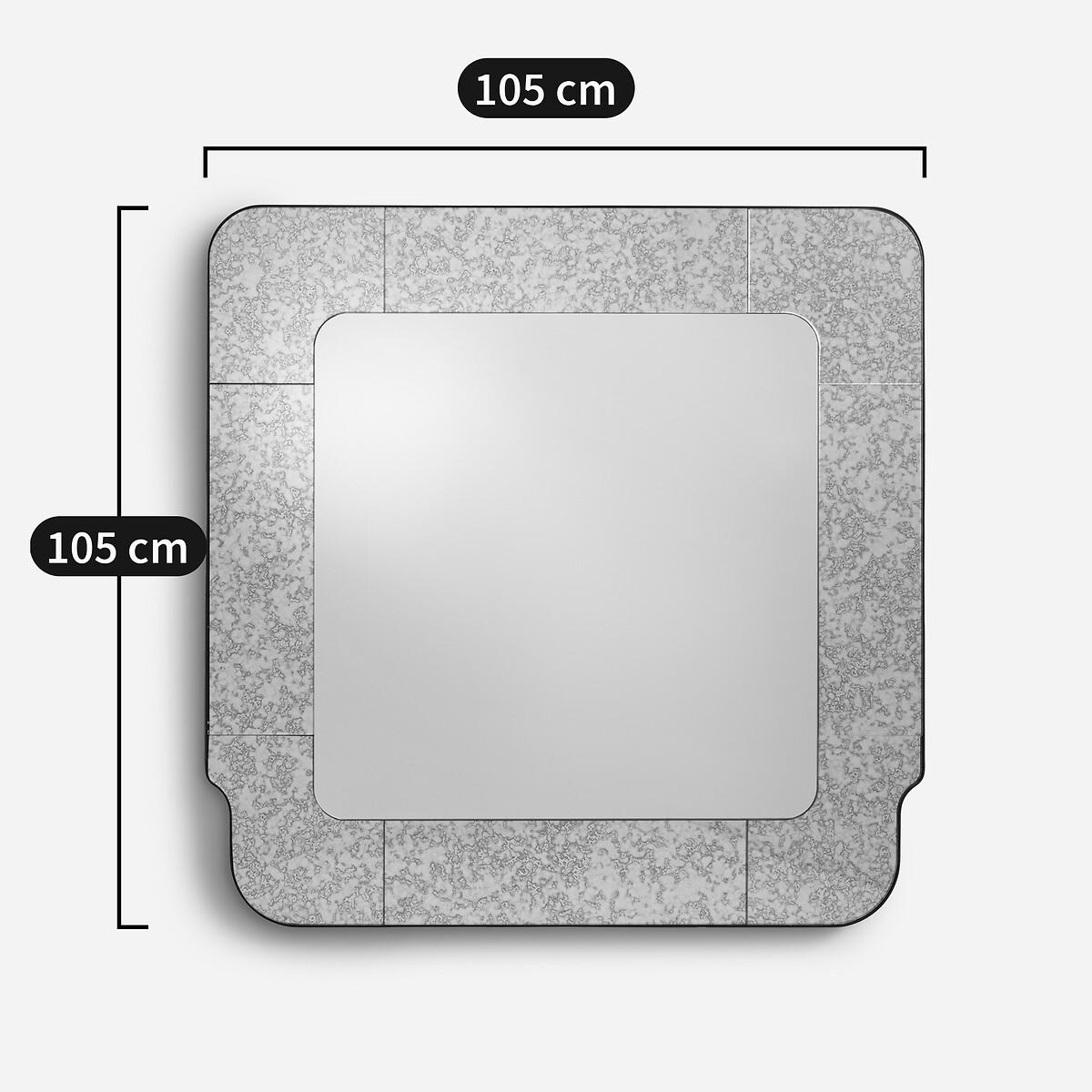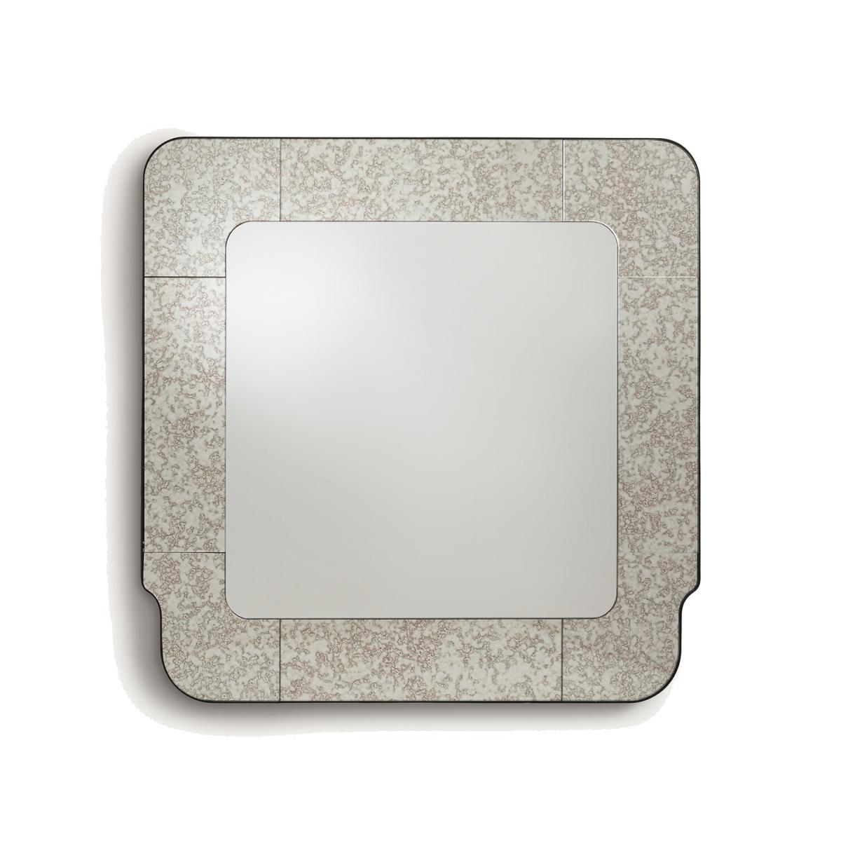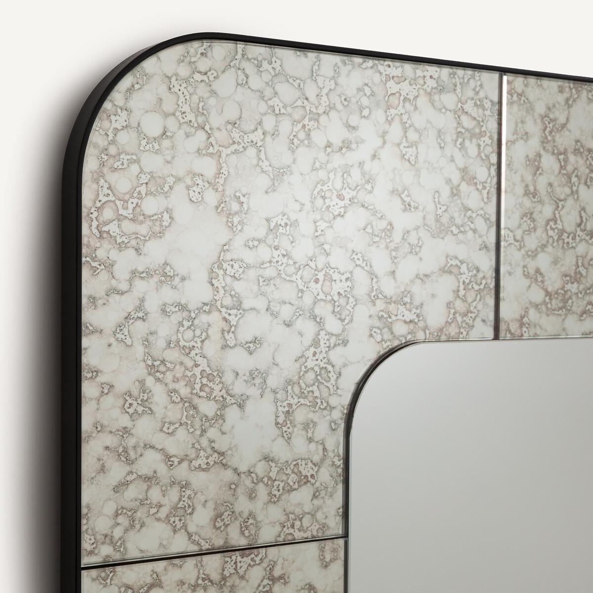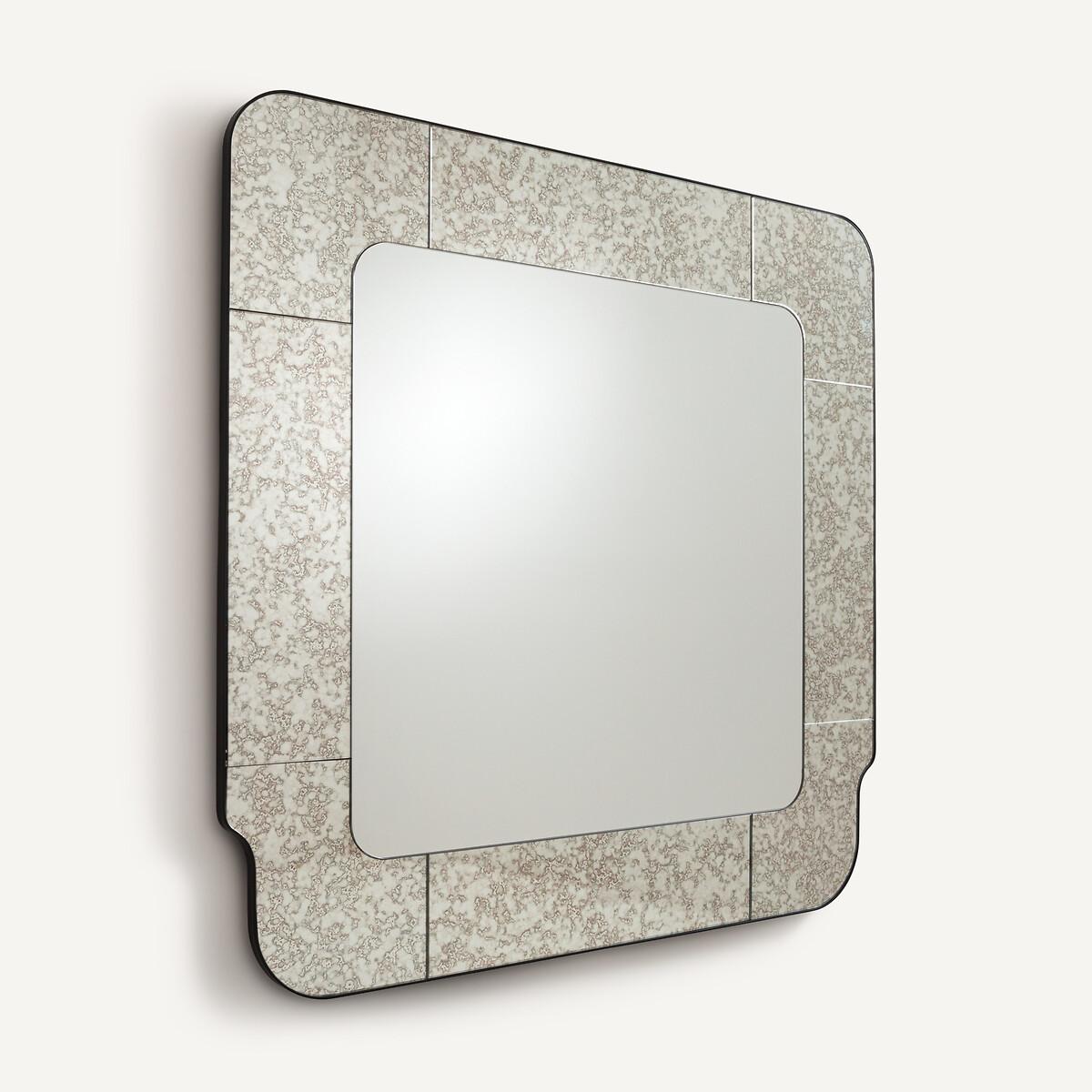 Oris blurs temporalities with an elegant play on contrasts. While its square shape with rounded corners is inspired by the 1970s, its mottled glass rim evokes a tint that has crossed centuries. A mirror at the crossroads of eras, completely contemporary. Product Details • Iron surround, black paint coating • Mirror edging in antique finish mottled glass, enhanced by cut-outs • Back in MDF, black water-based paint • Black-coated aluminium hooks for wall mounting (screws and dowels not supplied)Dimensions • Width: 105cm • Height: 105cm • Thickness: 1.8cm • WOOD FROM SUSTAINABLY MANAGED FORESTS. FSC® certified wood comes from forests that are environmentally, socially and economically well managed. Dimensions and weight of parcel • 1 parcel • W117.5 x H117.5 x D12.5cm. 34kg