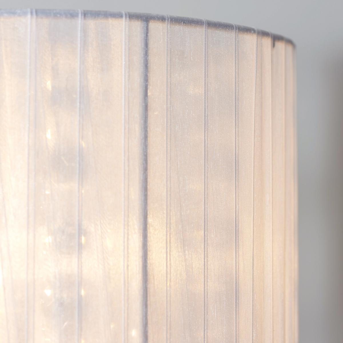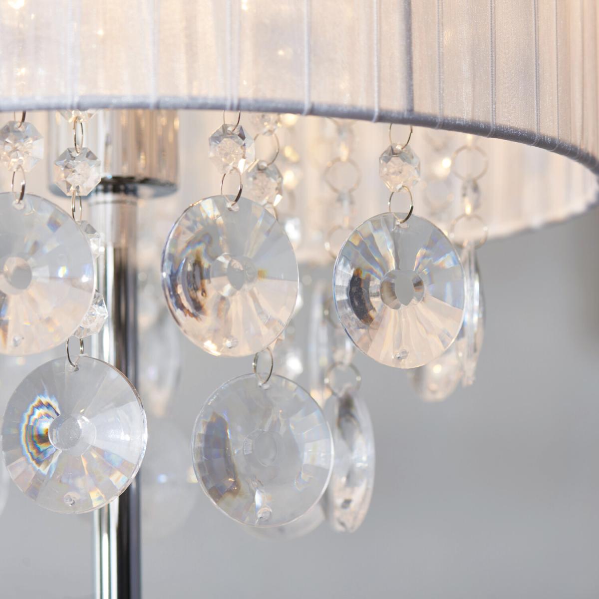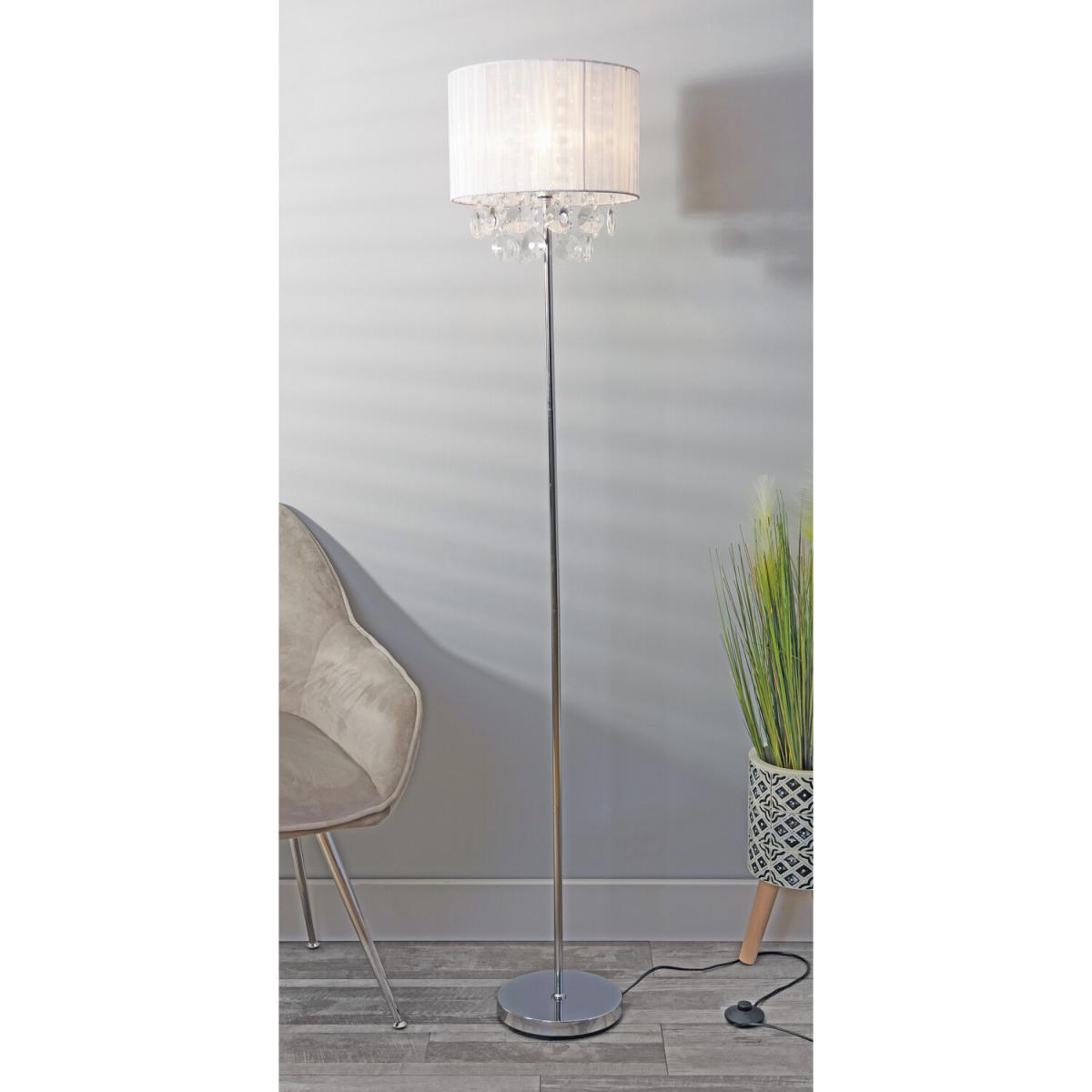 Bursting with elegance and glamour, the Orla Jewel Droplet Floor Lamp is the perfect light for anyone who adores high class aesthetics. Featuring a slim chromed stand, the Orla's light shade is made from white, translucent fabric, softly hazing the light and creating a warm glow. With large, acrylic jewels dangling from the under shade, this light will seem absolutely stunning when turned on.