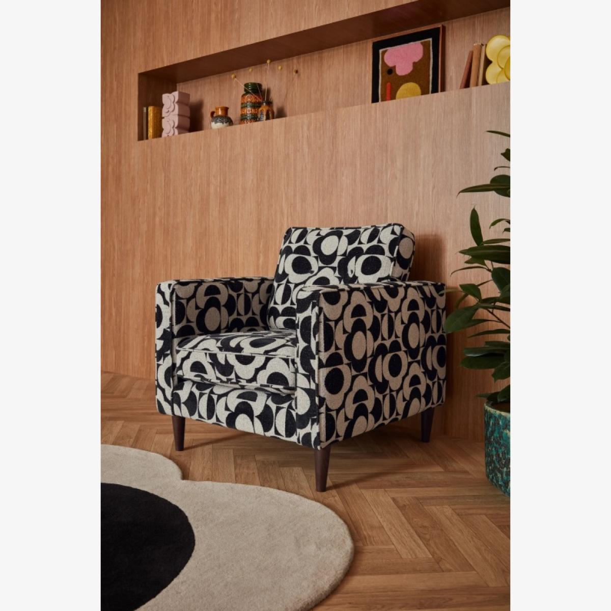 Orla Kiely Ebben Fabric Armchair – Compact Comfort, Iconic Flair Add a pop of personality to your space with the Orla Kiely Ebben Fabric Armchair—where timeless mid-century design meets modern comfort. Upholstered in one of Orla Kiely’s signature bold prints, this armchair brings a playful yet polished touch to any corner of your home. Perfectly sized for reading nooks, bedrooms, or as an accent piece in your living room, the Ebben armchair offers supportive seating with generously cushioned comfort. Its clean lines, structured silhouette, and tapered wooden legs echo classic retro style while maintaining a fresh, contemporary edge. Whether paired with the full Ebben range or styled solo, this armchair is a true design statement—small in size, big on style. The frames are made from hard wood, sourced from sustainable forests, and are pinned, screwed and glued to ensure maximum strength and stability. Main image show the Ebben Armchair in the Monochrome Fabric Features: 15 year guarantee on all hardwood frames and steel springs. Pick your favourite from a wide range of fabrics as well as selecting your preferred foot colour. Available in plain all over or pattern all over fabrics. Dimensions: Height 84cm Width 78cm Depth 85cm Arm Height 63cm Seat Height 43cm Seat Depth 60cm All screens vary in colour reproduction and whilst every effort has been made to display the colour as accurately as possible it is for guidance only.