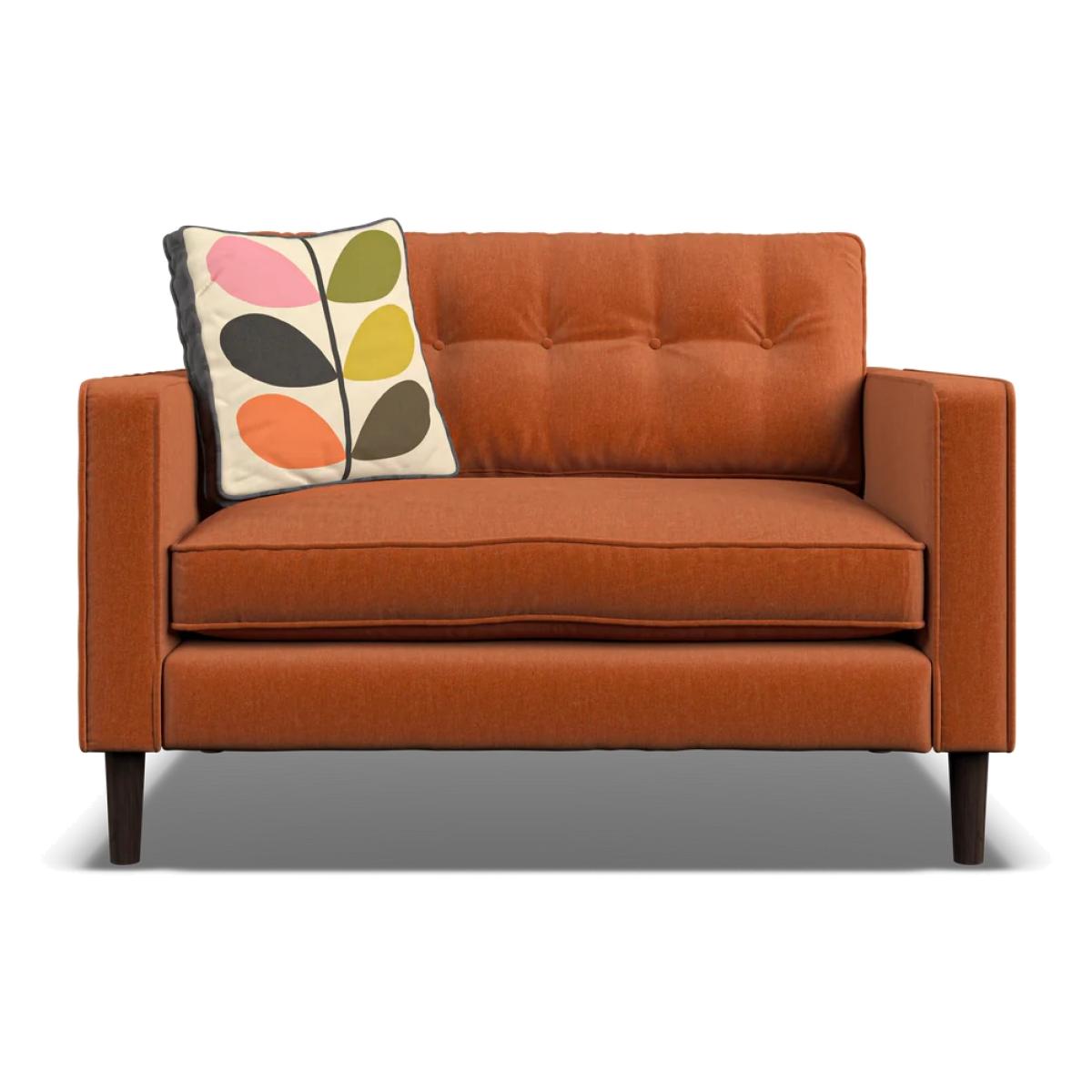 Orla Kiely Ebben Fabric Snuggler – Bold Design, Cozy Moments Fall into the perfect blend of comfort and character with the Orla Kiely Ebben Fabric Snuggler. Upholstered in one of Orla Kiely’s iconic, retro-inspired prints, this generously sized armchair is made for curling up—whether it’s a solo moment of calm or a cozy seat for two. With its structured silhouette, deep cushioning, and tapered wooden legs, the Ebben Snuggler offers a stylish nod to mid-century design while delivering the softness and support you crave. Compact enough for smaller spaces yet roomy enough to stretch out, it’s the ideal in-between option that doesn’t compromise on style or comfort. A true statement piece, the Ebben Snuggler brings warmth, whimsy, and a touch of nostalgia to any home. Images of the Ebben Fabric Snuggler are in Clara Paprika and Clara Seagrass Features: Each piece is built to last and comes with a 15 year guarantee on all hardwood frames and steel springs. Pick your favourite from a wide range of fabrics as well as selecting your preferred foot colour. Finishing touches come from a fabulous choice of scatter cushions. Available in plain all over or pattern all over fabrics. Dimensions: Height 87cm Width 148cm Depth 95cm Arm Height 63cm Seat Height 43cm Seat Depth 60cm All screens vary in colour reproduction and whilst every effort has been made to display the colour as accurately as possible it is for guidance only.
