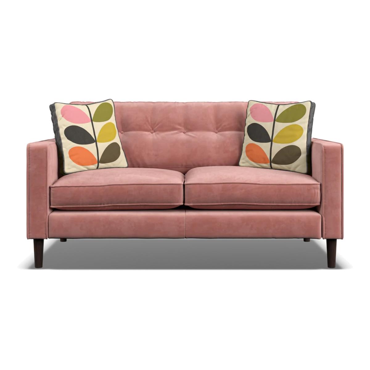 The Orla Kiely Ebben Small Fbairc Sofa is a compact style with iconic retro flair. Add a splash of mid-century charm to even the smallest of spaces with the Orla Kiely Ebben Small Fabric Sofa. Designed with Orla's signature retro aesthetic, this compact sofa combines timeless style with everyday comfort, making it the perfect statement piece for apartments, snug living rooms, or stylish corners. Despite its smaller size, the Ebben Small Sofa doesn’t hold back on personality. Upholstered in a rich, textured fabric and finished with gently flared arms and elegant tapered wooden legs, it brings warmth and character to any setting. Plush foam-filled cushions provide supportive seating, while the streamlined design keeps your space feeling open and airy. Images of the Ebben Fabric Small Sofa are in Bandon Dusty Rose and Blythe Rockpool Features: 15 year guarantee on all hardwood frames and steel springs. Pick your favourite from a wide range of fabrics as well as selecting your preferred foot colour. Finishing touches come from a fabulous choice of scatter cushions. Available in plain all over fabrics. Dimensions: Height 87cm Width 161cm Depth 95cm Arm Height 63cm Seat Height 45cm Seat Depth 60cm All screens vary in colour reproduction and whilst every effort has been made to display the colour as accurately as possible it is for guidance only.