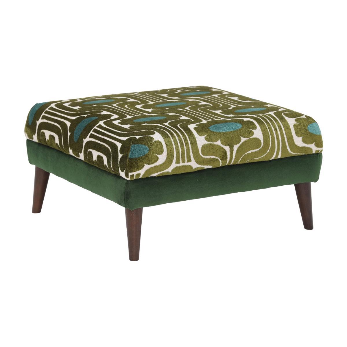 Design. An easy way to bring statement colour, stunning pattern and retro style to your living space, the Flynn footstool boasts contemporary design with mid-century influence. Its plush velvet fabric and textured upholstery exudes elegance, with generous cushioning providing ample support. Slim legs give a sense of space, available in three different finishes to ensure they complement your interior perfectly. The signature Sixties Stem print adorns the seat of the footstool in your choice of colour palette, creating character and a gorgeous focal point. Ideal for propping up tired feet or positioning in the centre your room. Image shown in Sixties Stem Charcoal top with Glyde Tomato sides and American Walnut feet.