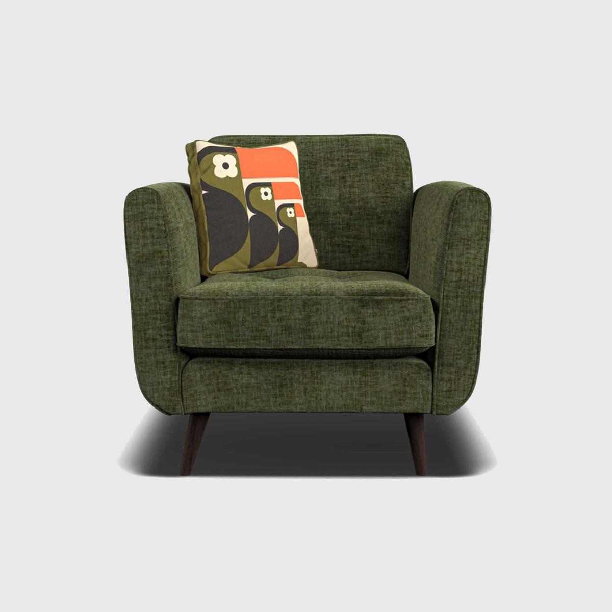 Creating a cosy corner in the living room or becoming a stylish bedroom centrepiece, the Ivy chair boasts perfect proportions, comfortable cushioning and a gorgeous retro silhouette. Chic buttonless tufting provides a gentle hint of elegance, beautifully complemented by the piped edge detailing. A scatter cushion featuring your choice of iconic bold print lifts the look, and brings a colourful contrast that is suitable for both contemporary and classic interiors. With generous foam and fibre filling, high arms and quality upholstery, you can sit snugly from breakfast until bedtime. Image shown in Liffey Putty with Linear Multi Stem scatter and American Walnut feet.