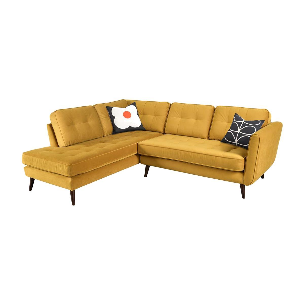 Design. Available in a spectrum of stunning velvets, the Ivy right hand facing corner sofa by Orla Kiely brings together comfort, quality and character. Two complimentary scatter cushions provide further support and style, in your choice of playful Orla Kiely print. Featuring a charmingly retro shape and subtle buttonless tufting, this velvet corner sofa will be the focus in any living room.