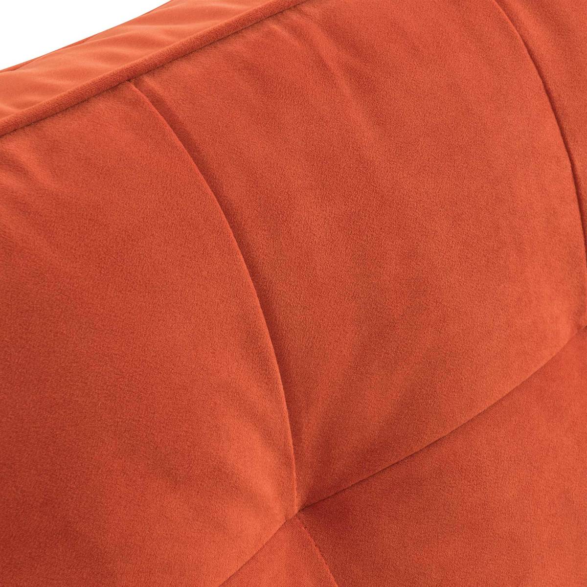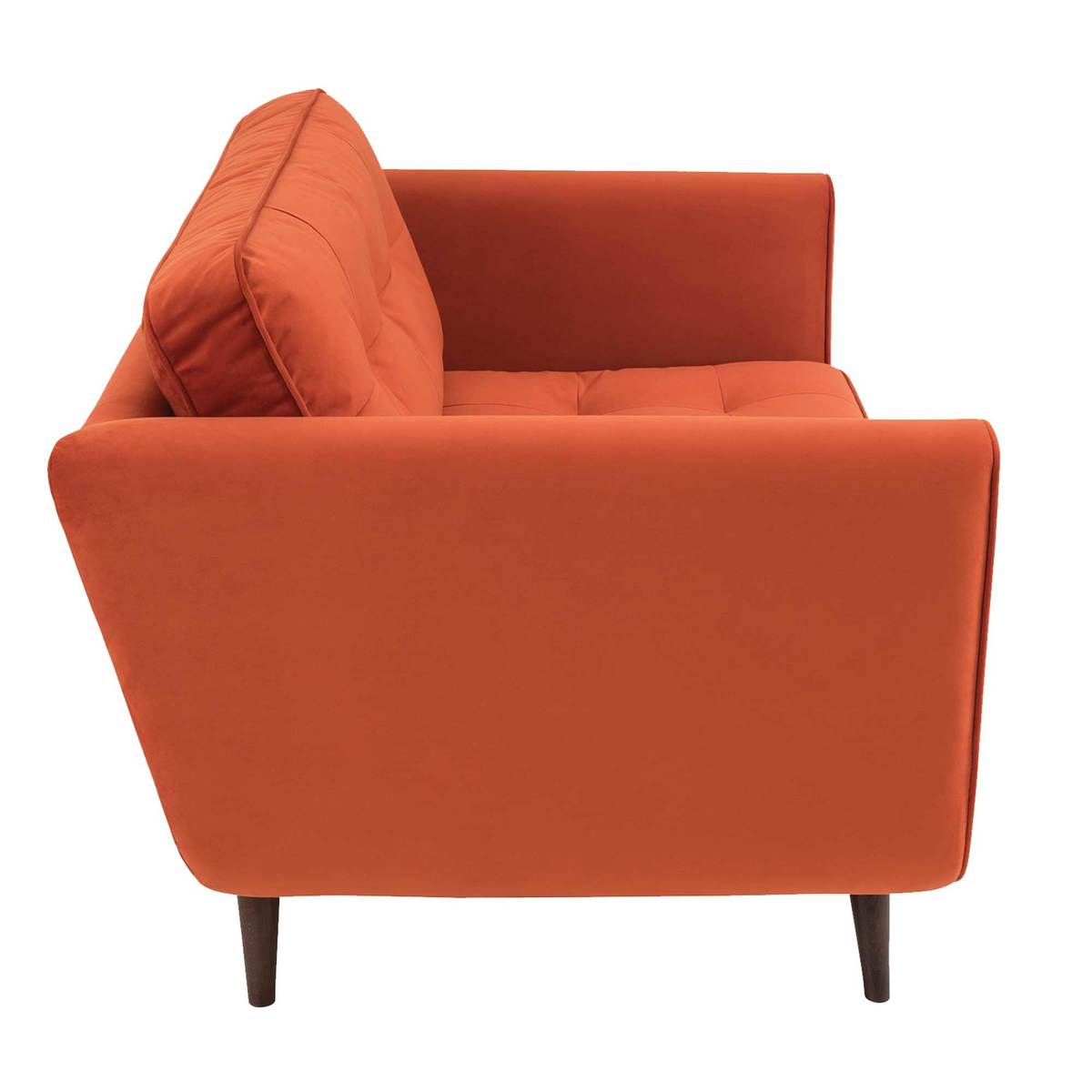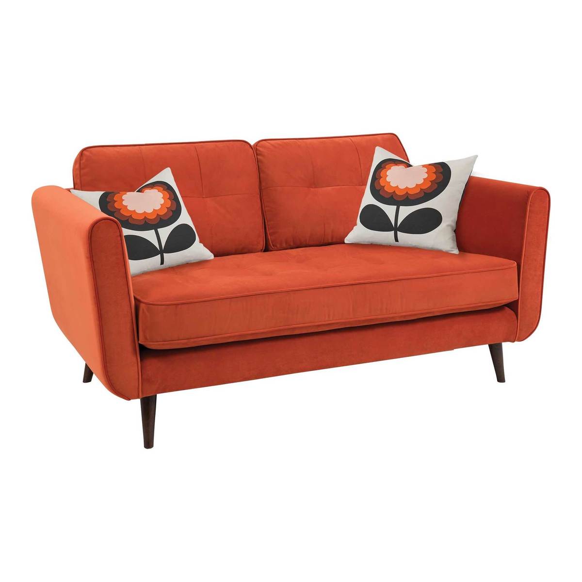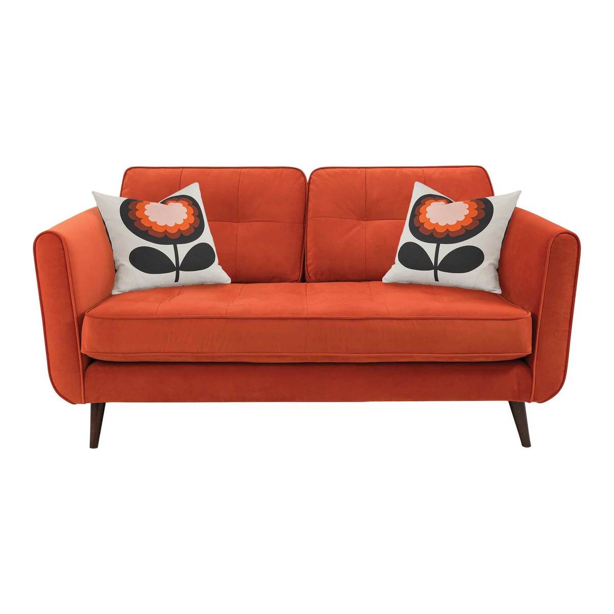 Luxurious velvet upholstery and elegant design details give the Ivy sofa its stunning beauty, whilst an iconic blend of colour and pattern provides plenty of character. A smooth silhouette that nods approvingly to mid-century style, the sofa boasts curved corners and slim splayed legs. The piped detailing and subtle buttonless tufting bring a soft touch, perfectly paired with the sumptuous feel of the velvet. Your choice of bold and striking prints decorate the scatters, introducing a playful touch of retro. But the Ivy isn’t just a pretty face, its seat and back cushions are generously filled with foam and fibre for a most supportive sit. Image shown in Gylde Tomato with 70's Floral scatters and American Walnut feet.