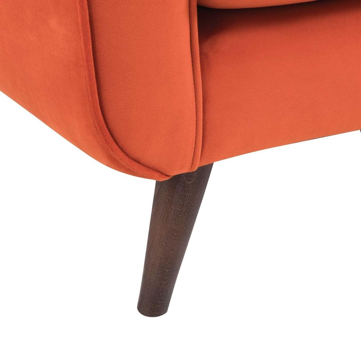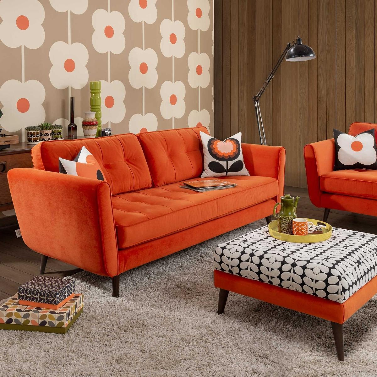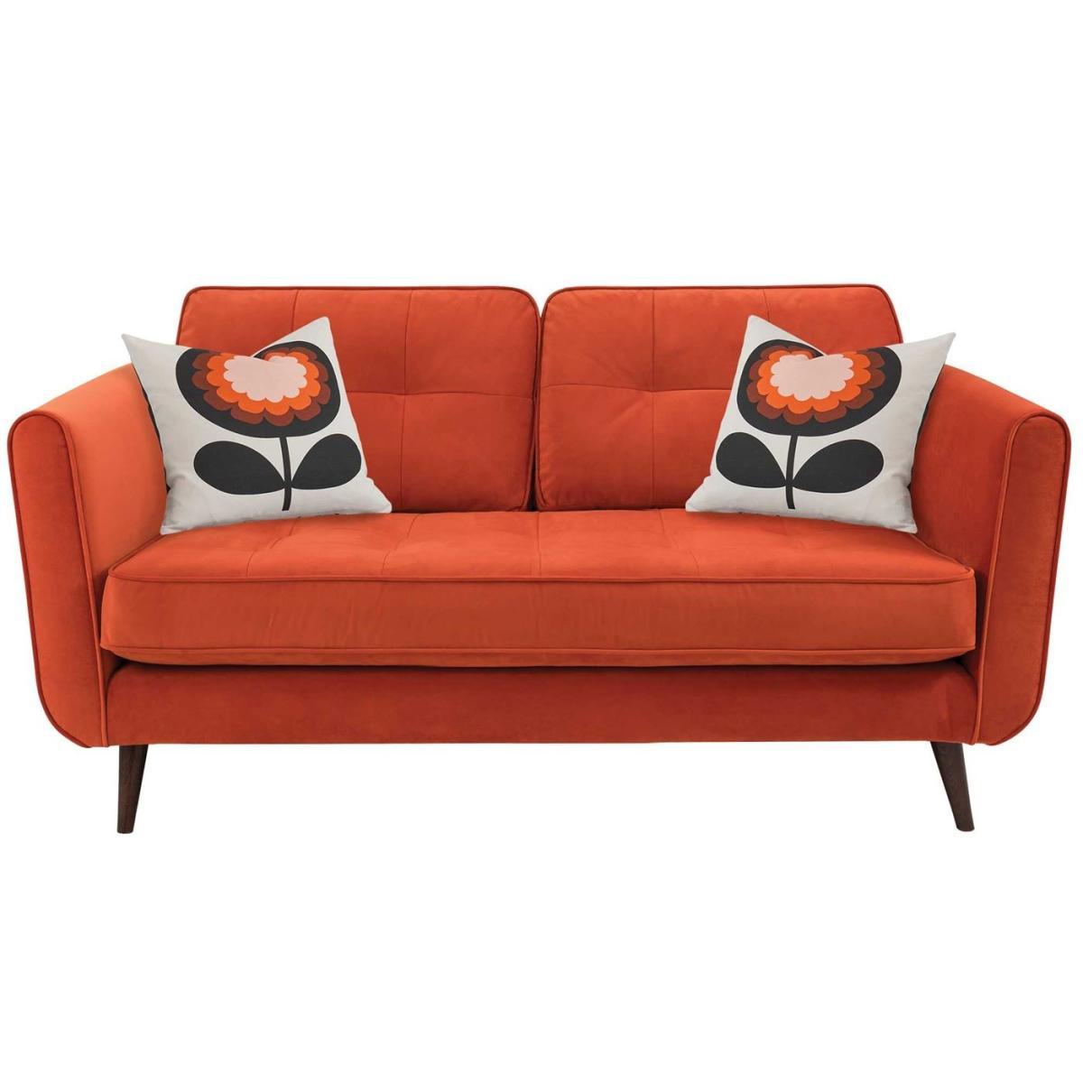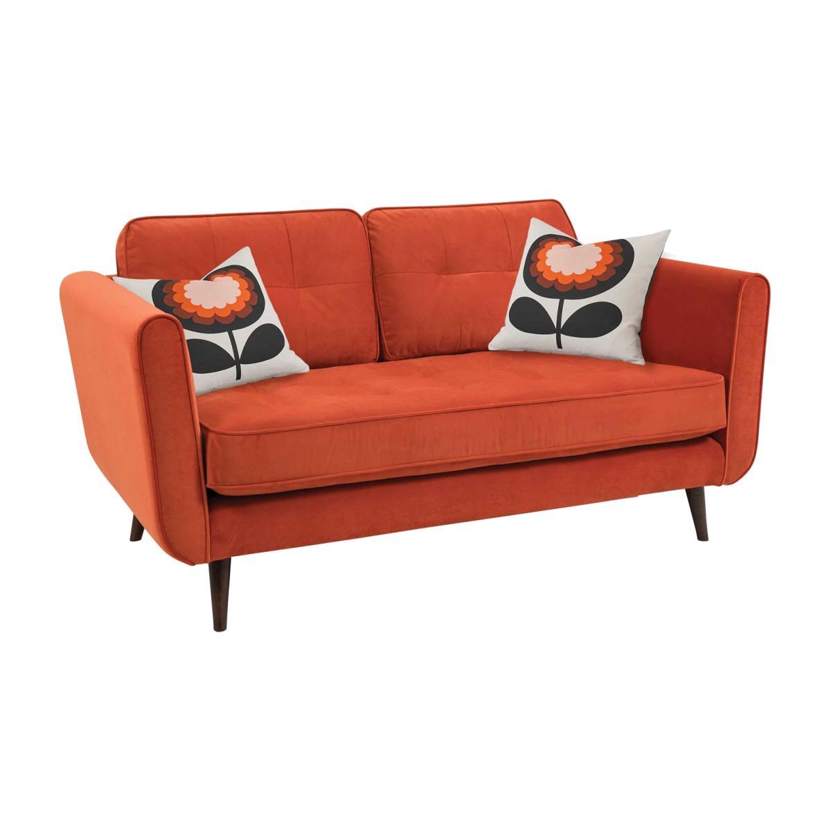 Design. Luxurious velvet upholstery and elegant design details give the Ivy sofa its stunning beauty, whilst an iconic blend of colour and pattern provides plenty of character. A smooth silhouette that nods approvingly to mid-century style, the sofa boasts curved corners and slim splayed legs. The piped detailing and subtle buttonless tufting bring a soft touch, perfectly paired with the sumptuous feel of the velvet. Your choice of bold and striking prints decorate the scatters, introducing a playful touch of retro. But the Ivy isn’t just a pretty face; its seat and back cushions are generously filled with foam and fibre for a most supportive sit. Image shown in Gylde Tomato with 70's Floral scatters and American Walnut feet.