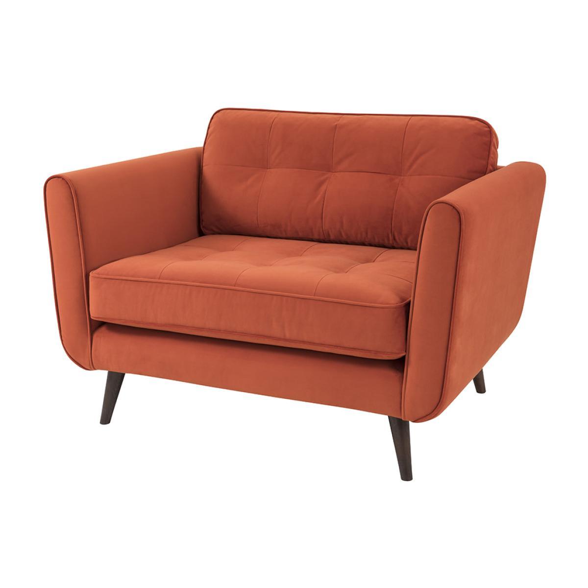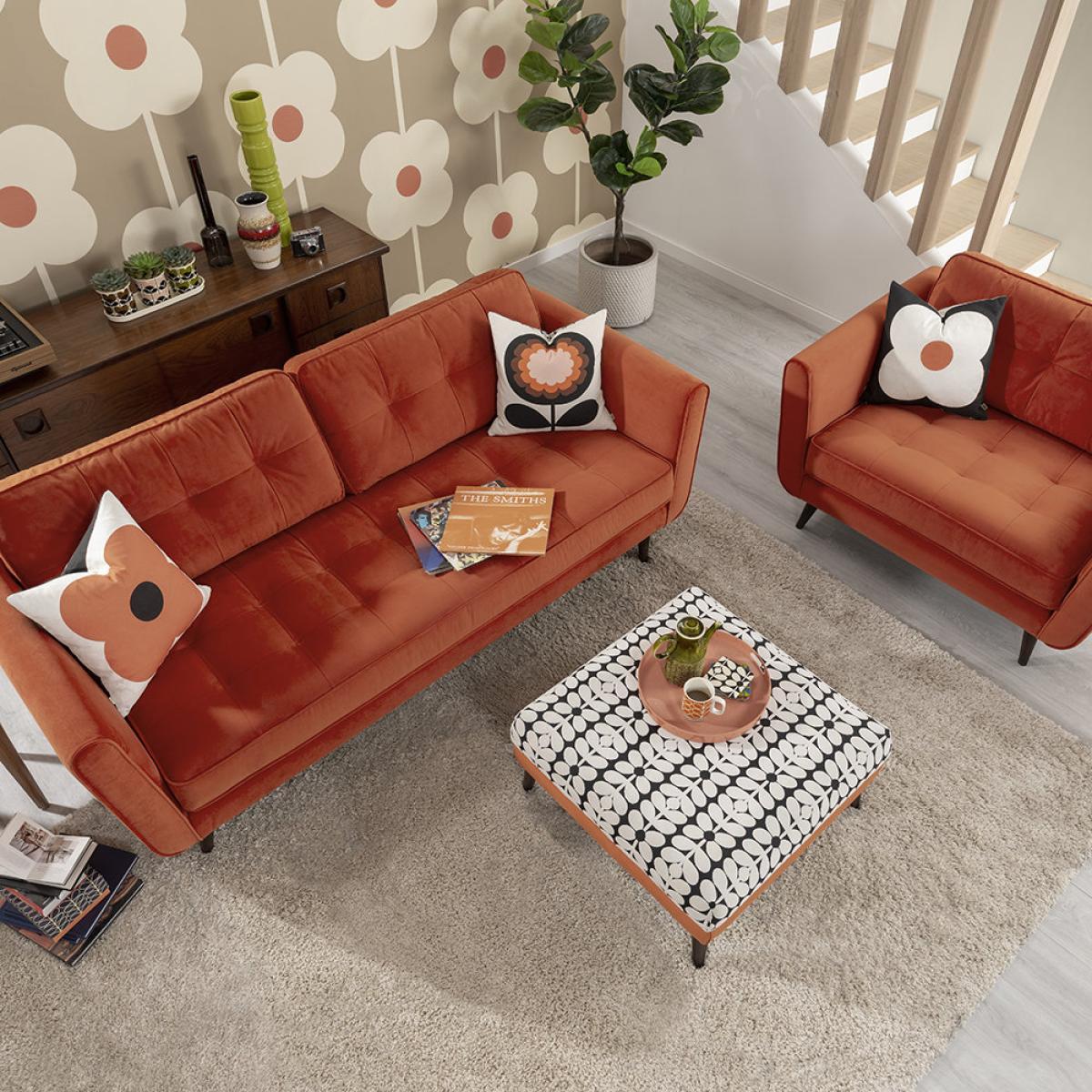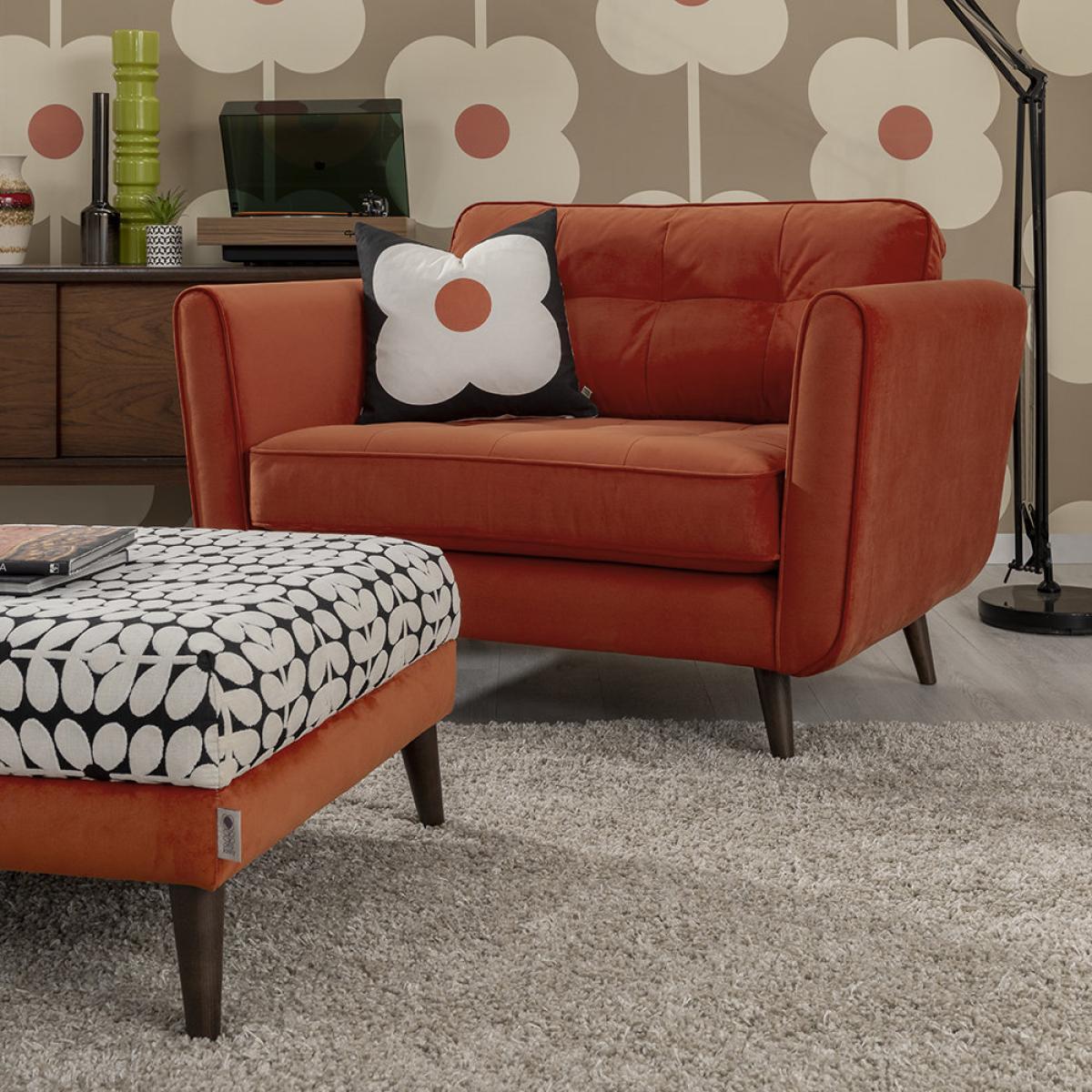 Cosy up on this snuggler seat from Orla Kiely. A roomy seat for one, this design has a distinctively mid-century modern shape with a thoroughly contemporary shade of orange. Covered in block colour Glyde Tomato fabric, this snuggler chair is finished with complementing slim American walnut legs. The frame is crafted from seasonal hardwood that has been carefully selected from traceable & sustainable sources. All key joints are securely glued, screwed and stapled. Seat cushions feature a foam filling ensuring superior comfort and support. Key features: * Snuggler chair * Frame material: seasonal hardwood * Dimensions: H86xW126xD94cm * Warm red colour Glyde Tomato fabric covering * Seat Suspension: Full zig-zag sprung platform for added flexibility * Back Suspension: tensioned woven elastic webbing covered with foam * Seat cushions: fixed foam seat * Back cushions: high quality fibre * Leg finish: American walnut