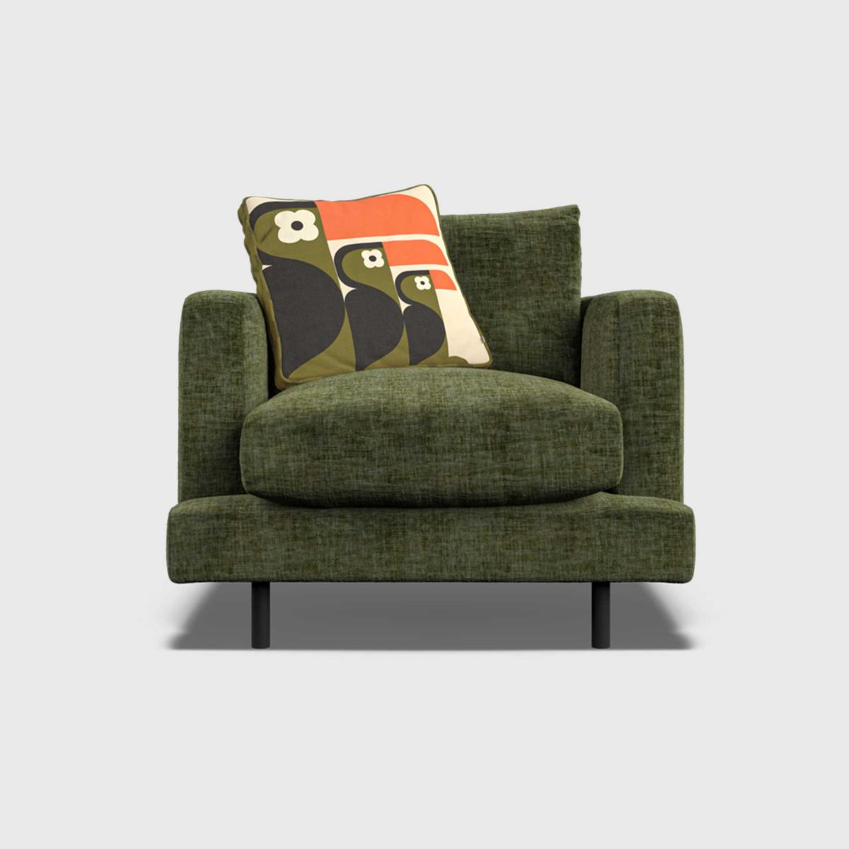 Displaying clean lines and a laidback vibe, the Larch Armchair presents a low back and narrow set back arm to give it a modern aesthetic. The seat cushion features a feather topper, giving you that extra comfortable seat that is perfect to relax in with a cup of tea. Available in a choice of rich colours, the Larch Armchair wouldnrsquo;t be complete without an exclusive patterned Orla Kiely cushion, giving you that pop of retro design to complete the look.