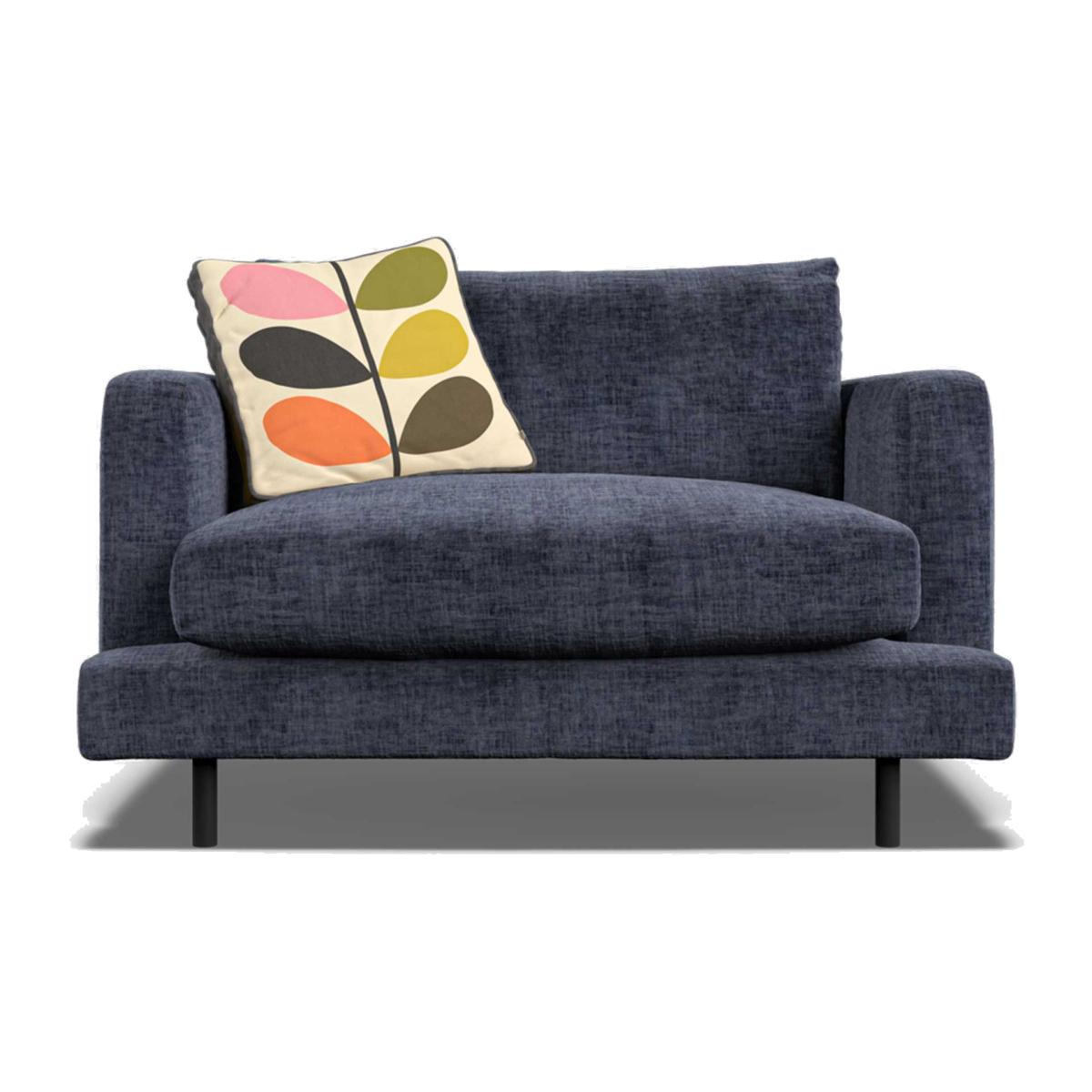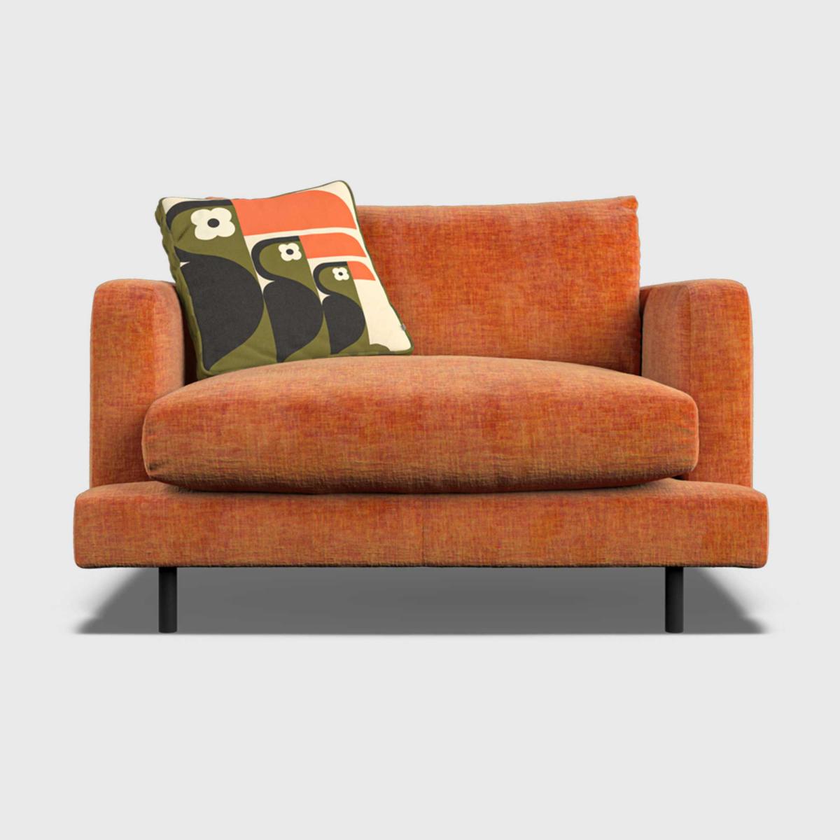 Introducing the Larch Snuggle Chair, a pinnacle of modern sophistication defined by its ultra-clean lines, low-profile stance, and elegantly slender set-back arms. This chair is elevated from the ground on black steel legs, creating a floating appearance to give the feeling of extra space, and the perfect modern touch. The Larch Snuggle Chair is the perfect relaxed, modern addition for your living space. Sit back and enjoy pure comfort as the seat cushions of the chair is finished with a luxurious feather topper. It is the perfect cosy spot for two or sprawl out and enjoy in solitude.