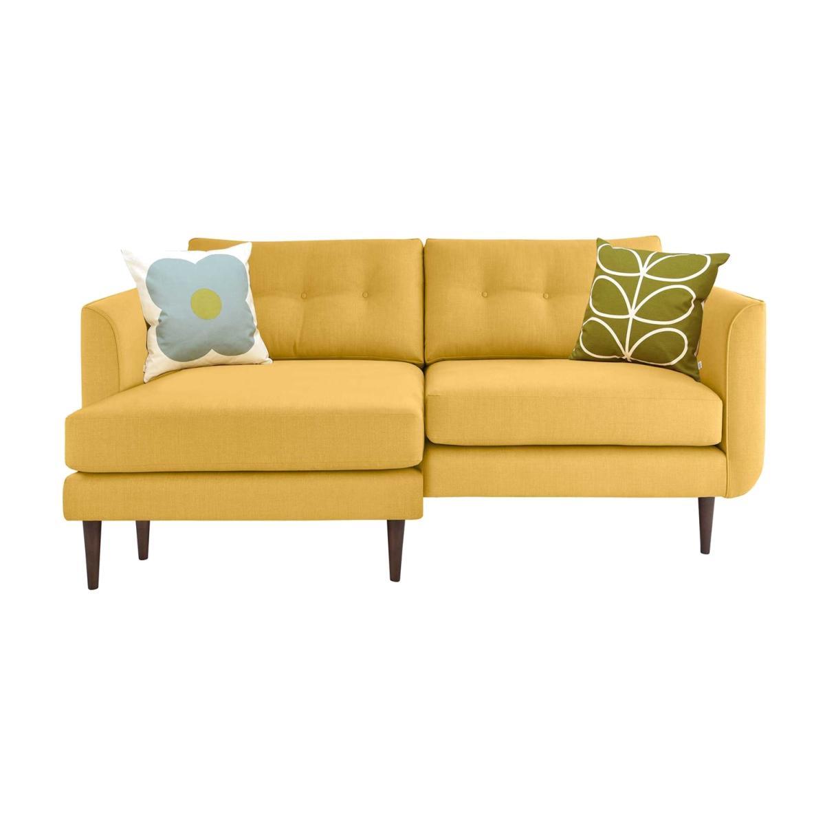Design. A chic seating choice that makes the most of surrounding space, the Orla Kiely Linden large chaise sofa features a modern L shape that’s perfect for propping up tired feet. Available in a selection of vibrant, subdued or dark hued fabrics, you can easily create the perfect piece to complement your living room. Made to last and built with comfort in mind, the sofa benefits from curved armrests, foam and fibre fillings, and two additional scatter cushions in your preferred signature prints. Classic button-back detailing and tapered legs provide the stylish finishing touch. Equally ideal for classic cosy lounges or eclectic looks with playful character.
