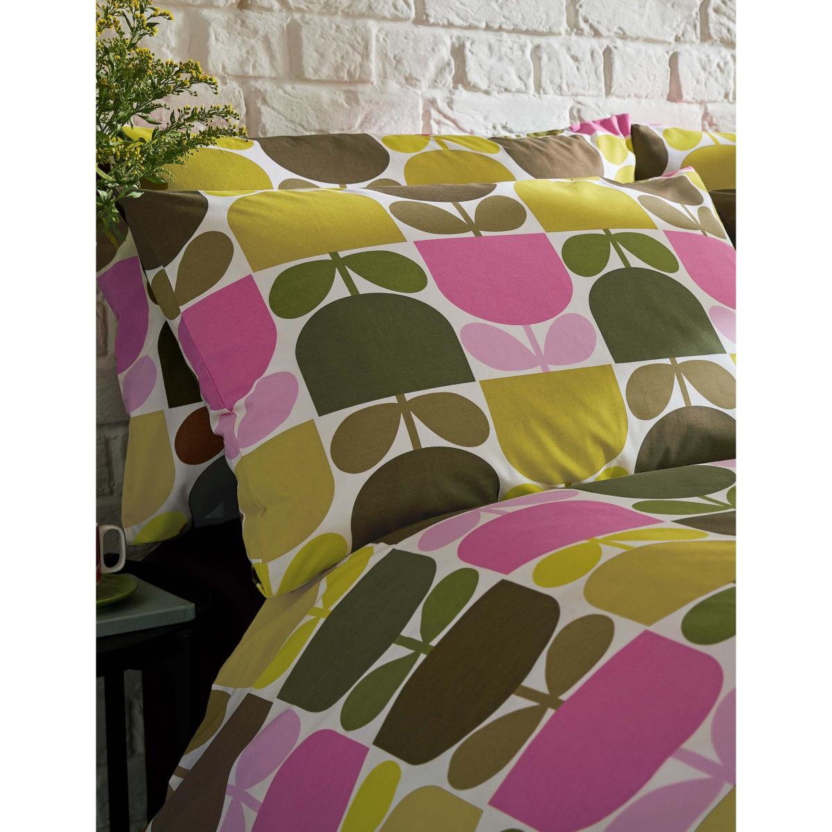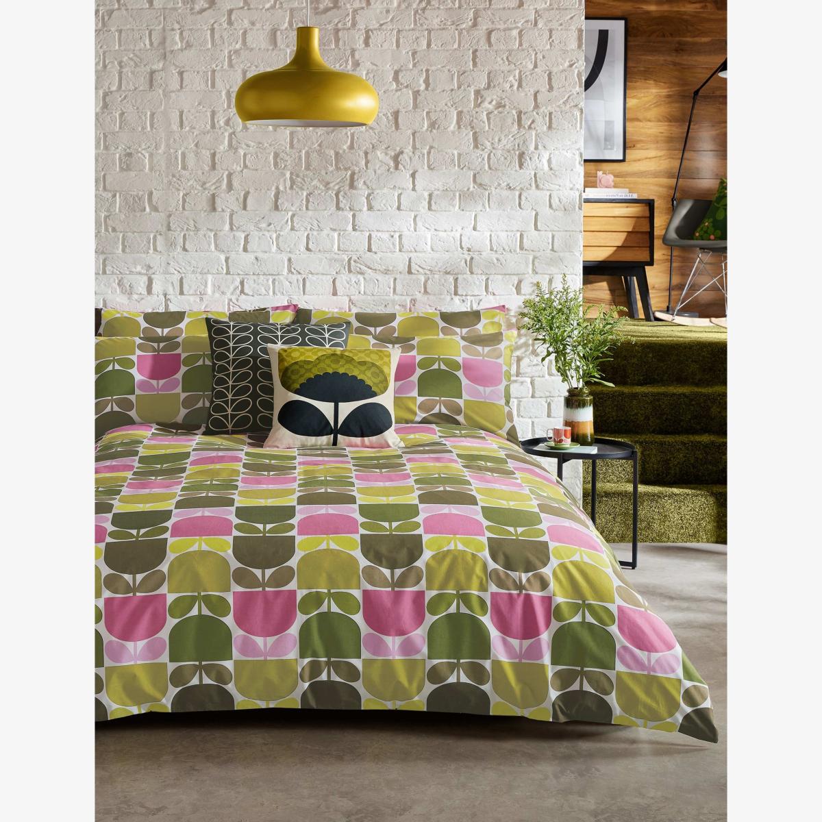 Add a touch of retro flair to your bedroom with this vibrant bedding set by designer Orla Kiely. It has a bold sixties-inspired print, featuring geometric block stems in candy pinks and shades of green. The set is crafted from 200 thread count pure cotton for breathability.