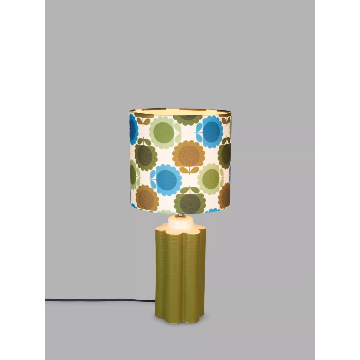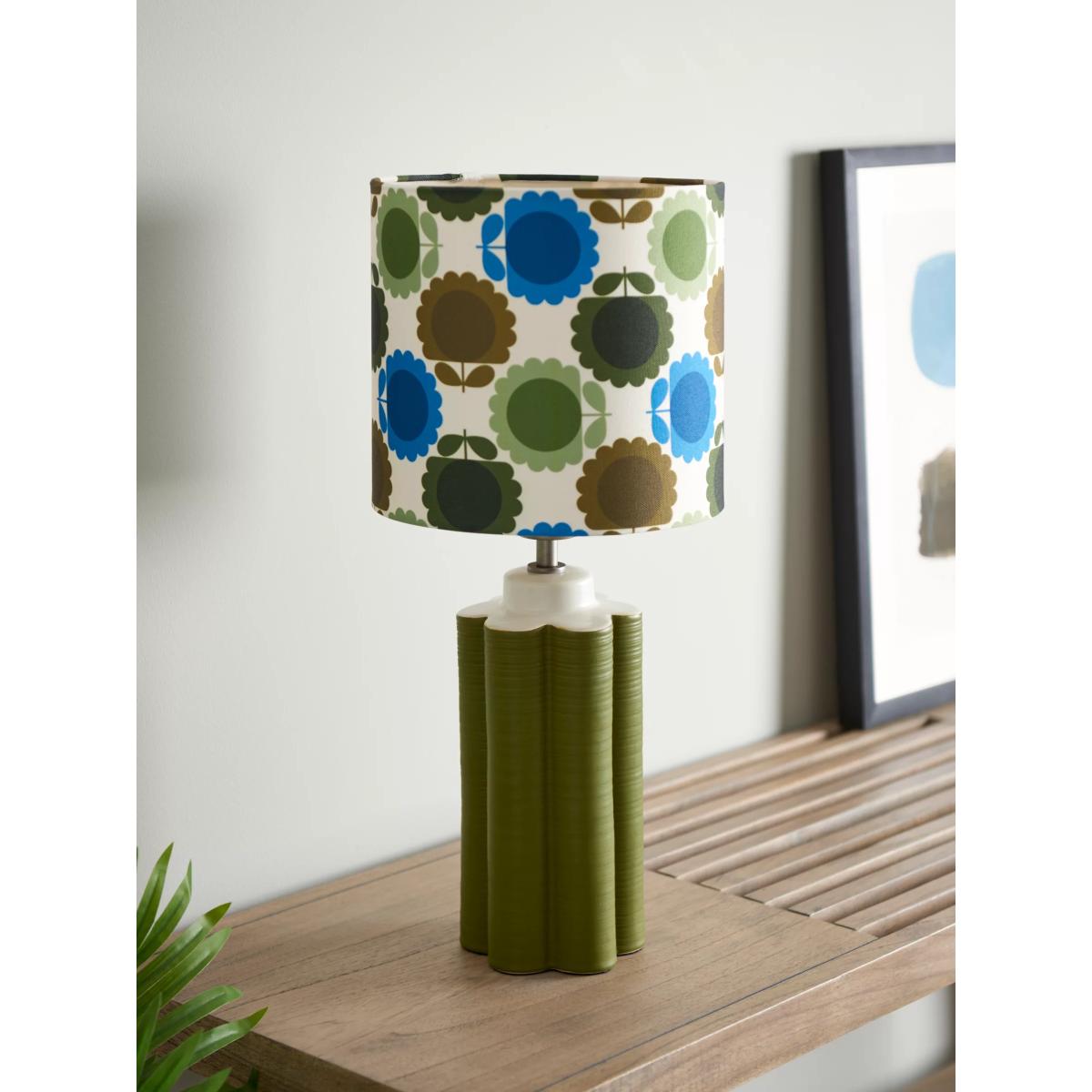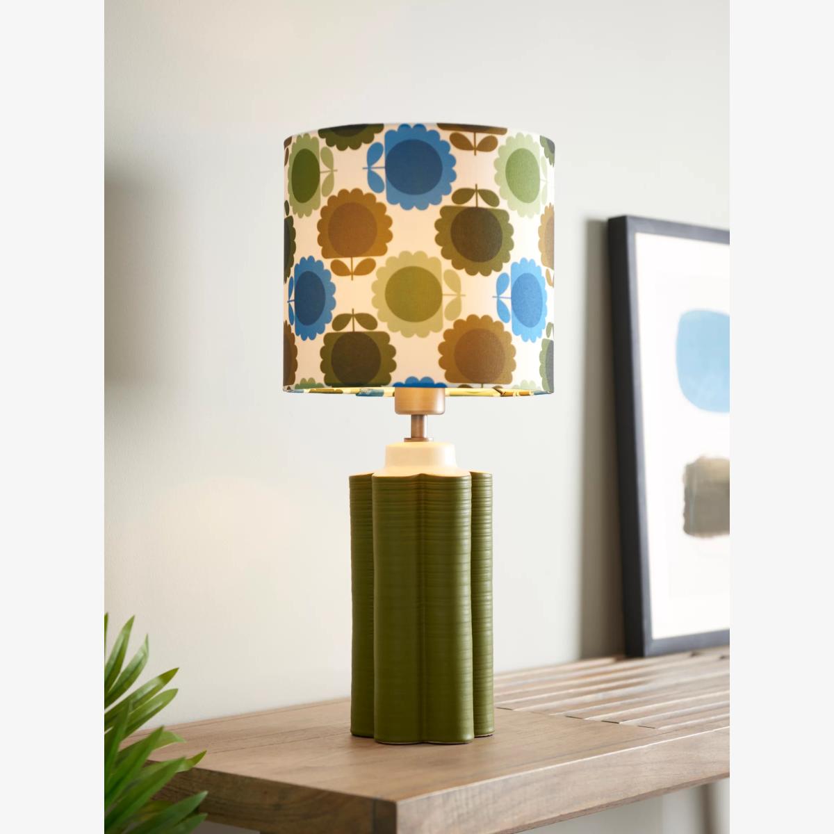 This retro table lamp celebrates the playful Orla Kiely print and pattern across both the ceramic base and fabric lampshade and will accent your space with colour. The tall scalloped base is painted in a matt glaze and the shade is made from faux linen to enhance a warm glow of light.