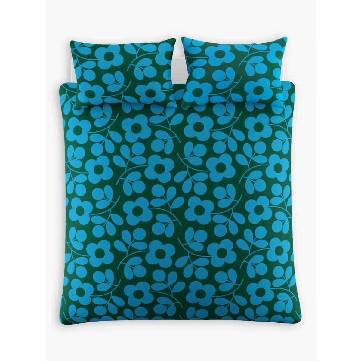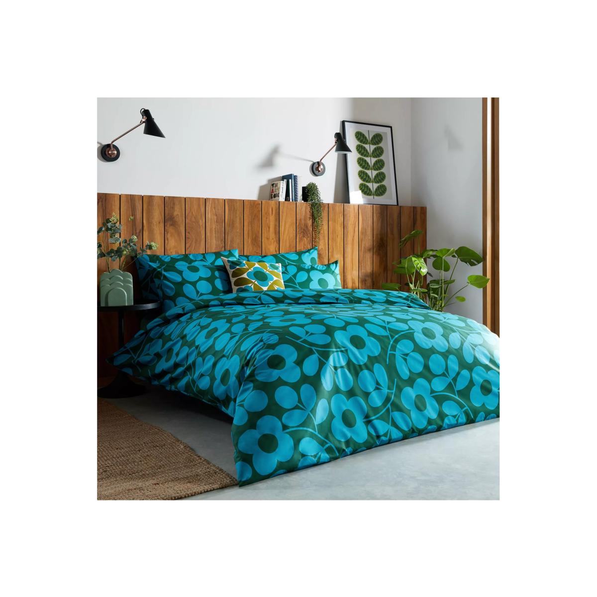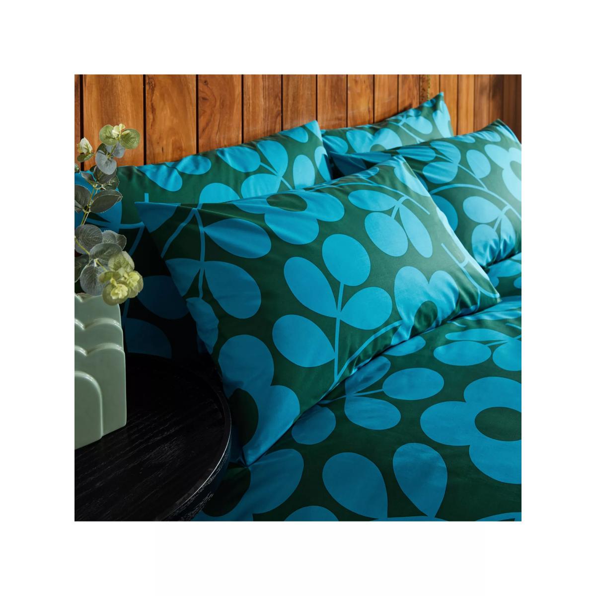 Bring a bold 60s feel to your bedroom with this stylised floral design from Orla Kiely. The Stem Sprig print decorates this 200 thread count cotton bedding in rich jade and kingfisher blue shades. Each piece is made from soft, 100% cotton which has inherent breathability to keep you comfortable throughout the night. The single set comes with one standard pillowcase. All other sizes come with two standard pillowcases. Have you thought about sheeting? Shop. Hailed by many as the 'Queen of Prints', Orla Kiely is a prolific textiles designer who has won global acclaim for her kitsch and colourful designs. Drawing inspiration from nature, her Irish heritage and her grandmother, she has encapsulated these elements in her prints, giving the fresh, vintage-inspired twist for which she is famous. Kiely’s signature retro style has become instantly recognisable as a household name, adorning everything from clothes and bags to bed linen and bathroom accessories. Bedding sizes To fit duvet/pillow size (cm) Standard pillowcase, L75 x W50cm Single duvet cover, L200 x W135cm Double duvet cover, L200 x W200cm King duvet cover, L220 x W225cm Super king duvet cover, L220 x W260cm