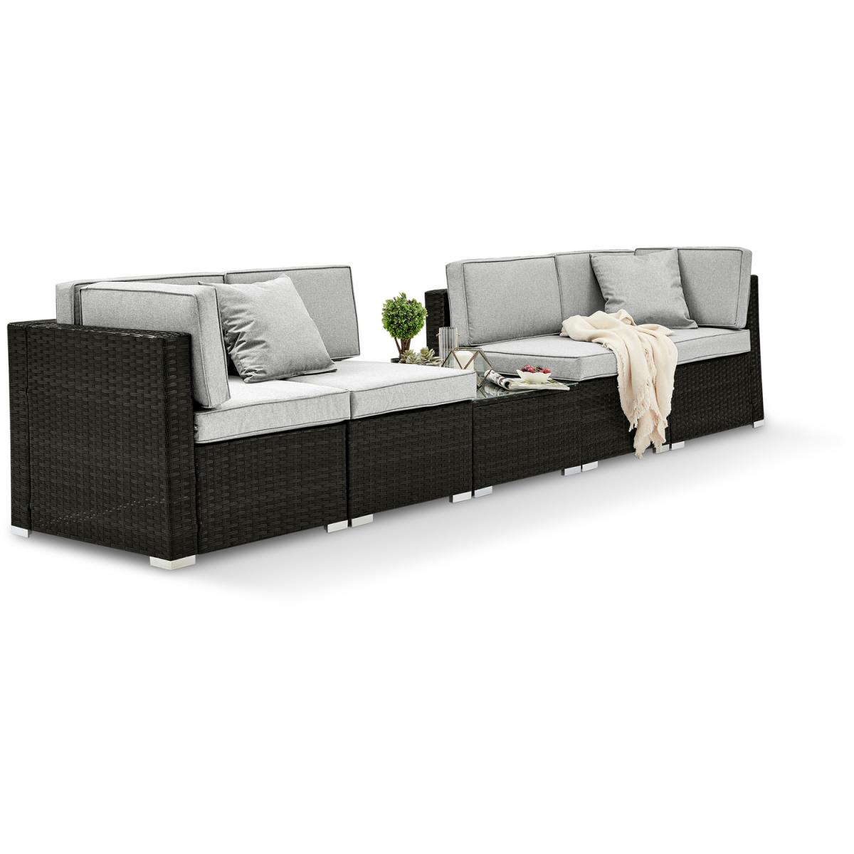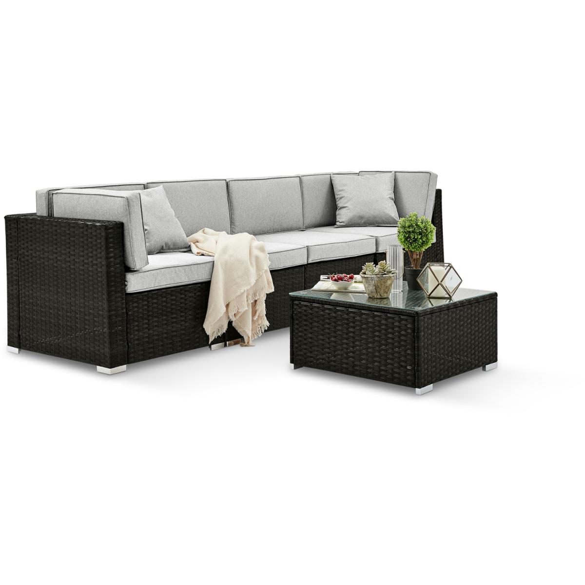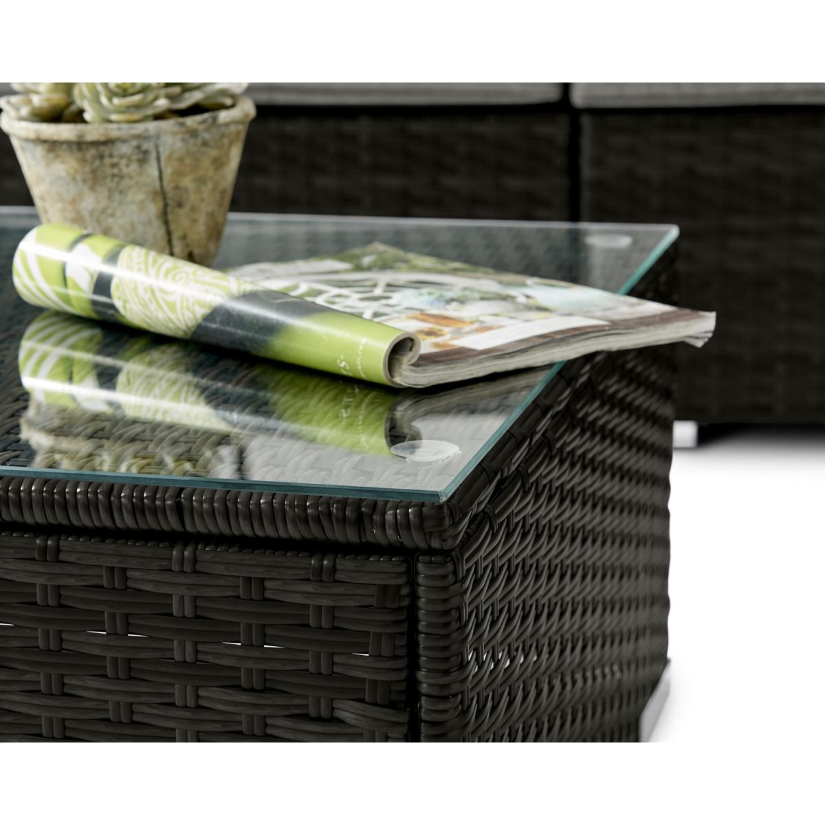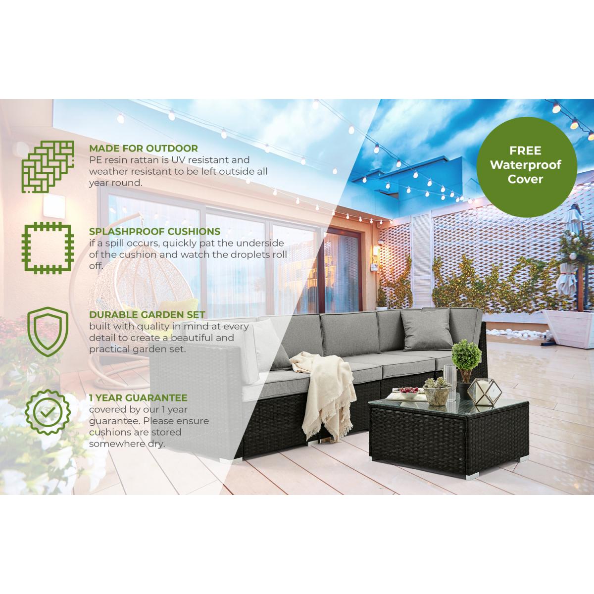 This PE resin rattan outdoor sofa is perfect for gardens of all shapes and sizes and can seat up to 4 people. Thanks to its modular design, this rattan sofa set can be arranged in lots of different shapes to fit your garden. The textured PE resin black rattan weave gives a contemporary look. The rattan frame can be left outside all year round and is easy maintenance, needing just a wipe down with a soft cloth to remove any built up dirt. The inner frame is made from metal which is strong as well as lightweight, durable and weather-resistant. The thick, foam filled seat and back cushions are 10cm thick providing comfort and support for you to sit back, relax and enjoy the sunshine. The cushions are splash resistant so if you spill a drink on the cushion you can firmly pat the underside of the cushion to encourage the droplets to roll off and avoid them soaking in. Each piece of the modular rattan sofa can be moved around to suit you, there are lots of options to suit the occasion, whether you want to stretch out and sunbathe or have lots of seating for friends and family over for a barbecue. The clips included hold the pieces together so they don't slide apart. The matching square coffee table with tempered glass top provides plenty of space for drinks and nibbles. This modular garden sofa requires assembly with detailed guides included with your new sofa. Our customer service team are also available if you have any questions. This set includes a FREE water resistant cover but please note, this is not fully waterproof and you should still store your cushion somewhere dry during wet weather and through winter