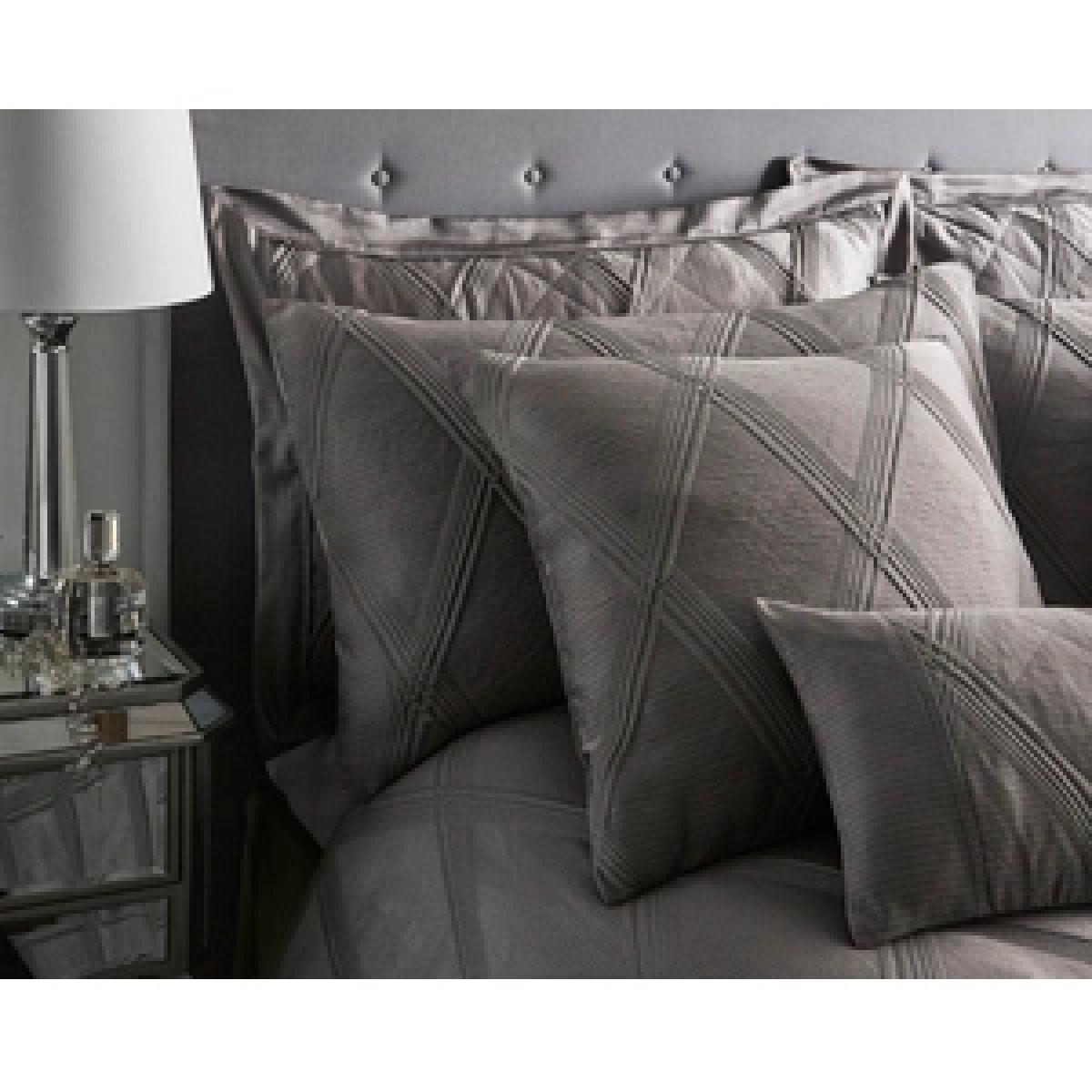 Wonderfully modern jacquard, a quality raised weave in a diamond formation crisscrossing against a pencil line backdrop in fashionable tones of warm charcoal grey. The decadent look can be completed with a sumptuous quilted throw that is accentuated with a plain woven border.