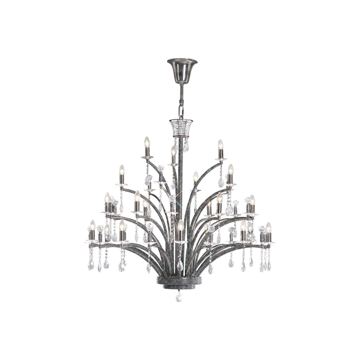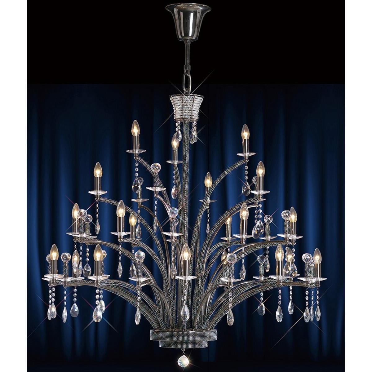 A magnificent multi-arm fitting in Black Chrome or Gold finish with half of the arms hand wrapped in a striking Asfour clearblack crystal sheet. The remaining arms boast a large crystal sphere supported by tubes wrapped in a crystal sheet on a crystal pan. The fixtures are decorated throughout with Asfour crystal pendalogues. Complimenting wall lamps are available from the Elena and Fiore ranges. The sheer scale and attraction of this collection is spectacular.