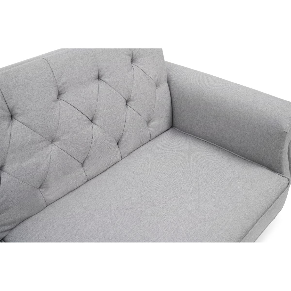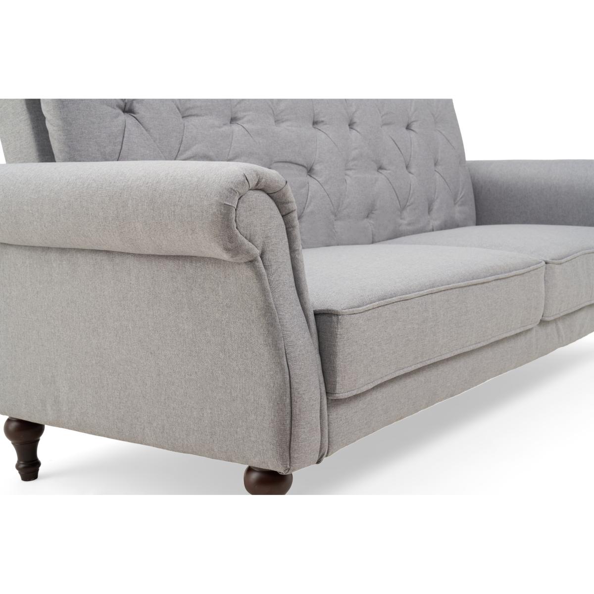 The Orlando Grey Linen Sofa Bed is classically stylish and incredibly practical. With Chesterfield-inspired design features and a fold-down design, the linen sofa bed has elegant buttoning and rolled arms and is complete with dark wood feet. Chesterfield-style sofa bed. Conveniently folds down into a handy guest bed. Stylish, buttoned design on the backrest. Comfortable deep-filled seat cushions. Classic rolled armrests. Complete with ornate dark wood feet