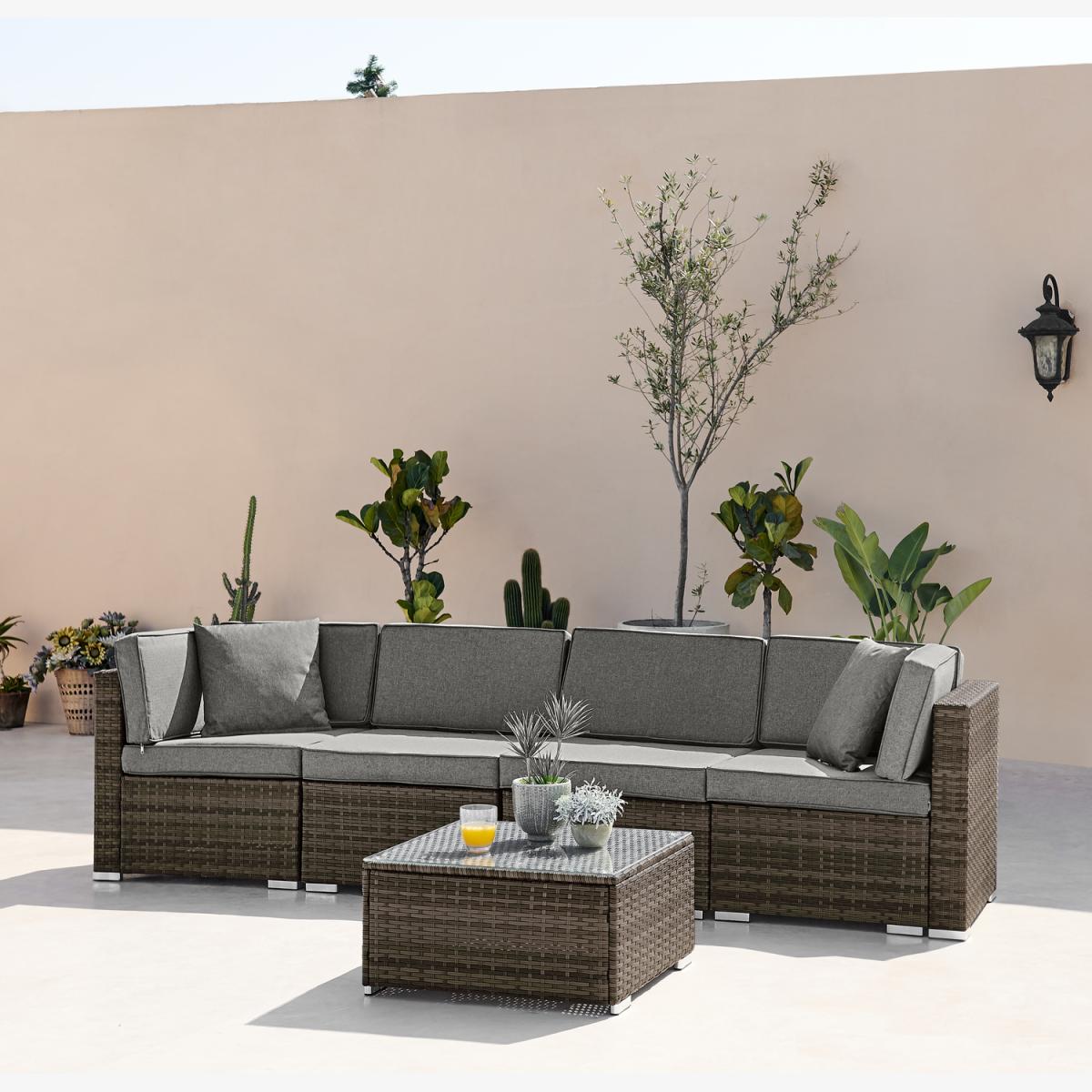 This PE resin rattan outdoor sofa is perfect for gardens of all shapes and sizes and can seat up to 4 people. Thanks to its modular design, this rattan sofa set can be arranged in lots of different shapes to fit your garden. The textured PE resin brown rattan weave gives a natural look. The rattan frame can be left outside all year round and is easy maintenance, needing just a wipe down with a soft cloth to remove any built up dirt. The inner frame is made from metal which is strong as well as lightweight, durable and weather-resistant.