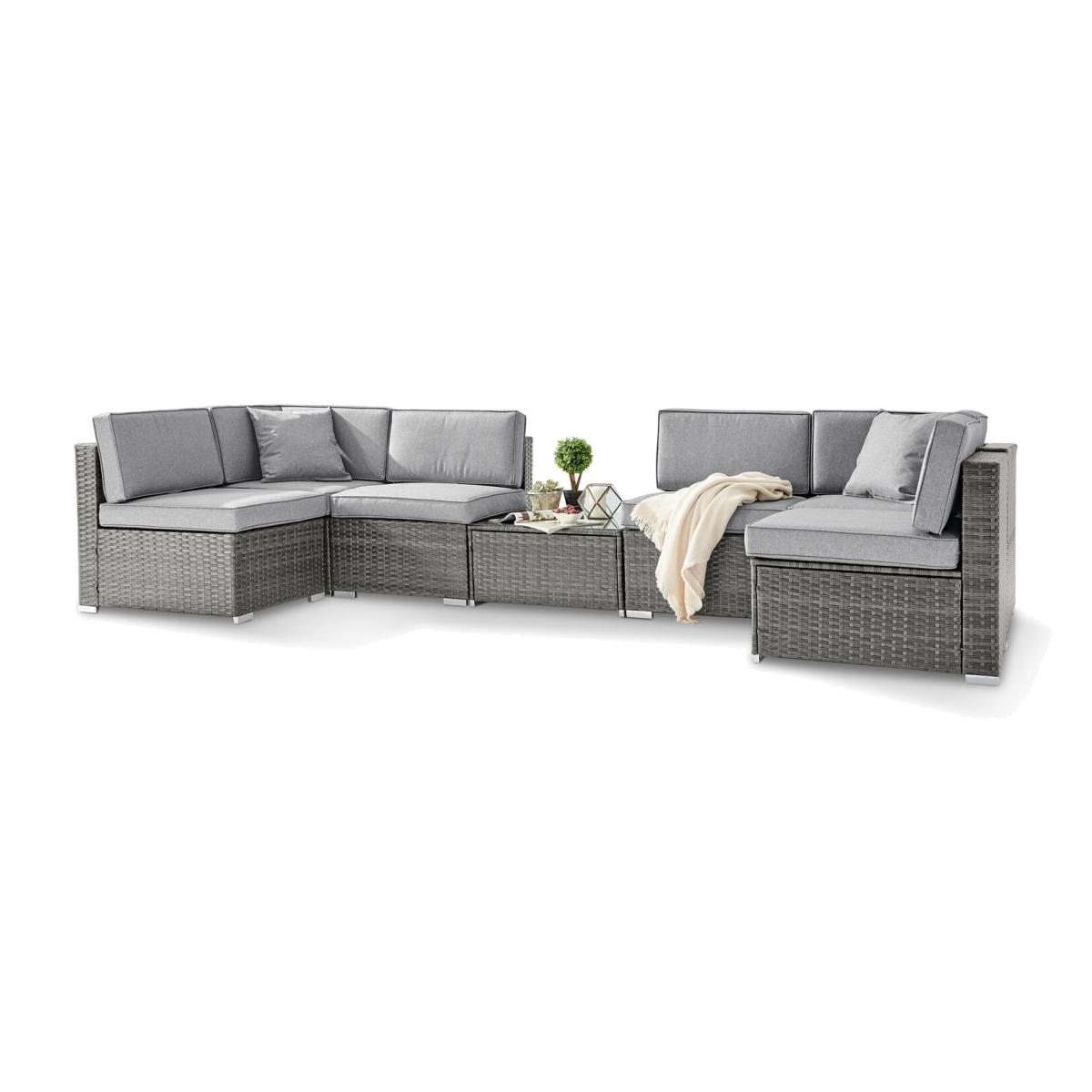 This PE resin rattan outdoor sofa is perfect for gardens of all shapes and sizes and can seat up to 6 people. Thanks to its modular design, this rattan sofa set can be arranged in lots of different shapes to fit your garden. The textured PE resin rattan weave gives a natural boldness with its slick weave. The rattan frame can be left outside all year round and is easy maintenance, needing just a wipe down with a soft cloth to remove any built-up dirt. The inner frame is made from especially a treated aluminium frame which is strong as well as lightweight, durable and weather-resistant. The thick, foam-filled seat and back cushions are 10cm thick providing comfort and support for you to sit back, relax and enjoy the sunshine. The cushions are splash resistant so if you spill a drink on the cushion you can firmly pat the underside of the cushion to encourage the droplets to roll off and avoid them soaking in. Each piece of the modular rattan sofa can be moved around to suit you from an L shape corner sofa, U shape sofa or a cosy set of a 3 and 2 seat sofa. There are lots of options to suit the occasion, whether you want to stretch out and sunbathe or have lots of seating for friends and family over for a barbecue. The clips included hold the pieces together so they don't slide apart. The matching square coffee table with a tempered glass top provides plenty of space for drinks and nibbles. This modular garden sofa requires assembly with detailed guides included with your new sofa. Our customer service team are also available if you have any questions. This set includes a FREE water-resistant to cover but please note, that this is not fully waterproof and you should still store your cushion somewhere dry during wet weather and through winter.