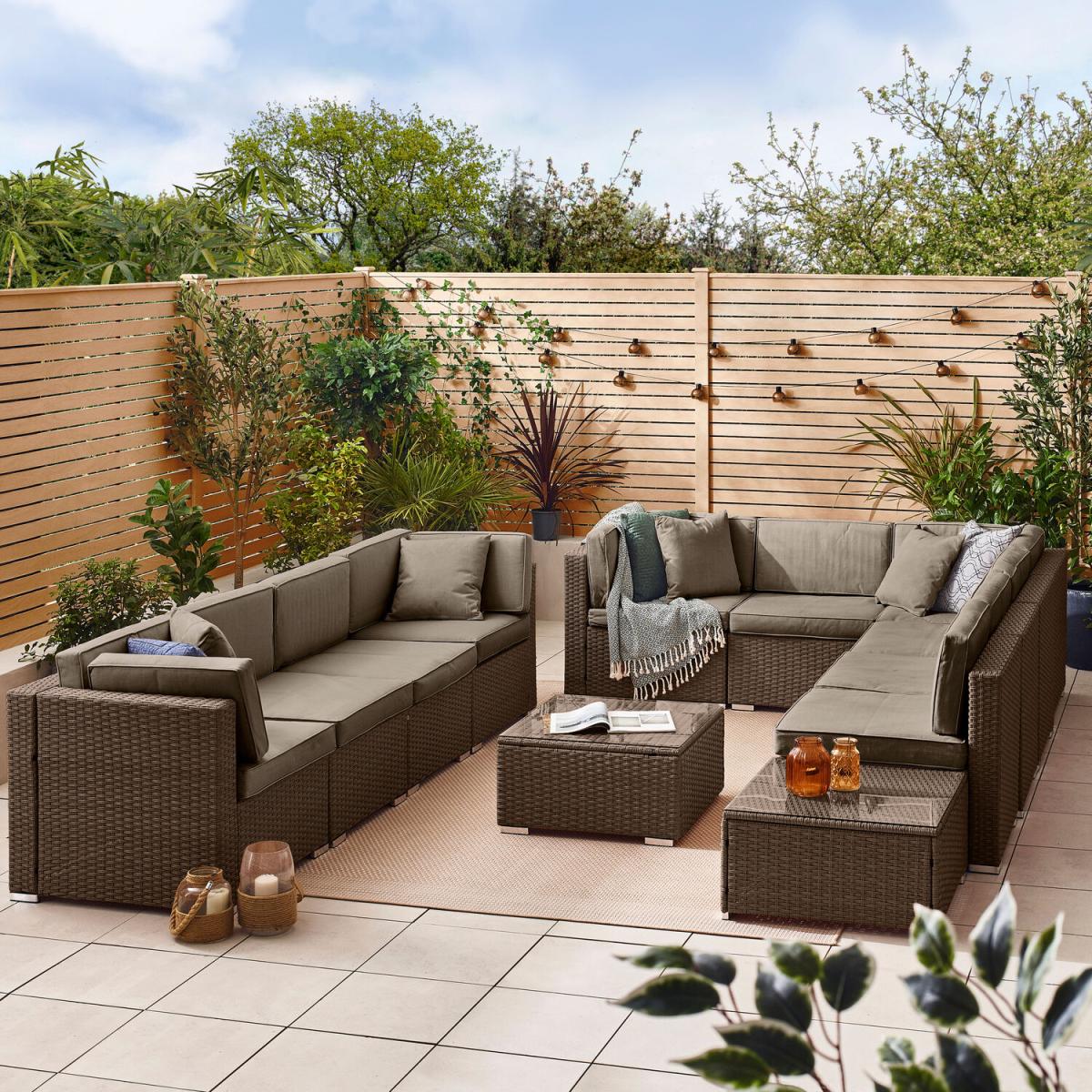 Our Orlando 10-seat PE resin rattan extra-size outdoor sofa is perfect for gardens of all shapes. Thanks to its modular design, this rattan sofa set can be arranged in many different shapes to fit your garden. The textured PE resin rattan weave gives a sunny, terracotta look and is complimented by the cushions. The 2x matching square coffee tables with tempered glass tops provide plenty of space for drinks and nibbles. The rattan frame can be left outside all year round and is easy to maintain, needing just a wipe down with a soft cloth to remove any built-up dirt. The inner frame is made from metal which is strong as well as lightweight, durable and weather-resistant. The thick, foam-filled seat and back cushions are 10cm thick providing comfort and support for you to sit back, relax and enjoy the sunshine. The cushions are splash-resistant so if you spill a drink on the cushion you can firmly pat the underside of the cushion to encourage the droplets to roll off and avoid them soaking in. Each piece of the modular rattan sofa can be moved around to suit you, there are lots of options to suit the occasion, whether you want to stretch out and sunbathe or have lots of seating for friends and family for a barbecue. The clips included hold the pieces together so they don't slide apart. This modular garden sofa requires assembly with detailed easy-to-follow instructions included. This set includes 2x FREE water resistant covers but please note, these are not fully waterproof and you should still store your cushion somewhere dry during wet weather and through winter.