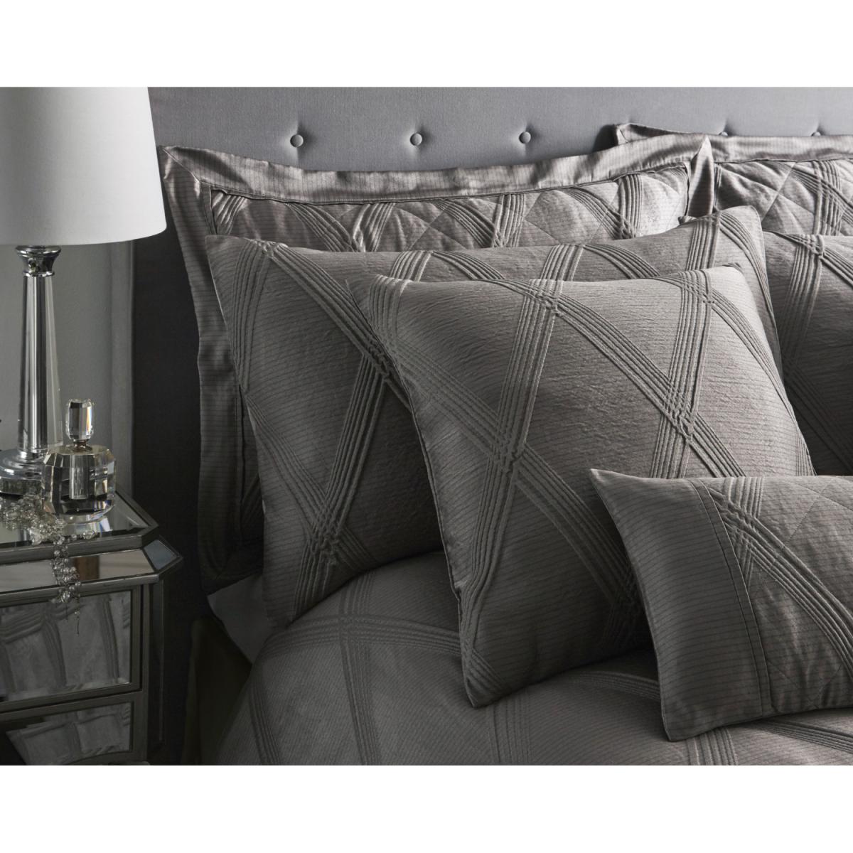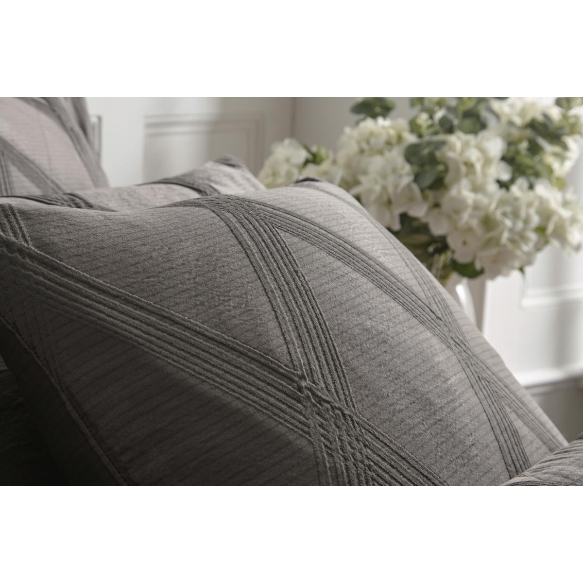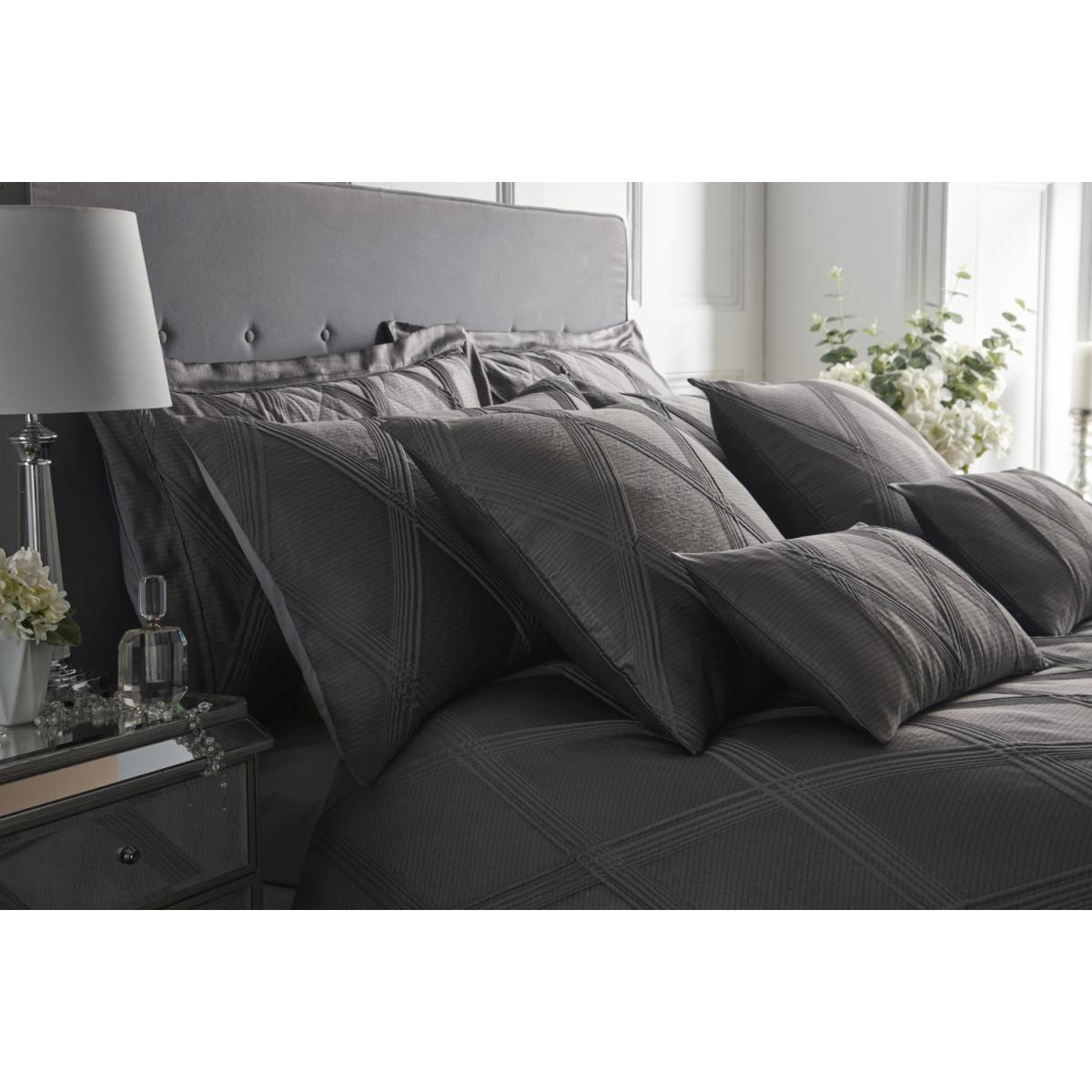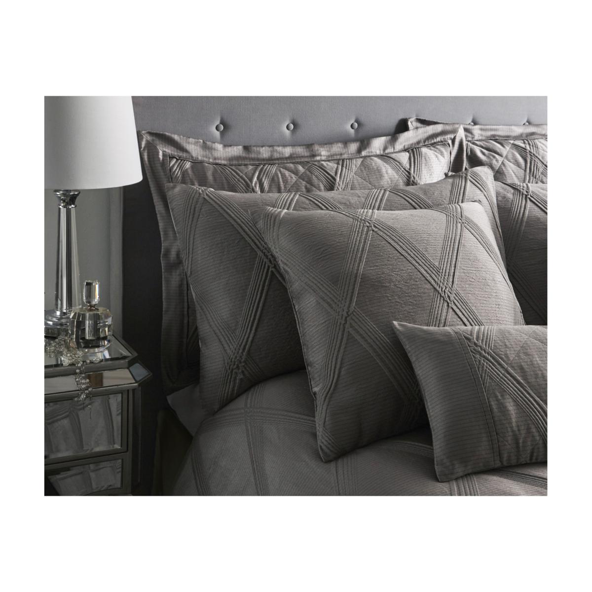 Wonderfully modern jacquard, a quality raised weave in a diamond formation crisscrossing against a pencil line backdrop in fashionable tones of warm charcoal grey. The decadent look can be completed with a sumptuous quilted throw that is accentuated with a plain woven border.