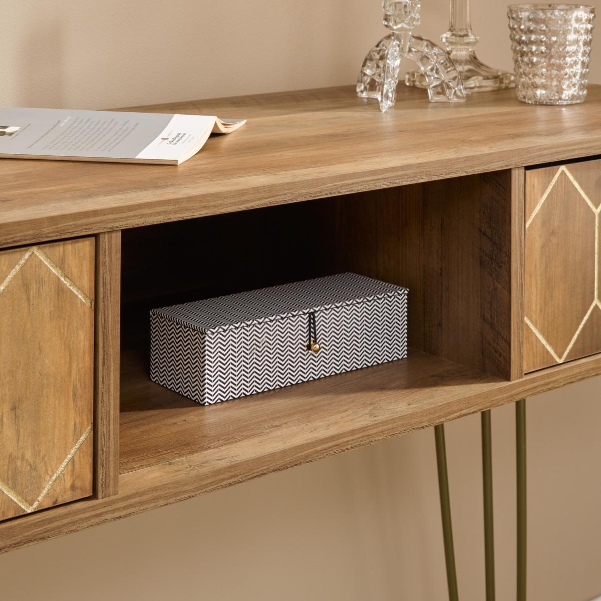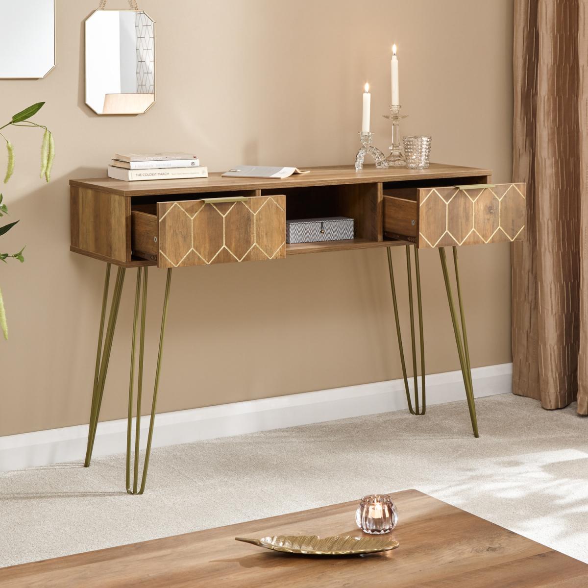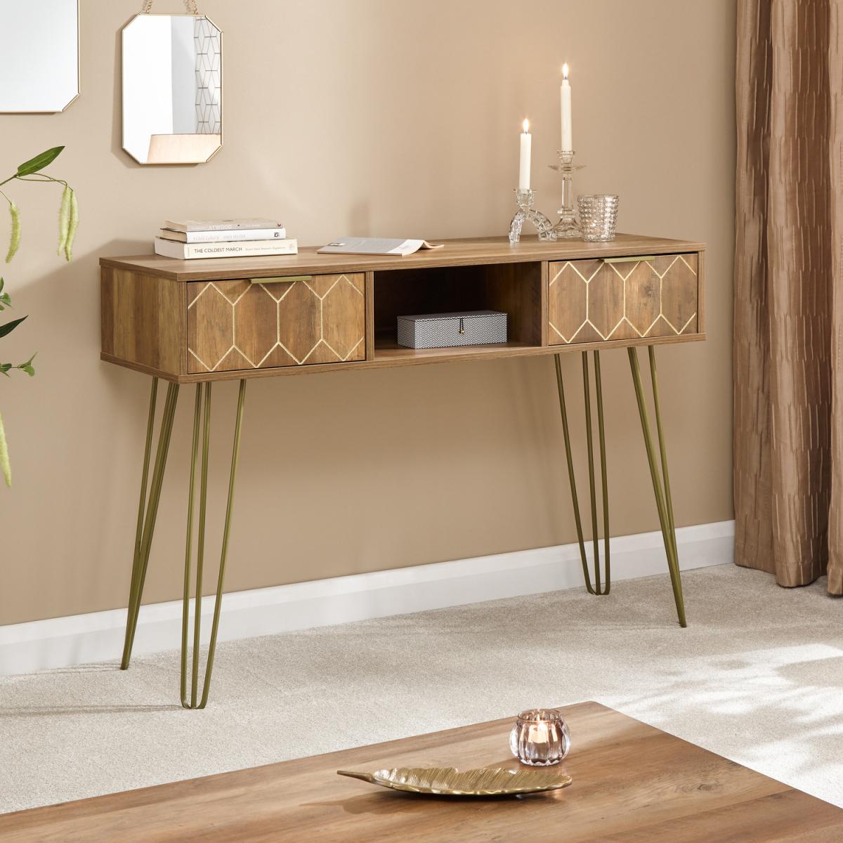 Add a touch of understated glamour to your living space with this retro-inspired console table. The pared-back profile of the desktop allows its design credentials to shine through. The simple mango-effect construction creates a light, neutral palette that's enhanced by delicate engraved metallic detail in a cool geometric design to the twin drawers - each of which is accessorised with neat drawer pulls. A central cubbyhole is ideal for books, magazines and directories. The slender contrasting hairpin legs provide an elegant counterpoint and perfectly complement the vintage look and feel.