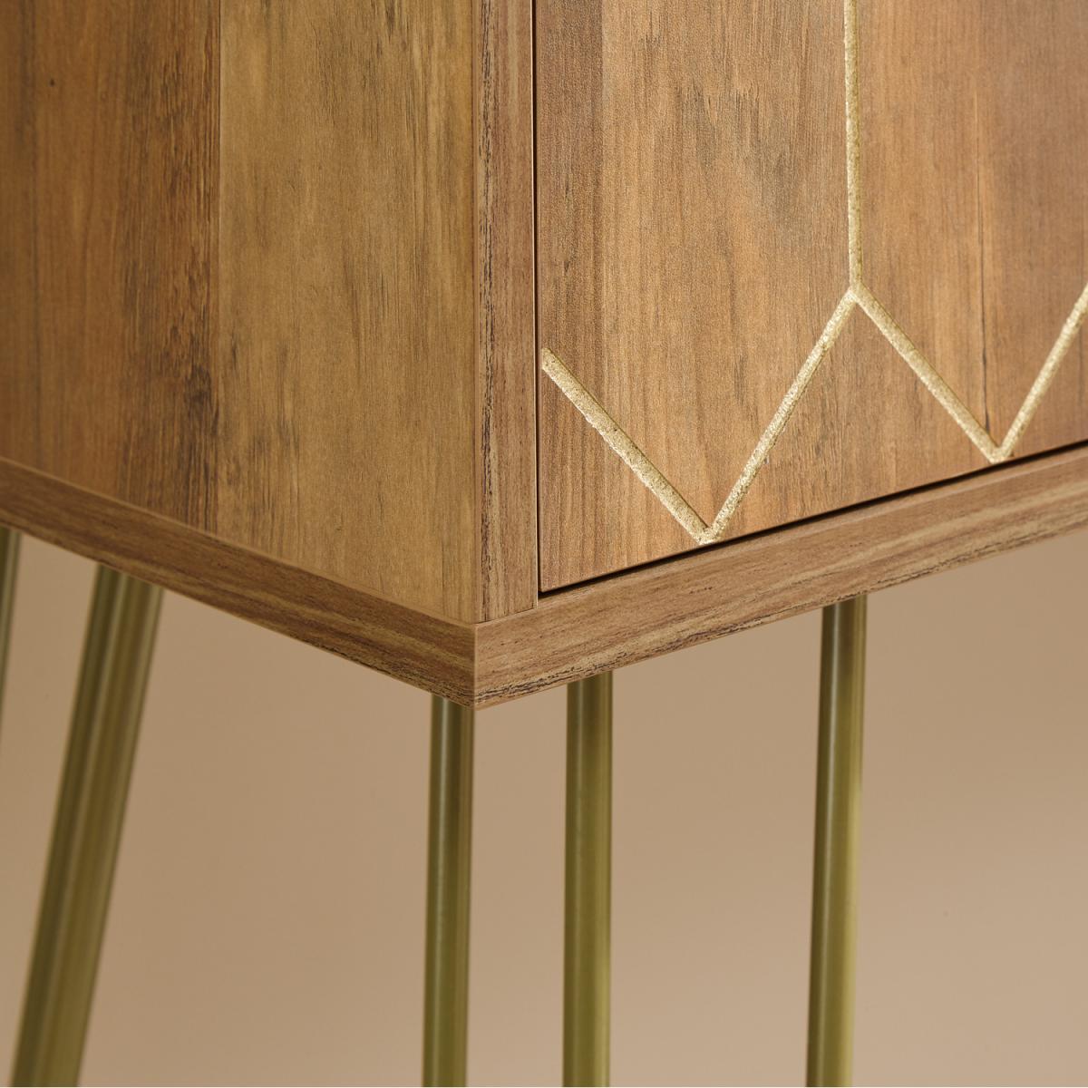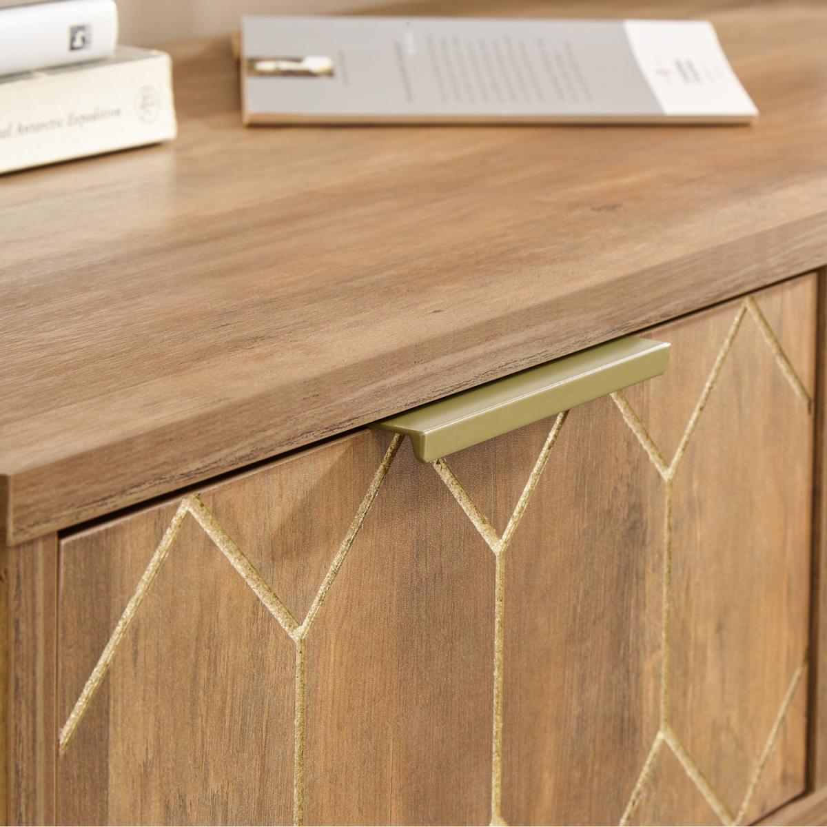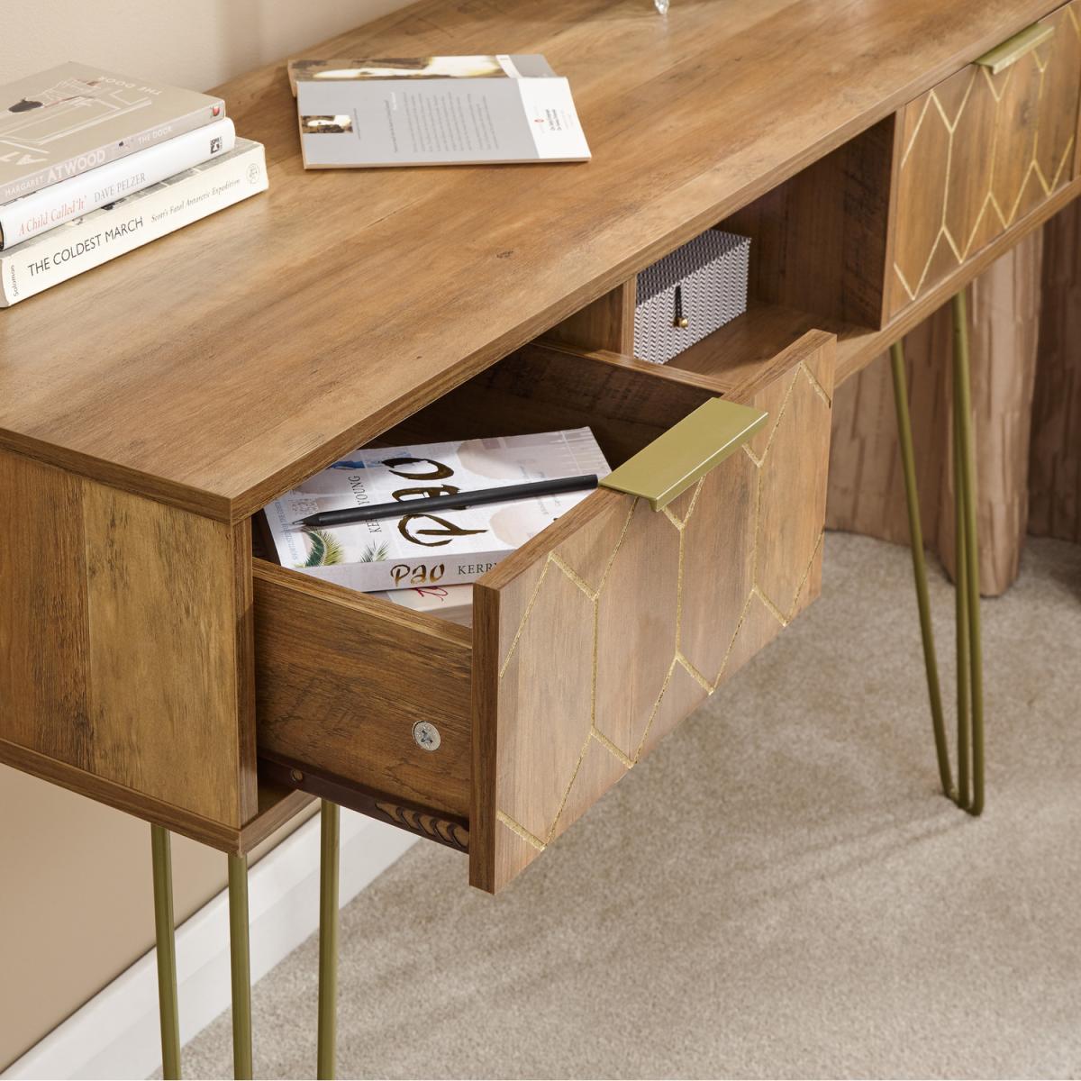 Add a touch of understated glamour to your living space with this retro-inspired console table. The pared-back profile of the desktop allows its design credentials to shine through. The simple mango-effect construction creates a light, neutral palette that's enhanced by delicate engraved metallic detail in a cool geometric design to the twin drawers - each of which is accessorised with neat drawer pulls. A central cubbyhole is ideal for books, magazines and directories. The slender contrasting hairpin legs provide an elegant counterpoint and perfectly complement the vintage look and feel.