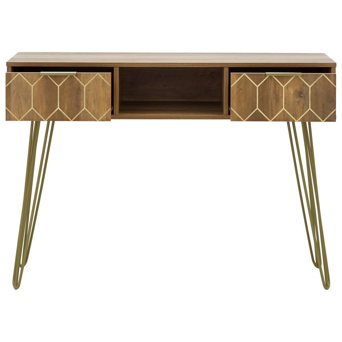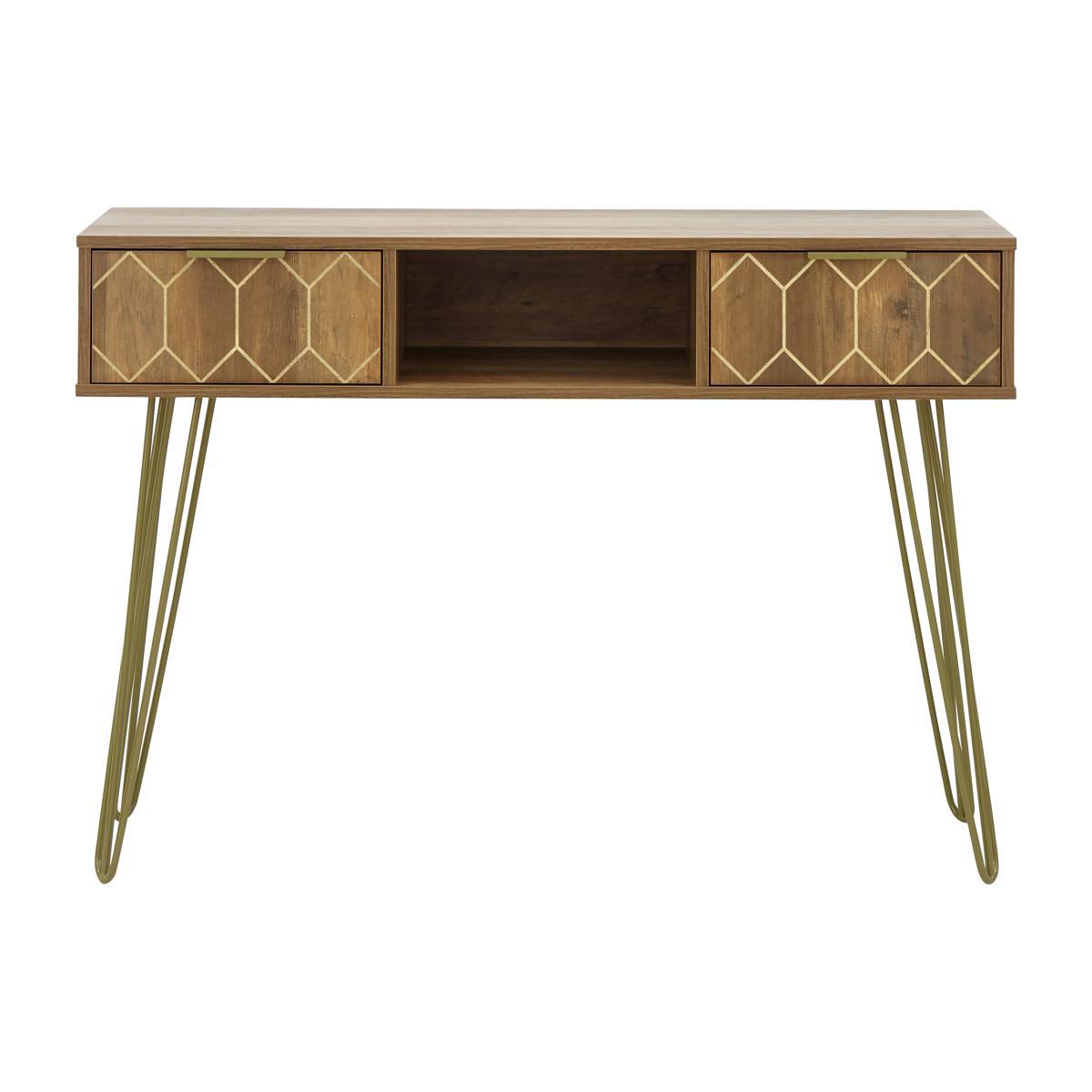 Add a touch of understated glamour to your living space with the retro-inspired Orleans Console Table. The simple mango-effect construction creates a warm, neutral palette that’s enhanced by delicate engraved metallic detail in a modern geometric design. The twin drawers are also accessorised with neat gold-coloured drawer pulls that perfectly complement the elegant hairpin legs. The spacious central cubbyhole is ideal for books, magazines and directories whilst the two large drawers provide plenty of practical storage space. Do not use solvent based cleaners or detergents as they can bleach or damage the product.