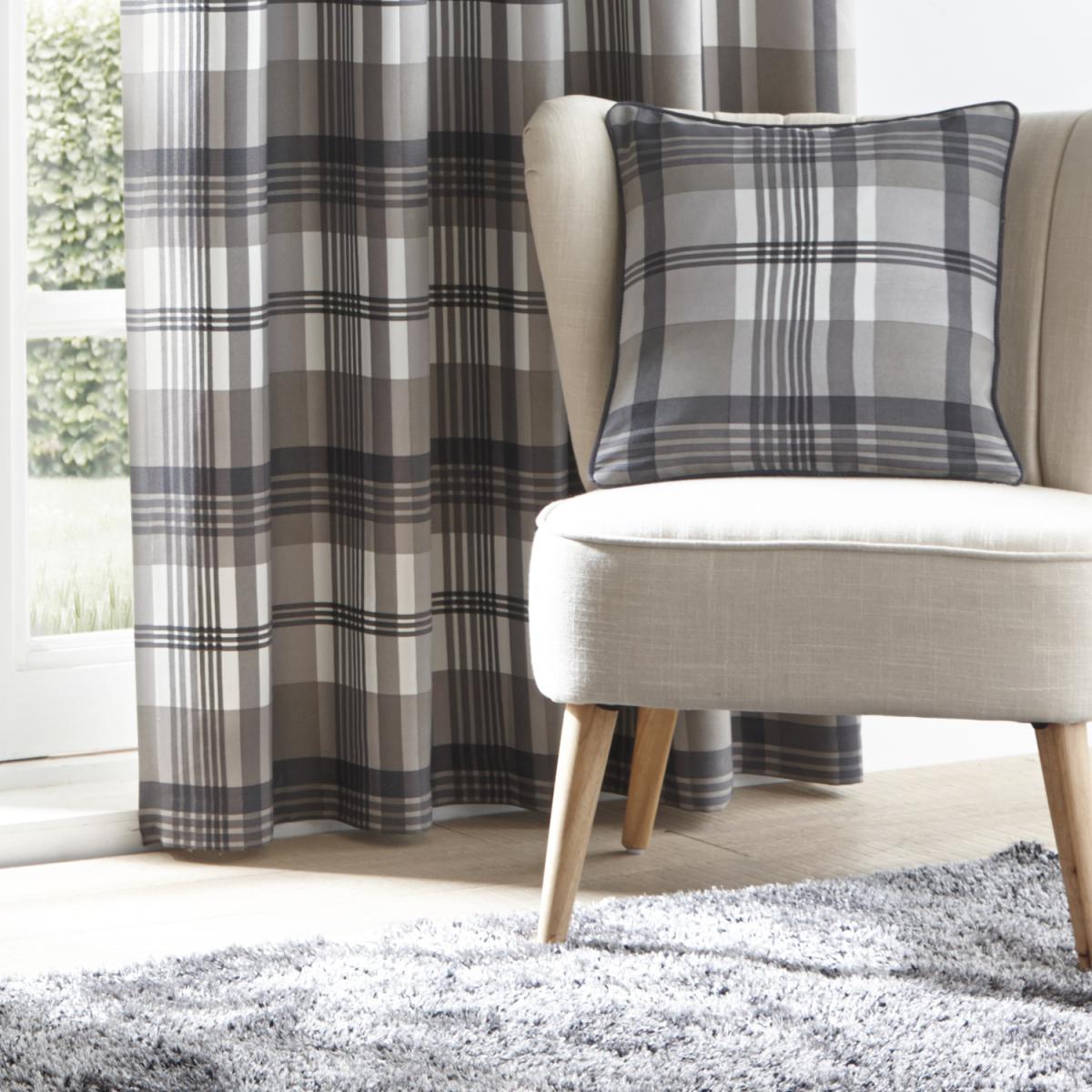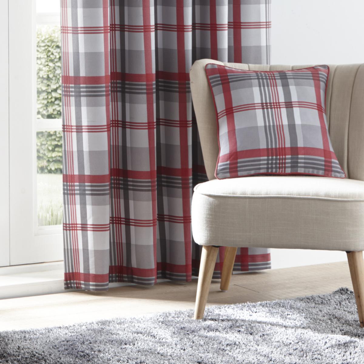 A modern checked print with a solid top border available in red and Charcoal colourways.
