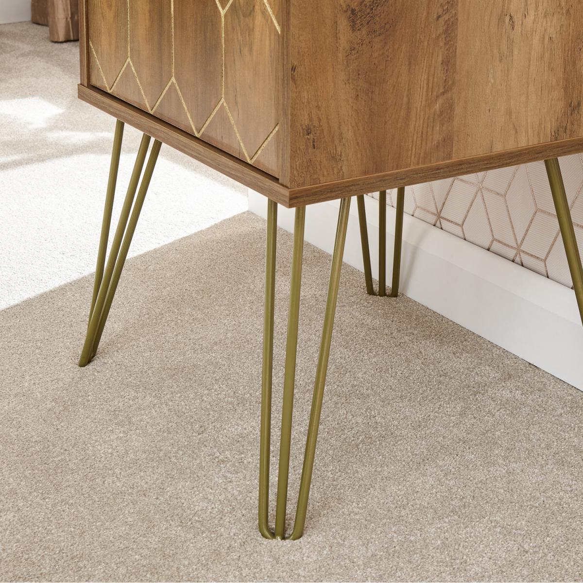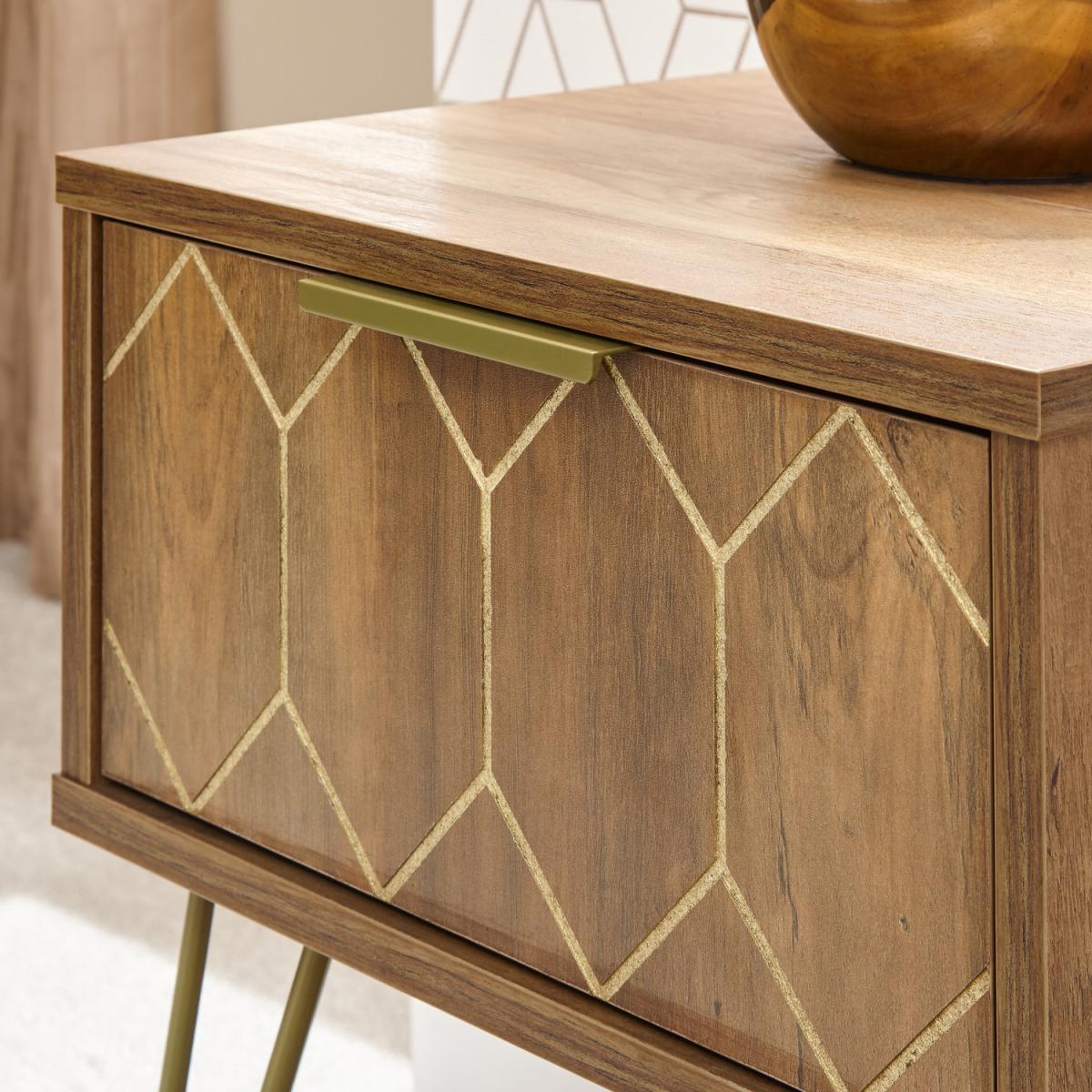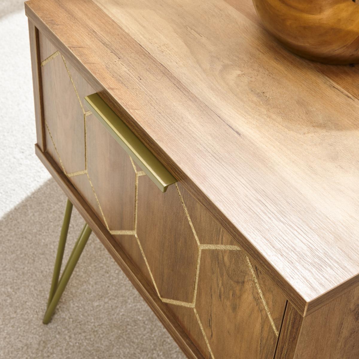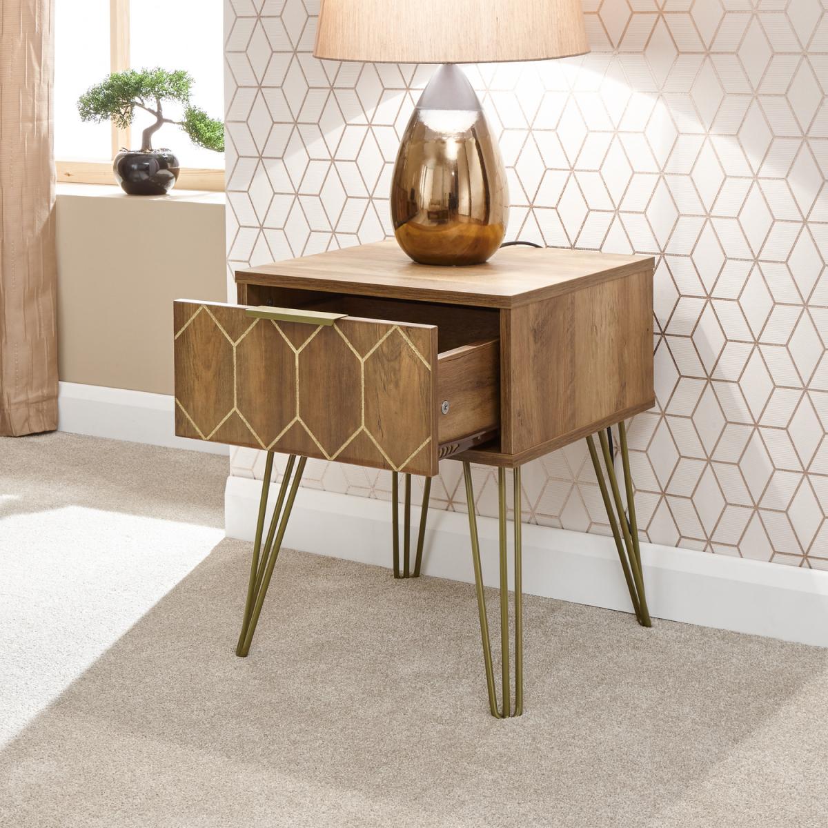 Spruce up your living space with this retro-inspired lamp table. The simplicity of the design is its biggest strength, a neat mango-effect box is mounted on slender hairpin legs to provide the ideal backdrop to a striking lamp or objet d'art. Surface detail is subtle, yet effective. A delicate engraved metallic thread in a geometric design adorns the drawer front and is accessorised with a single, simple burnished drawer pull. The clever double-sided construction means it can be sited anywhere in a room - it would make a cool drinks table at a party.