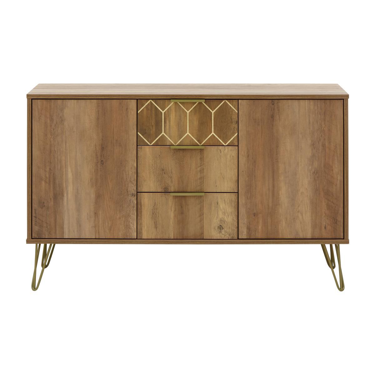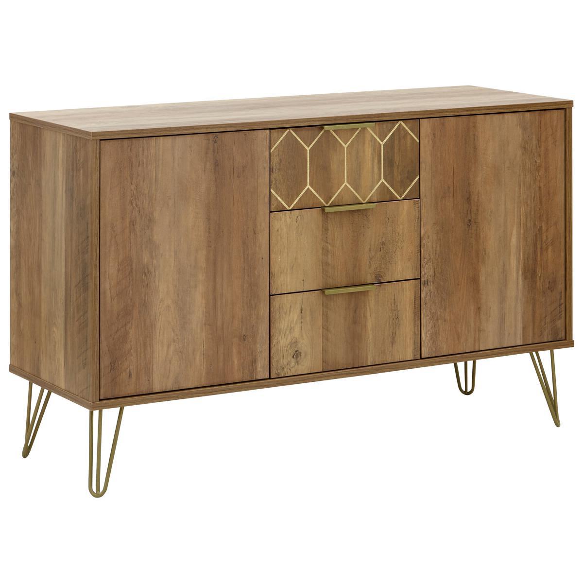 I love how this brown sideboard brings warmth and a touch of mid-century flair into a room without feeling over-the-top. Its oak-effect finish and brass-tone legs work equally well in Scandi-inspired living areas, eclectic boho schemes or pared-back contemporary spaces. The subtle geometric inlay on the drawers adds just enough interest to catch the eye without competing with other textures. For styling, try balancing a tall ceramic lamp and a sculptural vase on one side, with a stack of coffee-table books and a small tray or plant on the other. Leave the top drawer or open a door now and then to showcase woven baskets or your favourite glassware. Against a plain wall you could hang a round mirror or a set of simple frames above it to complete the look.