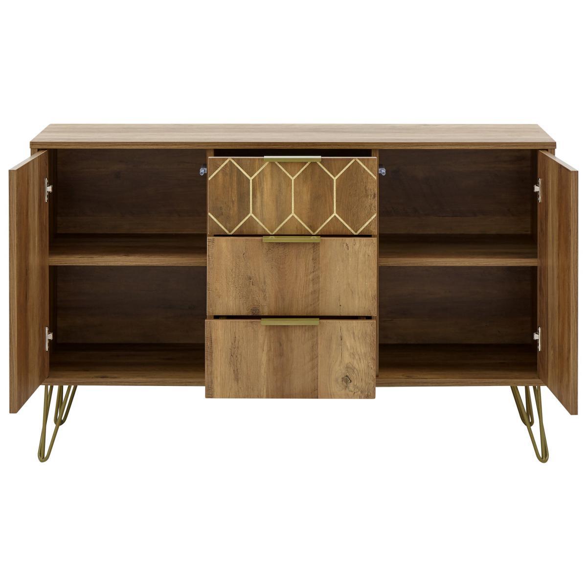 Add a touch of understated glamour to your living space with the retro-inspired Orleans Sideboard. The simple mango-effect construction creates a warm, neutral palette that’s enhanced by delicate engraved metallic detail in a modern geometric design. The three central drawers are also accessorised with neat gold-coloured drawer pulls that perfectly complement the elegant hairpin legs. Complete with two push-to-open cupboards that create a clean look, this stunning sideboard would make a stylish and practical solution to any room. Do not use solvent based cleaners or detergents as they can bleach or damage the product.