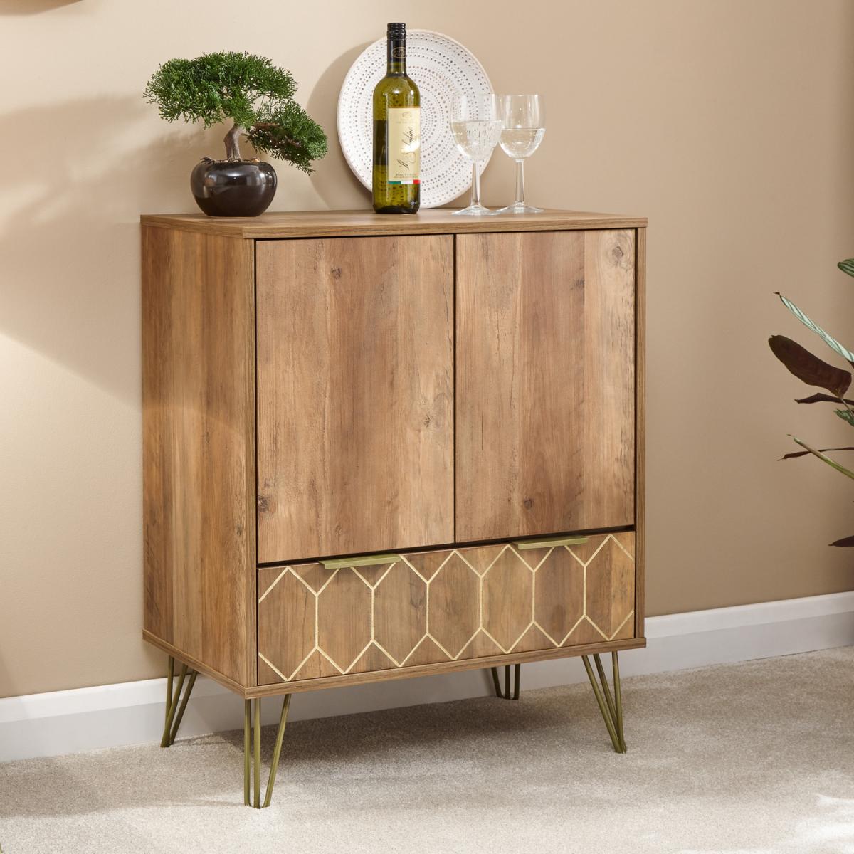 If you like entertaining, you'll love this vintage-feel Orleans wine cabinet. Perfect for a lounge or dining room, the cabinet is a stylish furnishing piece in its own right, the cool mango-effect finish is accentuated by a subtle metallic engraving detail and adorned with smart retro handles. Push-to-open double doors reveal shelves for wine glasses, as well as eight handy bottle cubbies, while a lower drawer is the ideal place for bottle openers, coasters and napkins. Mounted on mid-century-style contrasting hairpin legs.