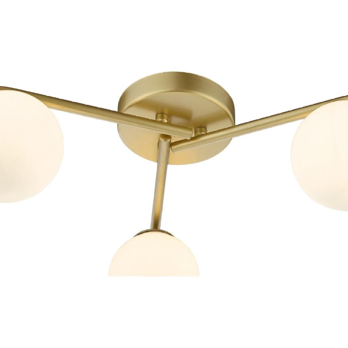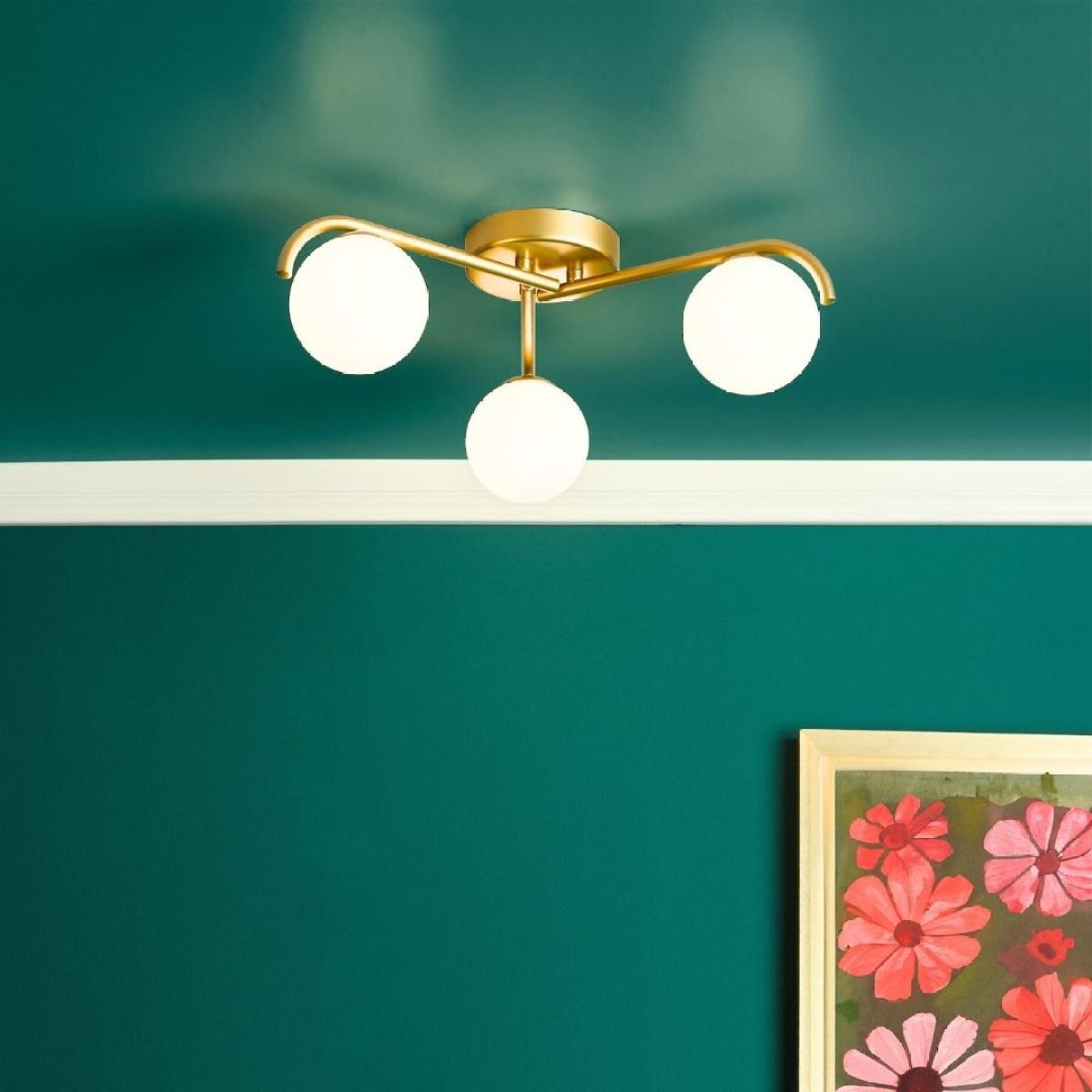 Orlena 3-light flush ceiling light with opal glass globe shades and curved, satin gold frame. Aa stunning homage to mid-century design with a contemporary twist, the Orlena flush ceiling light seamlessly combines form and function. Perfect for homes with lower ceilings, this fixture makes a striking addition to modern and retro-inspired interiors alike. The Orlena features opal glass globe shades that exude a soft, diffused glow, creating an inviting ambiance in any room. The curved satin gold frame adds a touch of glamour and sophistication, elevating the aesthetic of your space. Orlena 3-light flush ceiling light with opal glass globe shades and curved, satin gold frame. Aa stunning homage to mid-century design with a contemporary twist, the Orlena flush ceiling light seamlessly combines form and function. Perfect for homes with lower ceilings, this fixture makes a striking addition to modern and retro-inspired interiors alike. The Orlena features opal glass globe shades that exude a soft, diffused glow, creating an inviting ambiance in any room. The curved satin gold frame adds a touch of glamour and sophistication, elevating the aesthetic of your space.