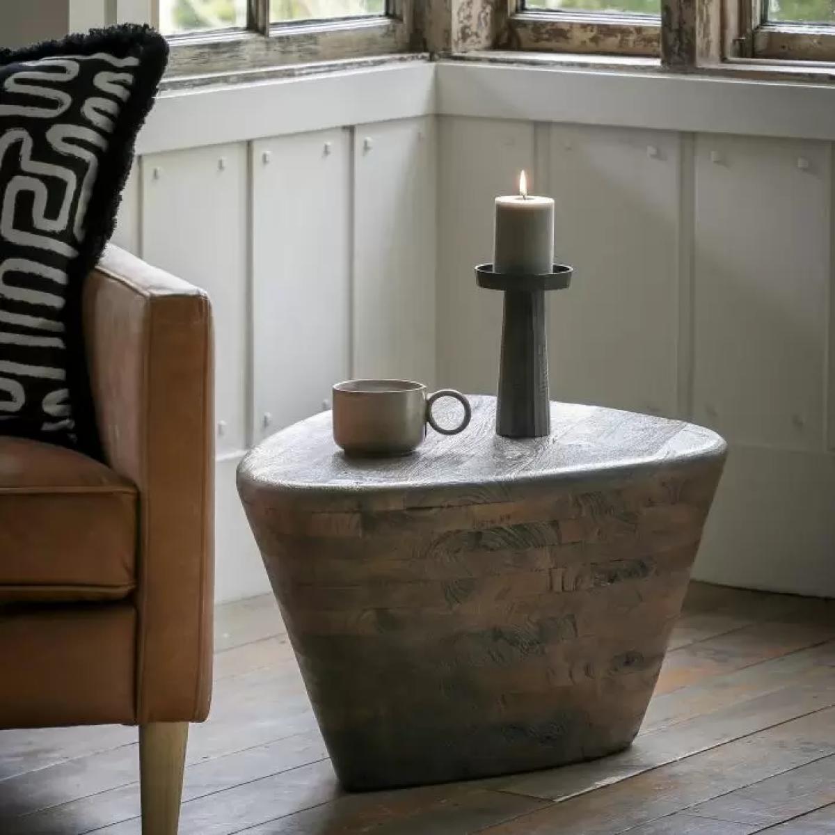 This stunning mango wood side table has the most unusual triangular shape with a patinated laminated angled base, which is hollow underneath, making it light & easy to move around. A matching coffee table is available. Material:Mango Wood 100%. Colour/Finish: Dark Wood.