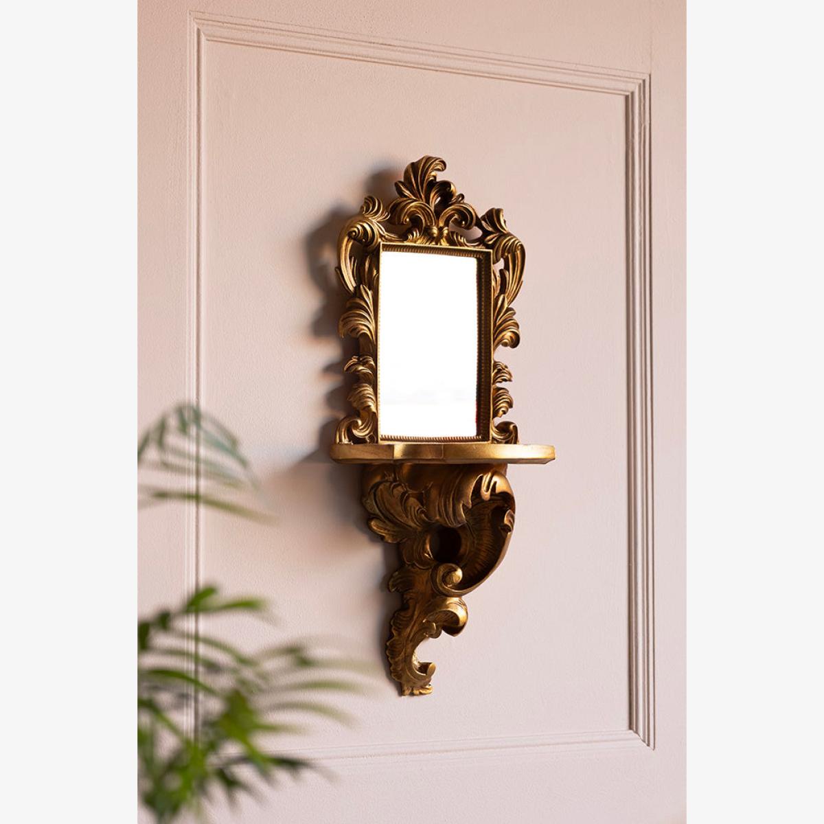 <!--td --> If opulence had a home accessory, this would be it. Dripping in Baroque-inspired grandeur, this gold mirror with shelf is the perfect mix of fabulous and functional. With its ornate, curling details and rich gilded finish, this wall mirror instantly transforms any space into a mini Versailles moment. Flawless for a quick glance in the mirror, and the shelf is a perfectly petite stage for your favourite lipstick, little vase or that one ornament that just deserves to be shown off. Whether it's hung in your hallway, bedroom or even part of a gallery wall, this beauty is an instant elevate-the-room situation. It's decadent, sophisticated and just the right touch of opulent drama. Your home should be as fabulous as you are. - Ornamental Wall Shelf with Mirror- Measures: W21.5cm x H49.5cm x D12.5cm - Material: Resin