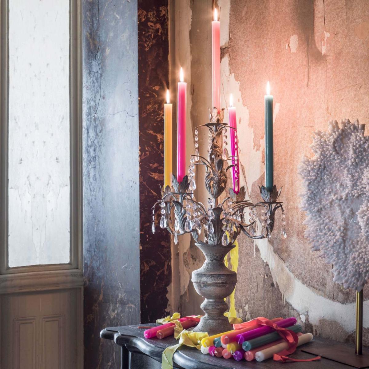 Indulge your fantasies of fine dining a la Downton with this exquisite candelabra. Acrylic droppers catch the light while burnished pewter metal casts a warm glow. Instant old-world glamour for any celebration.