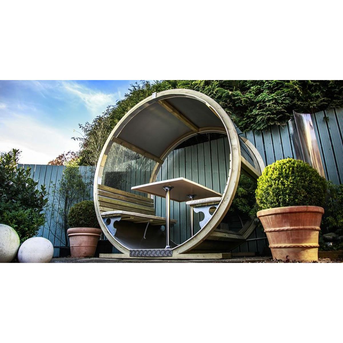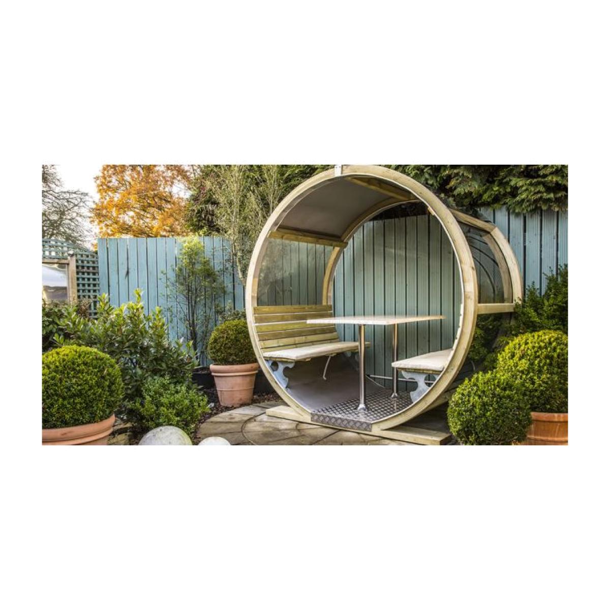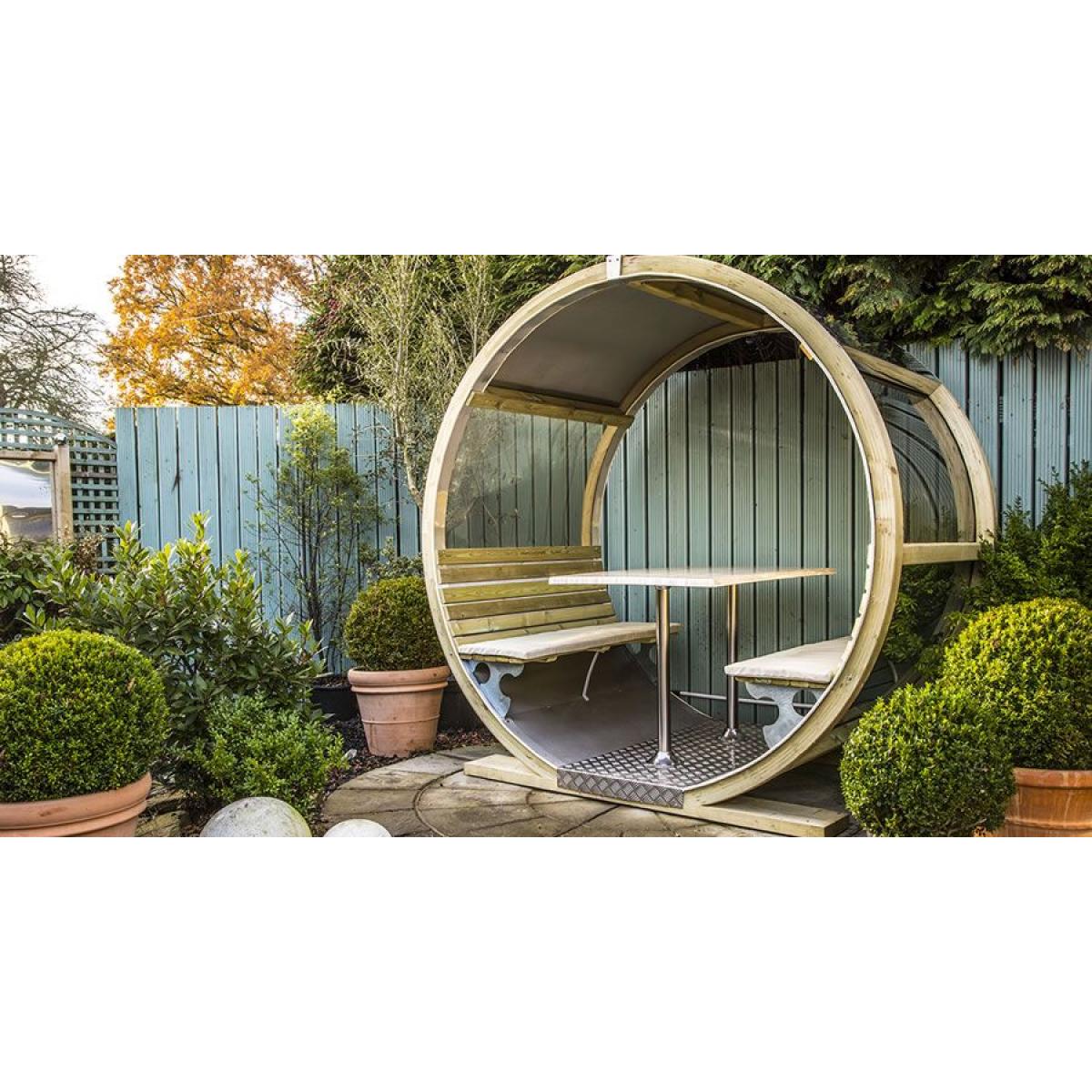 This unique shaped bench offers you plenty of shade and shelter. It is ideally designed to be placed against a wall, fence or as a stand-alone picnic bench. This means that this specially shaped seat can fit into many different alcoves of space in your garden when the available space in your garden might be a crucial factorBy mounting two pressure treated laminated timber circles opposite each other we have created a cylinder. An 800mm x 1200mm table was then fixed into the centre of the cylinder with two wooden seating sections either side. This leaves you with ample room for six people to be seated within. We have assembled this cylinder Wheel Bench using our signature parts of stainless steel, polycarbonate and timber. This unique shaped bench offers you plenty of shade and shelter. It is ideally designed to be placed against a wall, fence or as a stand alone picnic bench. This means that this specially shaped seat can fit into many different alcoves of space in your garden when the available space in your garden might be a crucial factor. Freedom to adapt... By placing two or more wheel benchs inline and adding a roof between each unit, we can create a multitude of different sized seating areas. This would be ideal for bars, restaurants and picnic areas and would offer many different ways to use the Wheel Bench in any outdoor area. All the parts of the Wheel Bench are manufactured from materials ideally suited to the outdoors. For extra comfort the Wheel Bench comes supplied with seat pads in a choice of 3 different colours; charcoal, green and burgundy. Dimensions:Height 218 x Width 220 x Depth 135cm Base Area: 170cm x 135cm Stainless steel roof to offer shade and reflect heat Four laminated treated sustainable spruce timber arcs Luxurious water resistant interior Seating capacity for up to six guests Fitted with removable table top A foot print of no more than a standard garden patio set. Installation - An area of 230cm x 145cm is required for the Wheel Bench to be installed. A hard base of no less than 175cm x 140cm is preferred to build your bench onto. The Wheel Bench should be installed onto an area of flat level ground. Ground Preparation - If you are preparing new concrete or paving area for your Wheel Bench, we recommend on an overall depth of 30cm allowing 7 days for the ground to settle prior to the arrival of our fitting team.