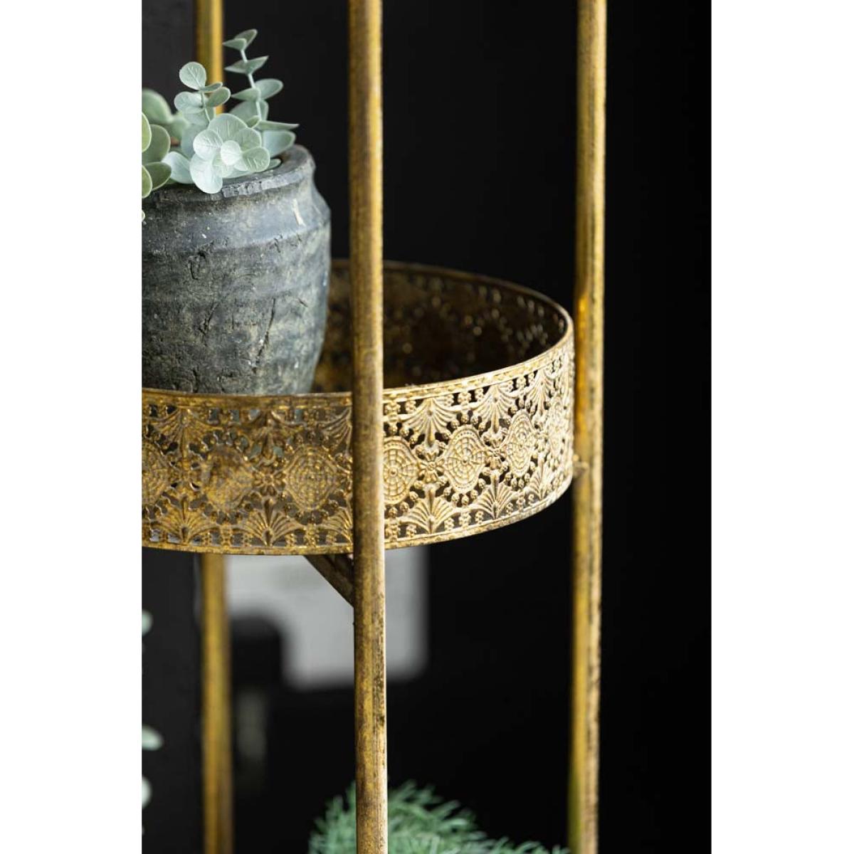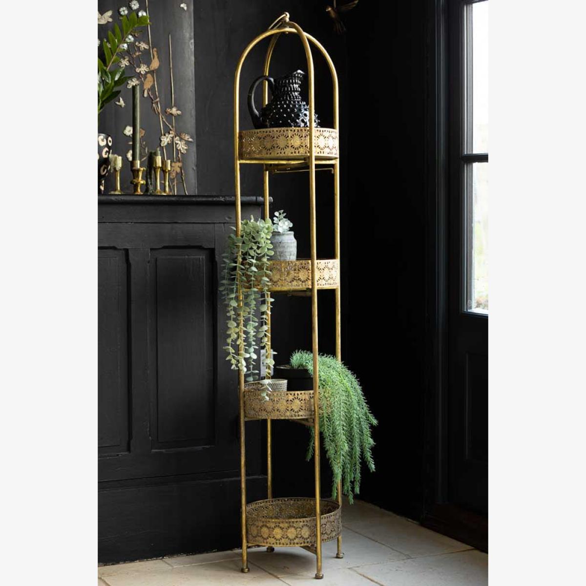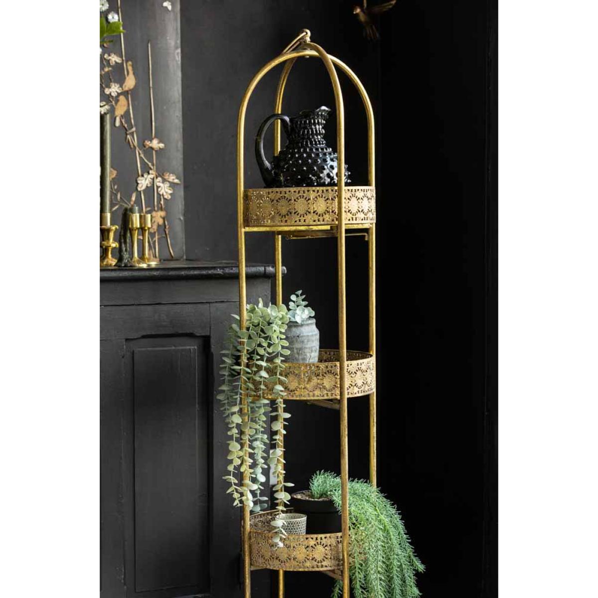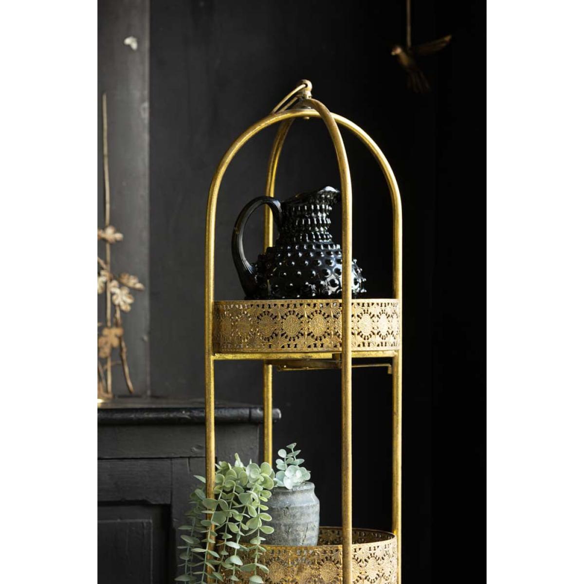 About The Ornate Gold Tall Tray Shelves The Ornate Gold Tall Tray Shelves remind us of a lavish vintage concierge trolley. We love the delicate detail on each level, and the birdcage top gives the item a unique edge. We want to put these shelves in our garden room or the corner of the living room to add luxury to the plant display! Why We Think You'll Love The Gold Tray Shelves The gorgeous detail of each tray draws the eye and results in a stunning vintage style piece. The height of the Gold Tray Shelves gives lots of options for what to place on each shelf, whether plants, ornaments, or glassware.